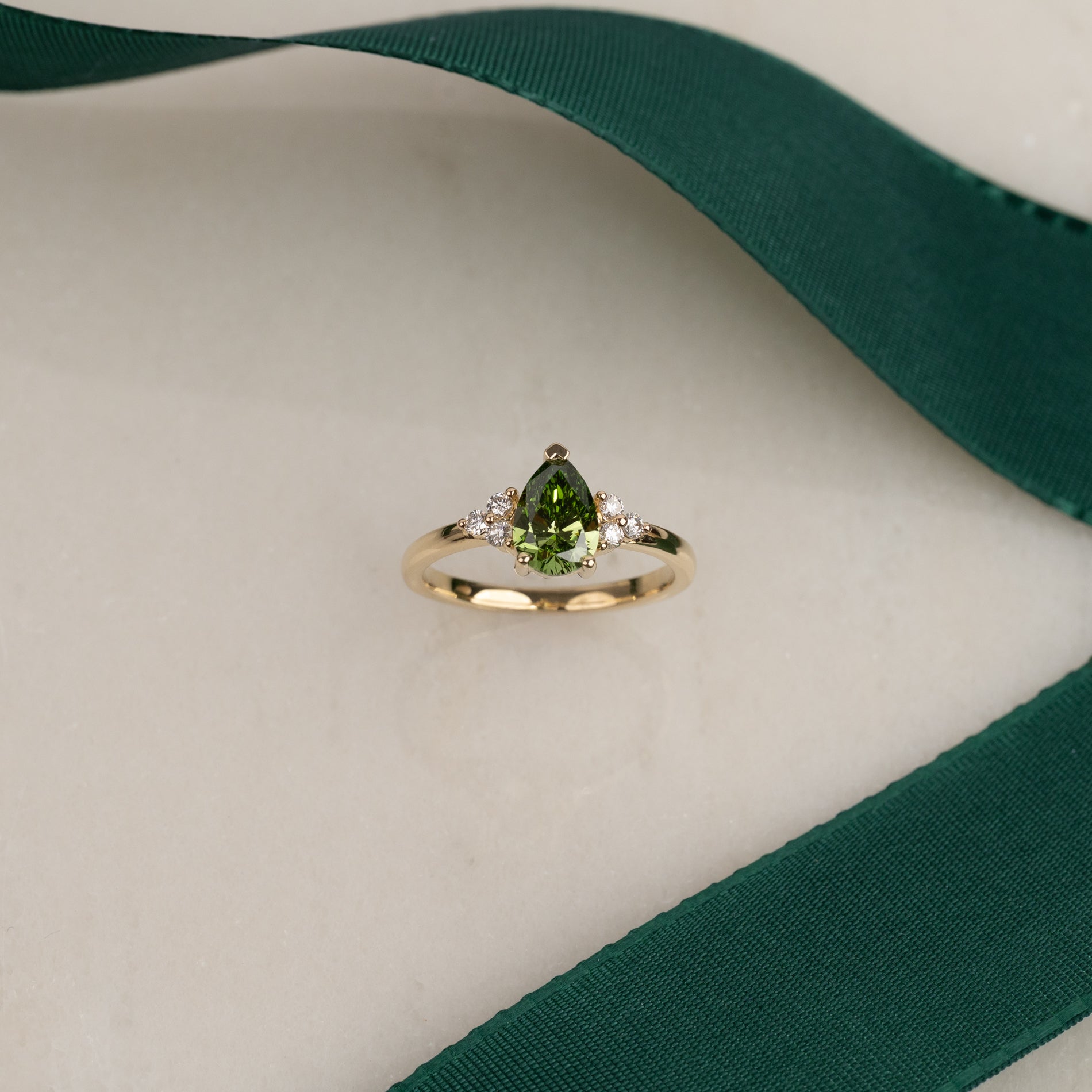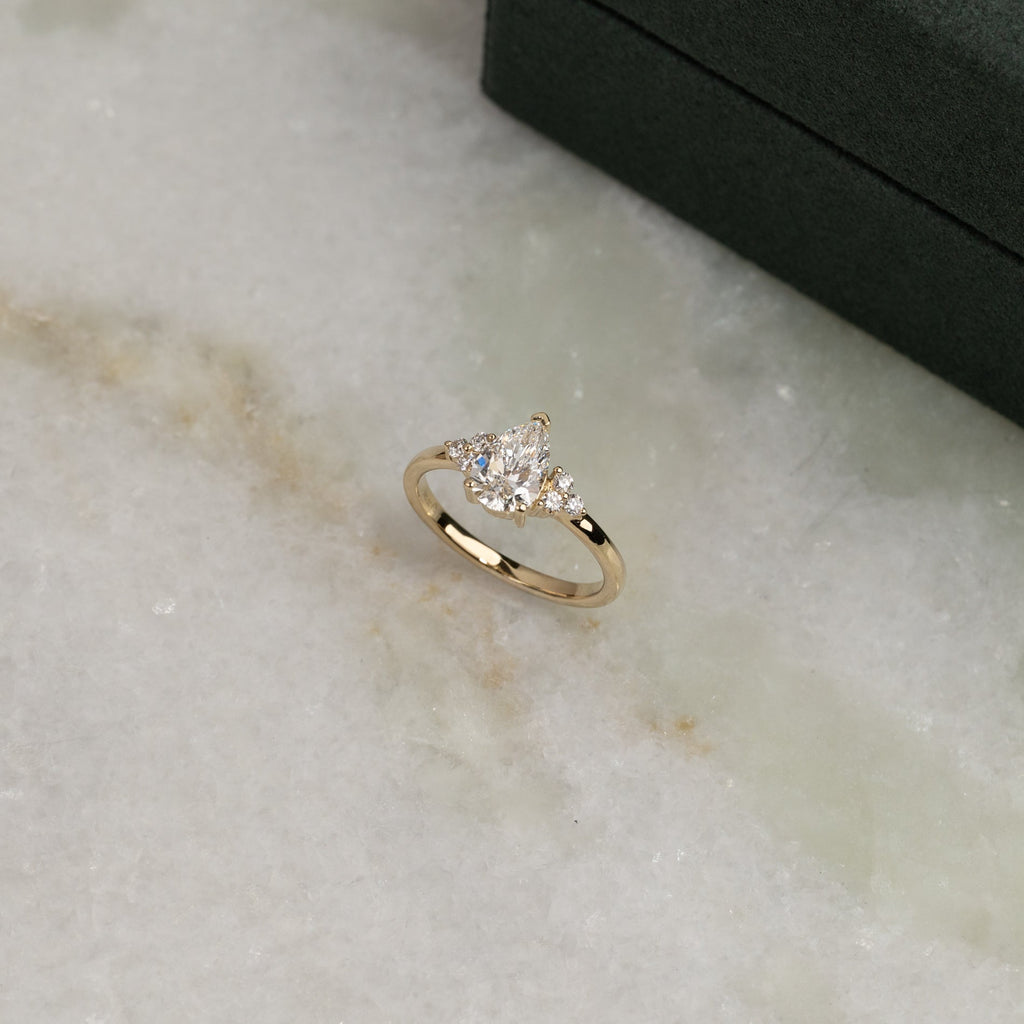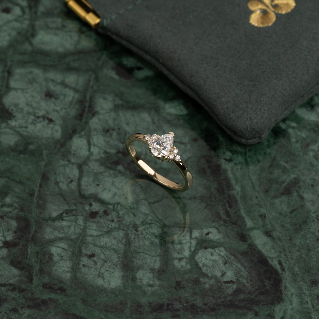 Ringen är tillverkad i 14 kt. guld med en pear-cut labbodlad diamant i färg E–F (River) och klarhet VVS. Smycket är skapat med omtanke; diamanterna är bland annat producerade med solenergi, och guldet är 100 % certifierat återvunnet.