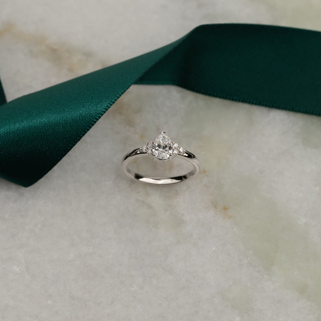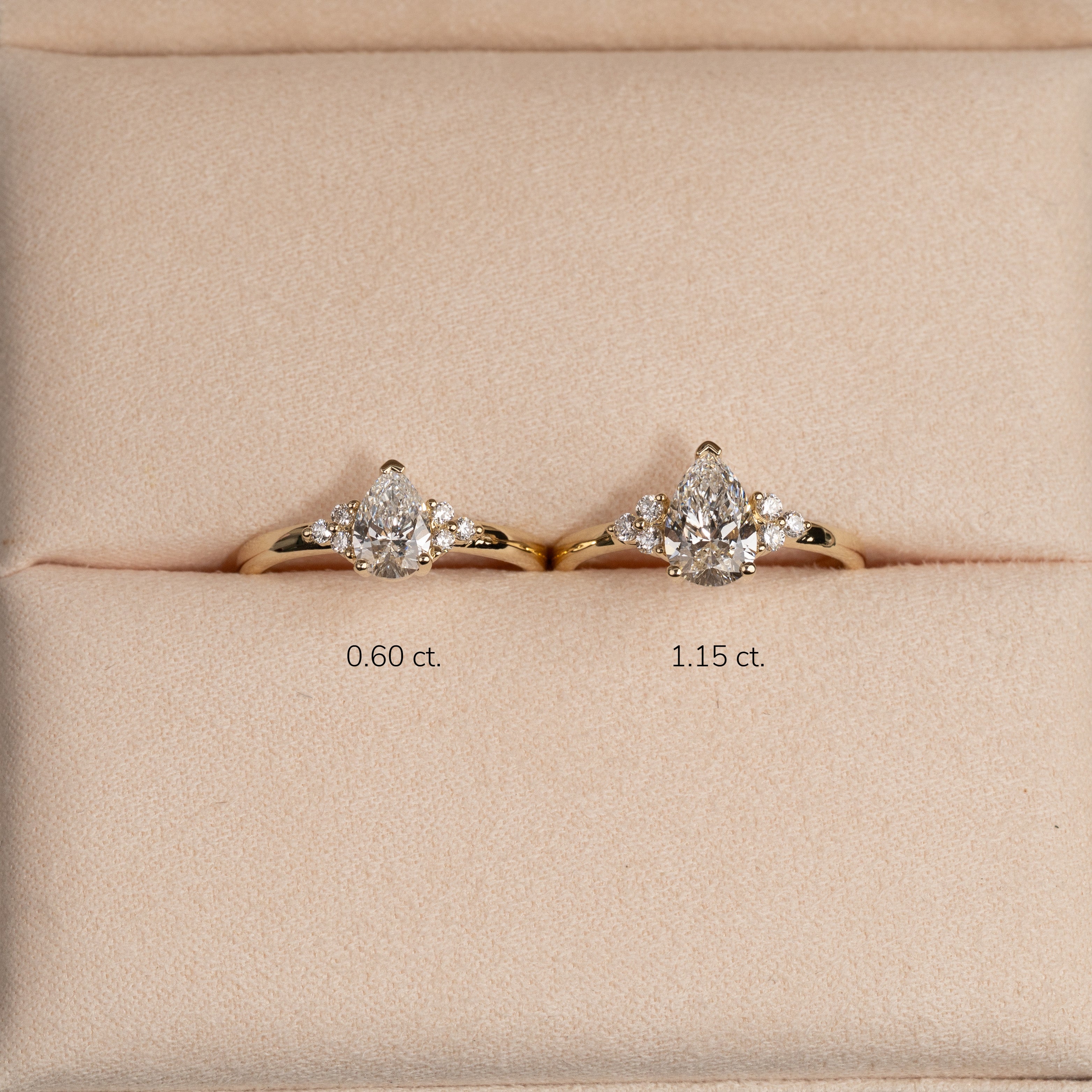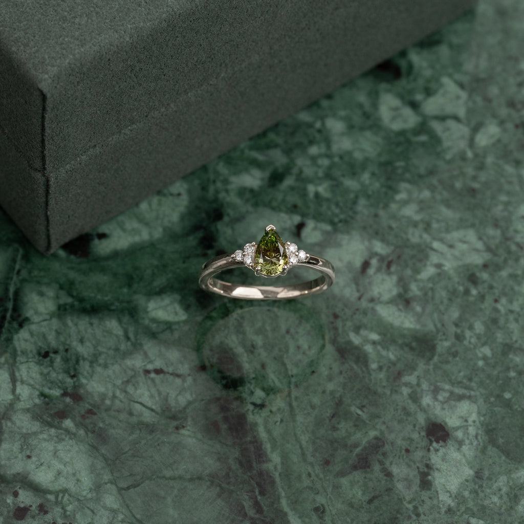 Ringen är tillverkad i 14 kt. guld med en pear-cut labbodlad diamant i färg E–F (River) och klarhet VVS. Smycket är skapat med omtanke; diamanterna är bland annat producerade med solenergi, och guldet är 100 % certifierat återvunnet.