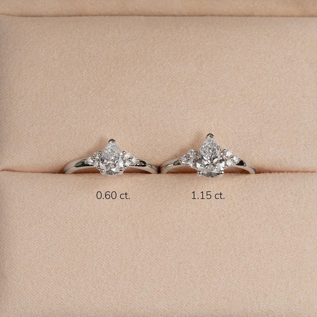 Ringen är tillverkad i 14 kt. vitguld med en 0,6 ct pear-cut labbodlad diamant i färg E–F (River) och klarhet VVS. Smycket är skapat med omtanke; diamanterna är bland annat producerade med solenergi, och guldet är 100 % certifierat återvunnet.
