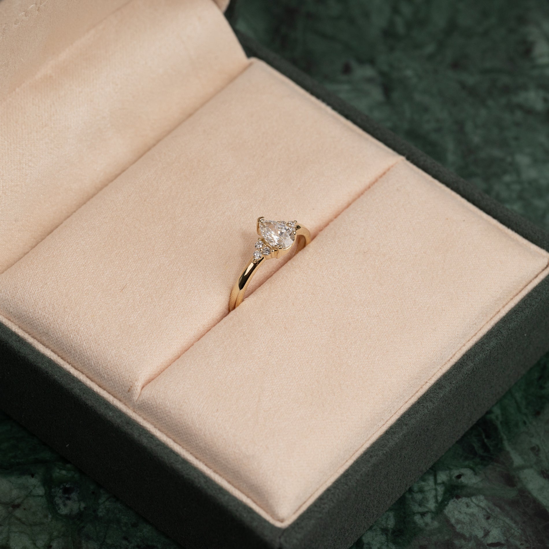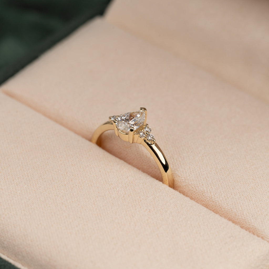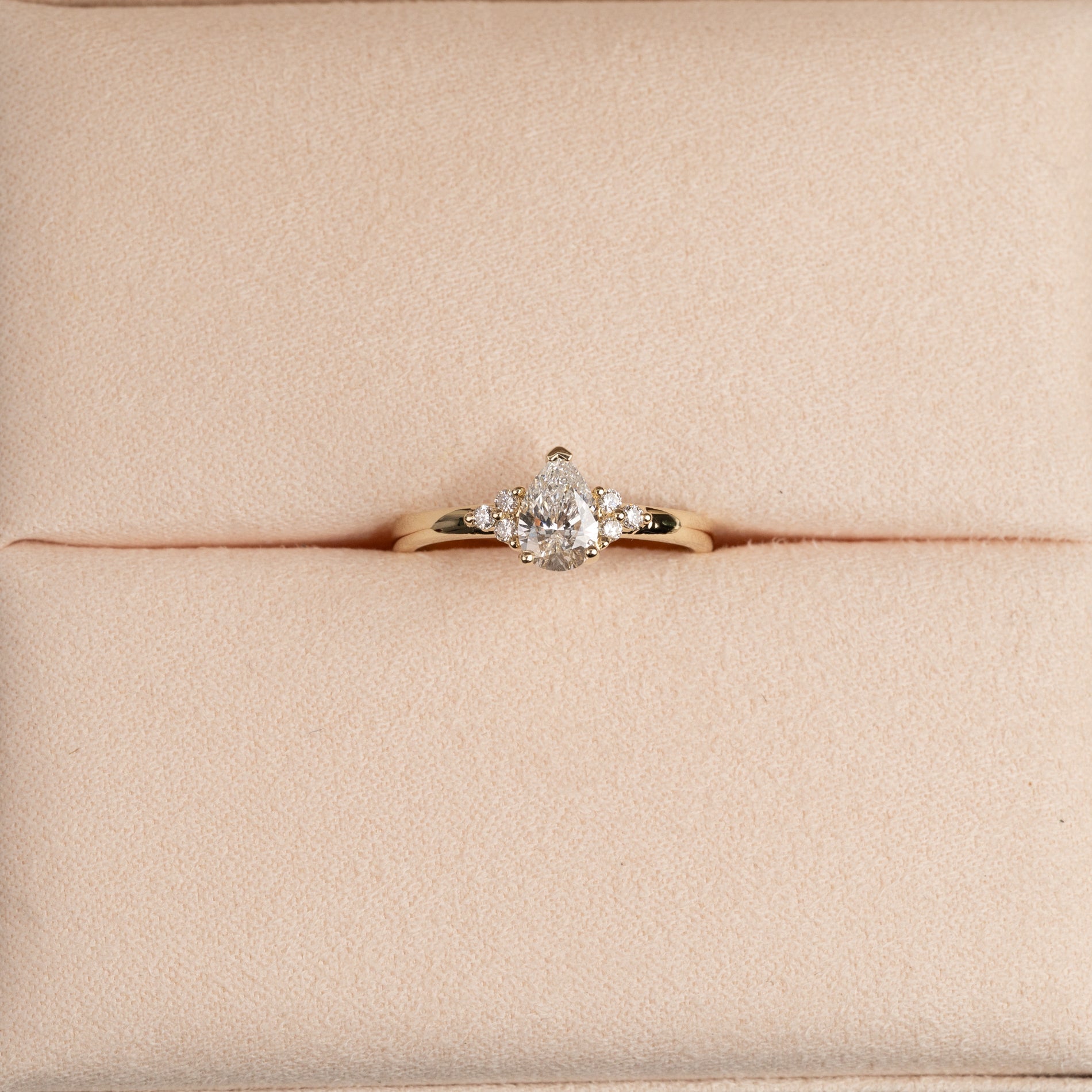 Ringen är tillverkad i 14 kt. guld med en 0,6 ct pear-cut labbodlad diamant i färg E–F (River) och klarheten VVS. Smycket är skapat med omtanke; diamanterna är bland annat producerade med solenergi, och guldet är 100% certifierat återvunnet.