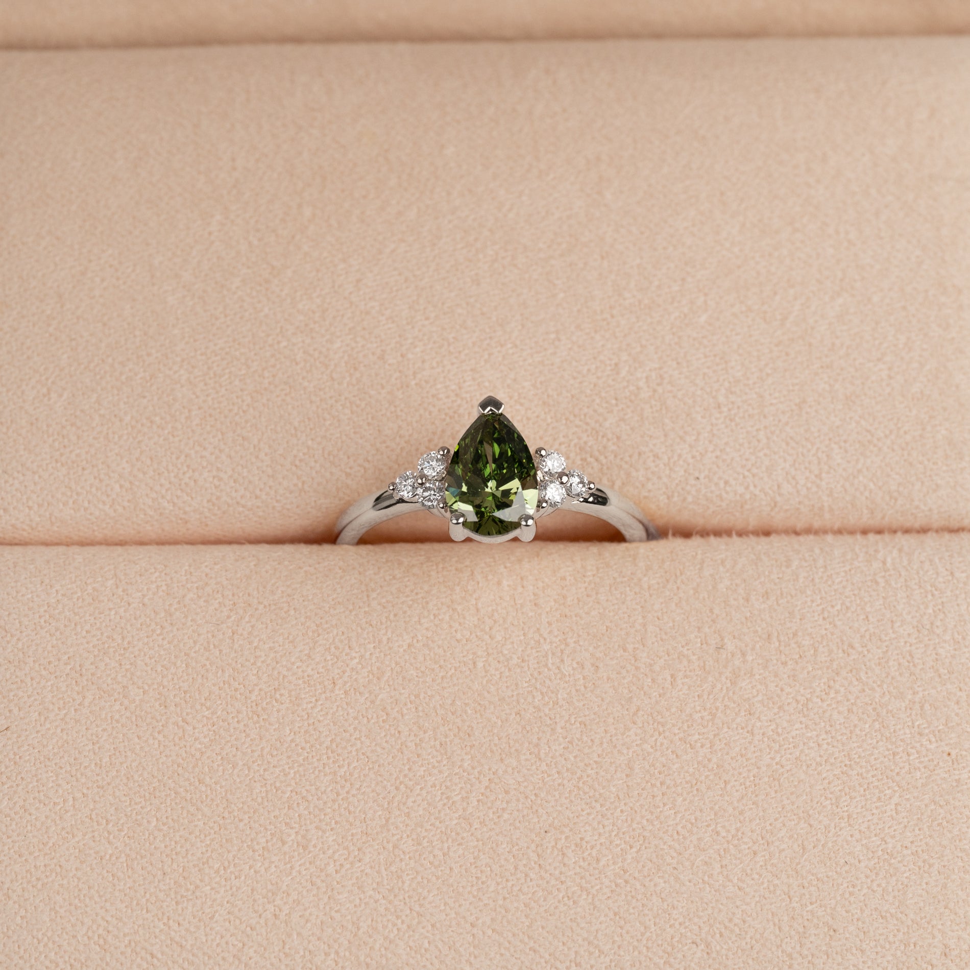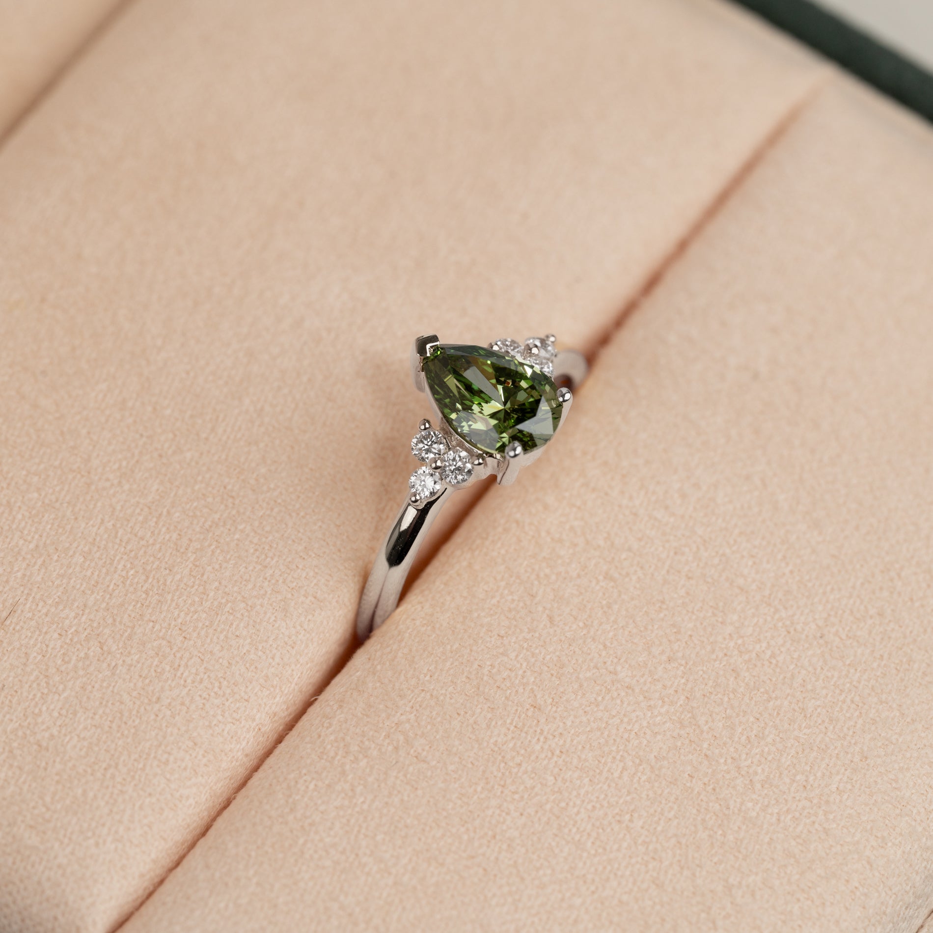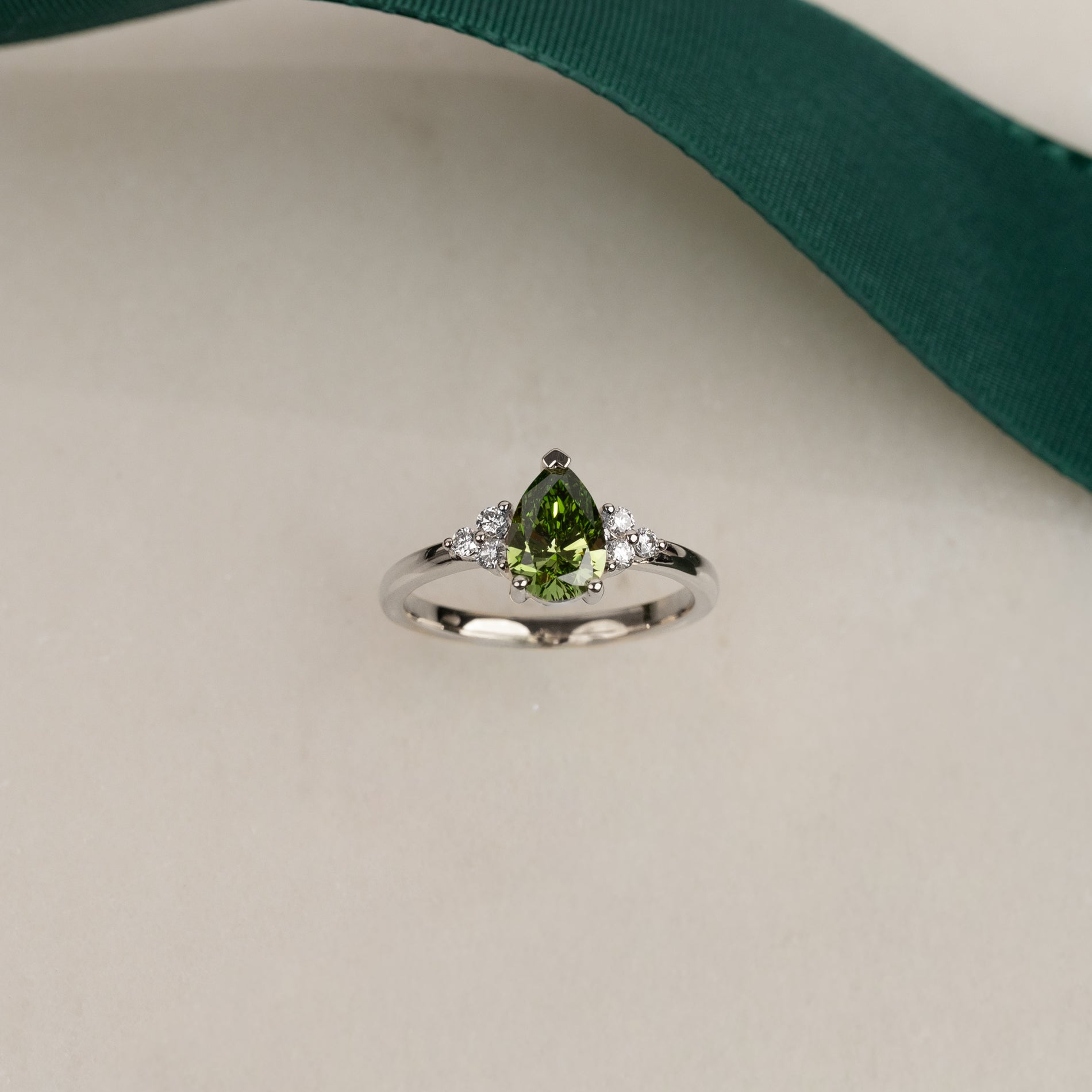 Ringen är tillverkad i 14 karat vitguld med en 1,0 ct pear-cut labbodlad diamant i en vacker "fancy green" färg och klarhet VVS. Smycket är skapat med omtanke; diamanterna är bland annat producerade med solenergi, och guldet är 100% certifierat återvunnet.