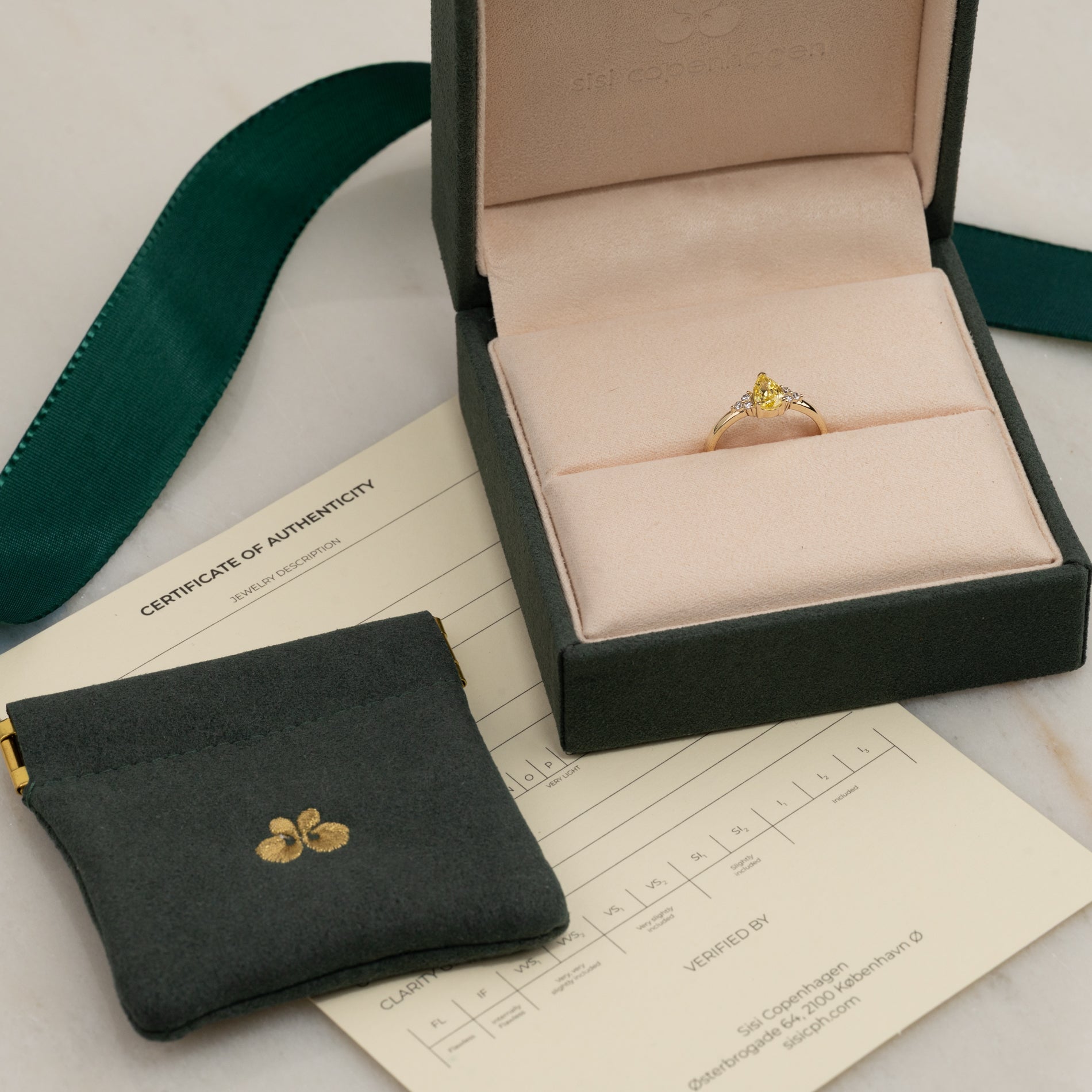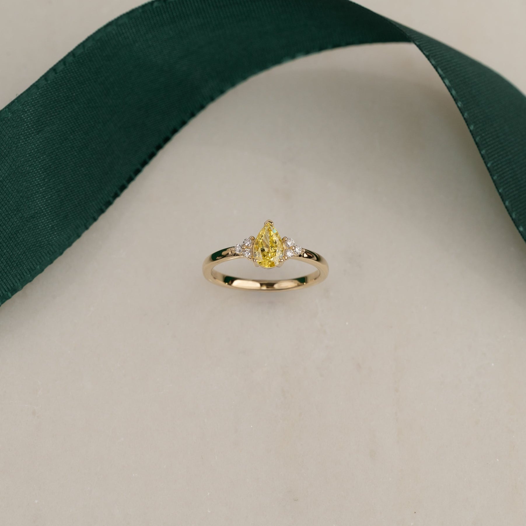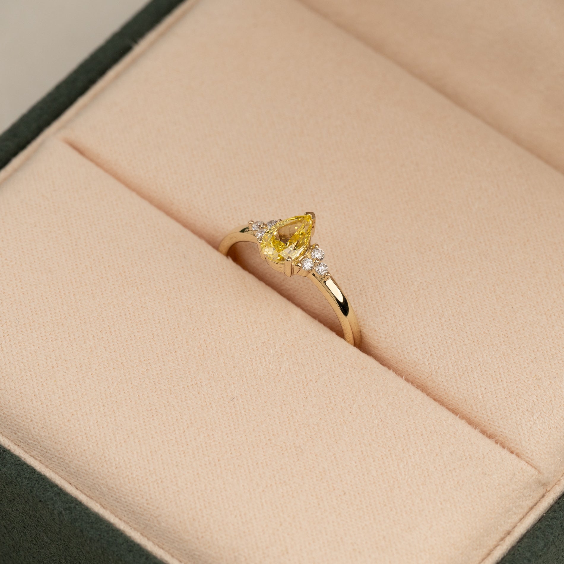 Diamanten är labbodlad med slipningen pear-cut i färgen Fancy Intense Yellow och klarheten VVS. Diamanten är framställd med bland annat solenergi, och guldet är 100% certifierat återvunnet.