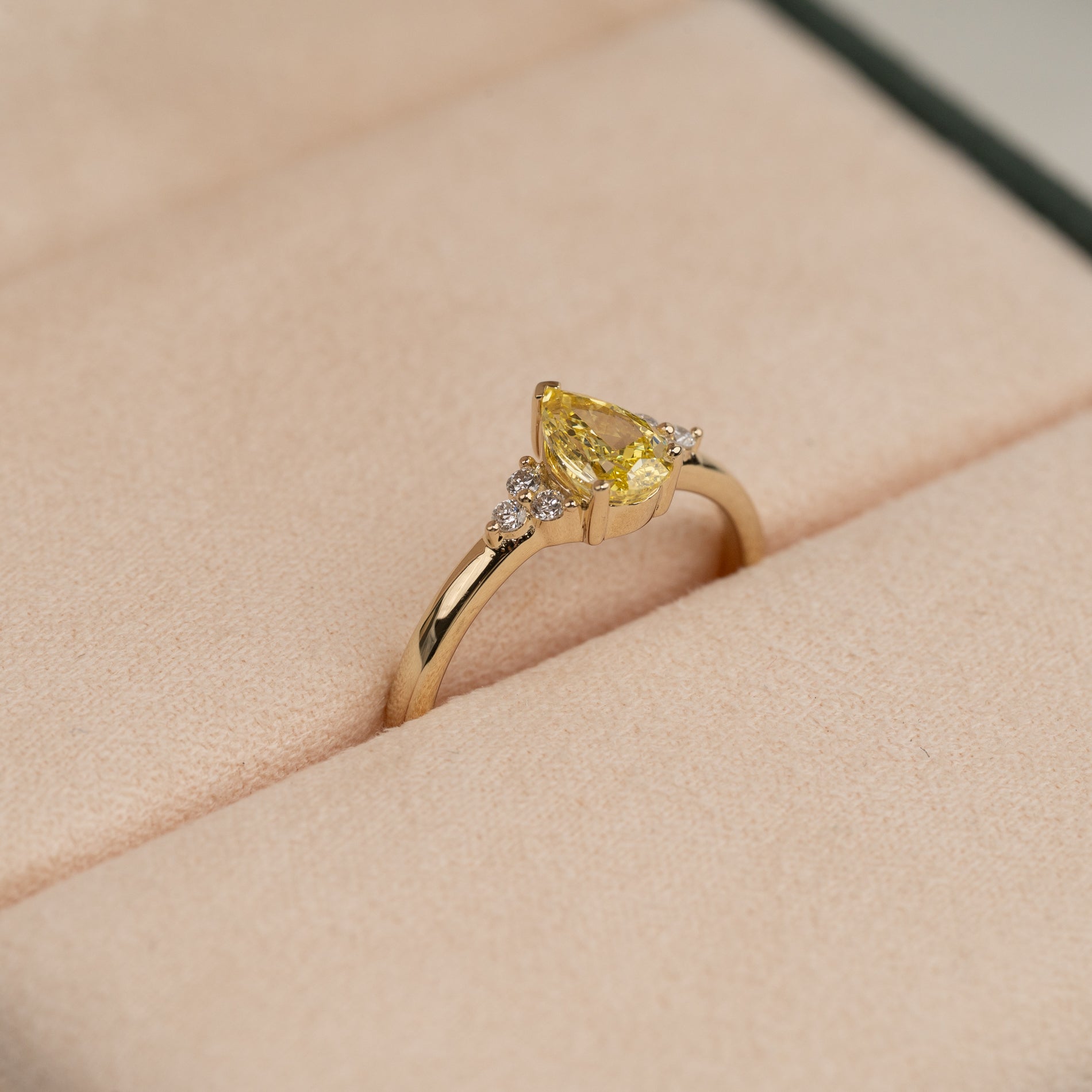 Pear-cut diamantring med en 0.6 ct. gul labbodlad diamant och klara sidostenar