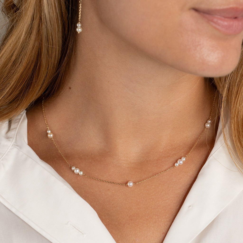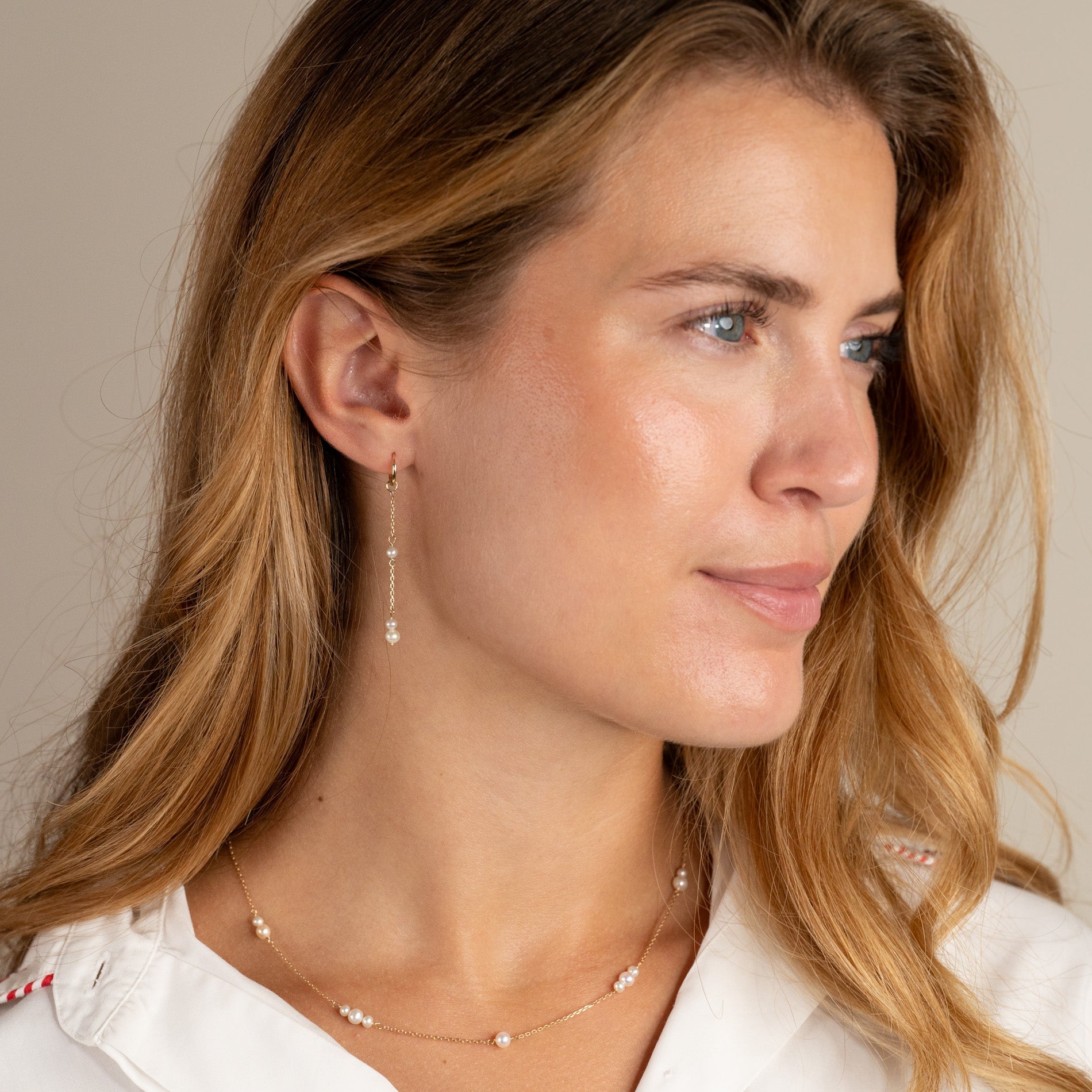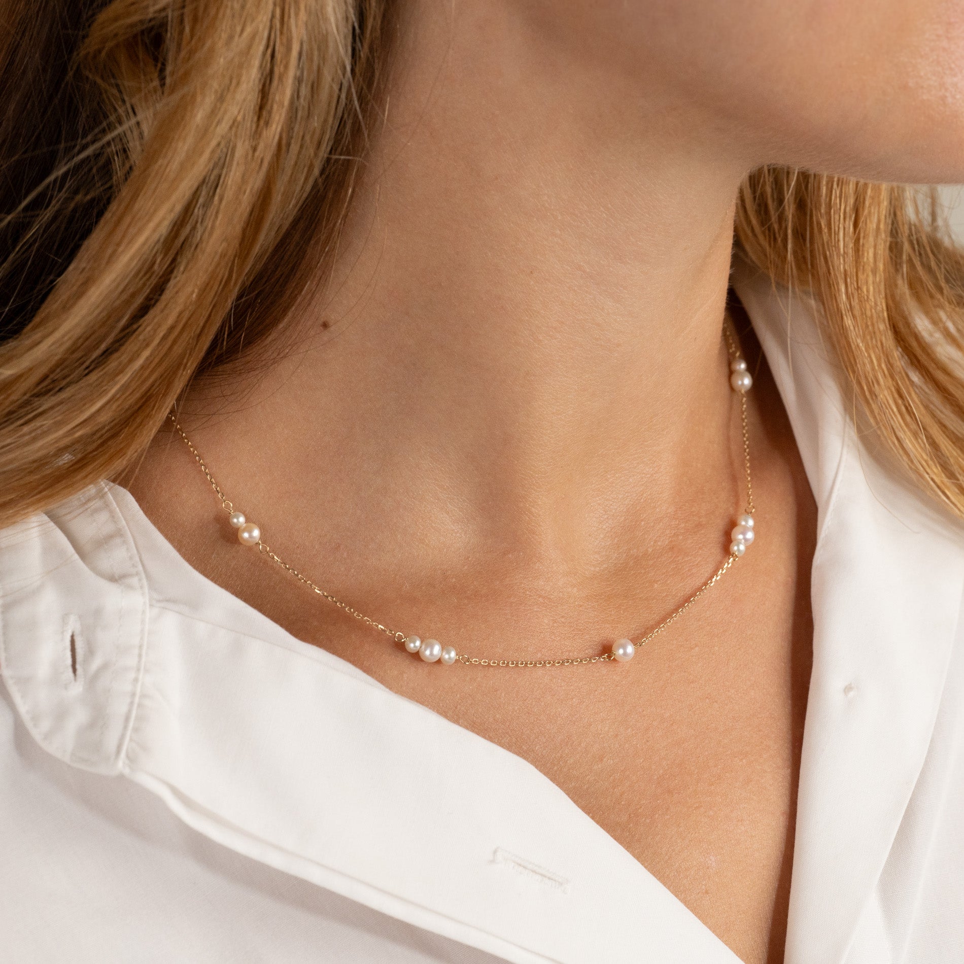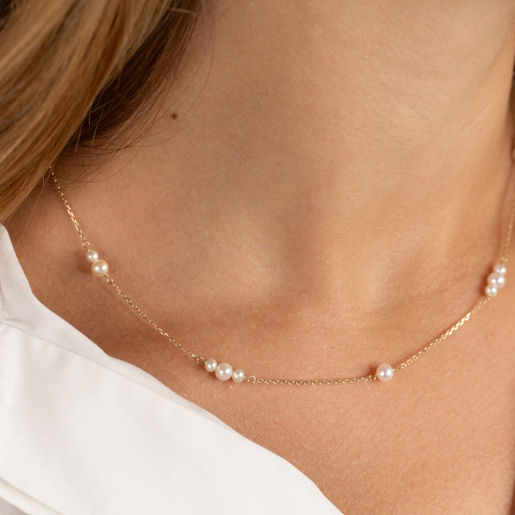 Halsband i 100% återvunnet 9 kt. massivt guld med små ovala vita sötvattenspärlor.
