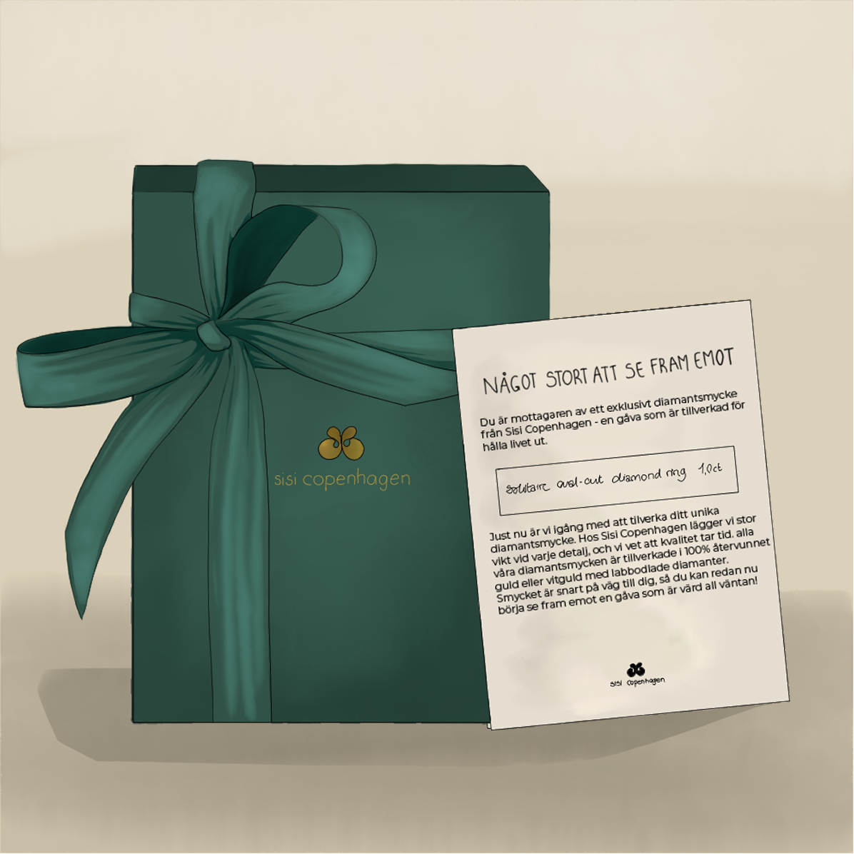 Vi erbjuder en fin lösning: Vi skickar den vackra presentboxen i förväg, fint inslagen, men utan smycket. Tillsammans med boxen skickar vi med ett kort som berättar för den lyckliga mottagaren vad de har att se fram emot. Så snart smycket är färdigt skickas det separat i vår fina smyckesask tillsammans med certifikatet. På så sätt kan du ge en oförglömlig gåva, även om smycket inte är klart på den speciella dagen.