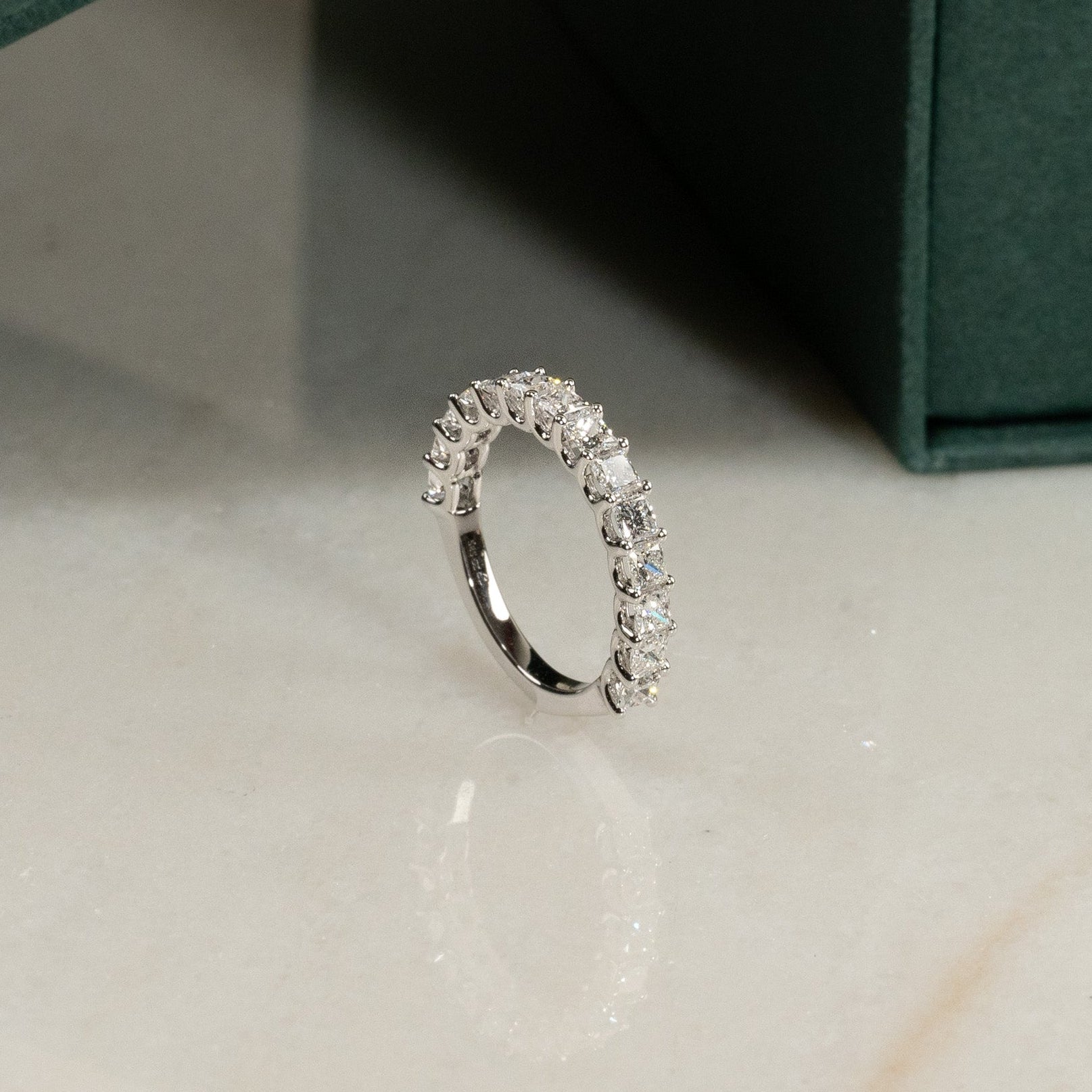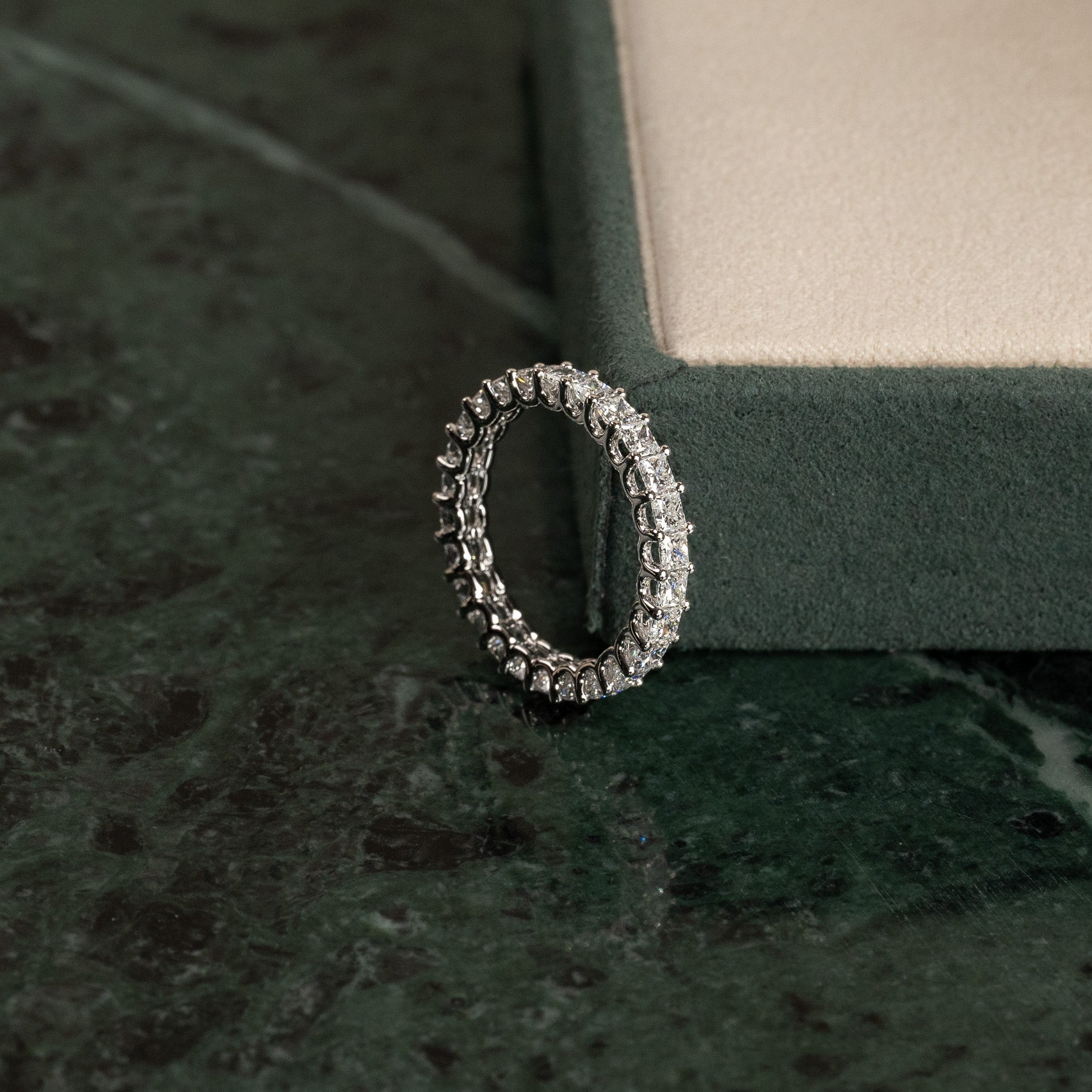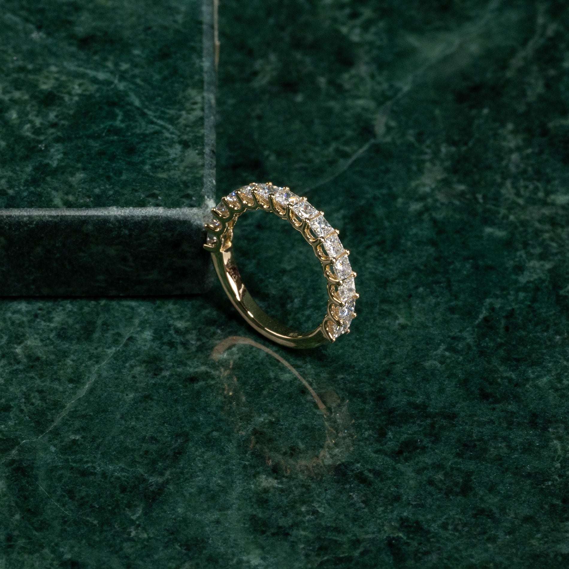 Alliansringen är skapad med princess-cut labbodlade diamanter.