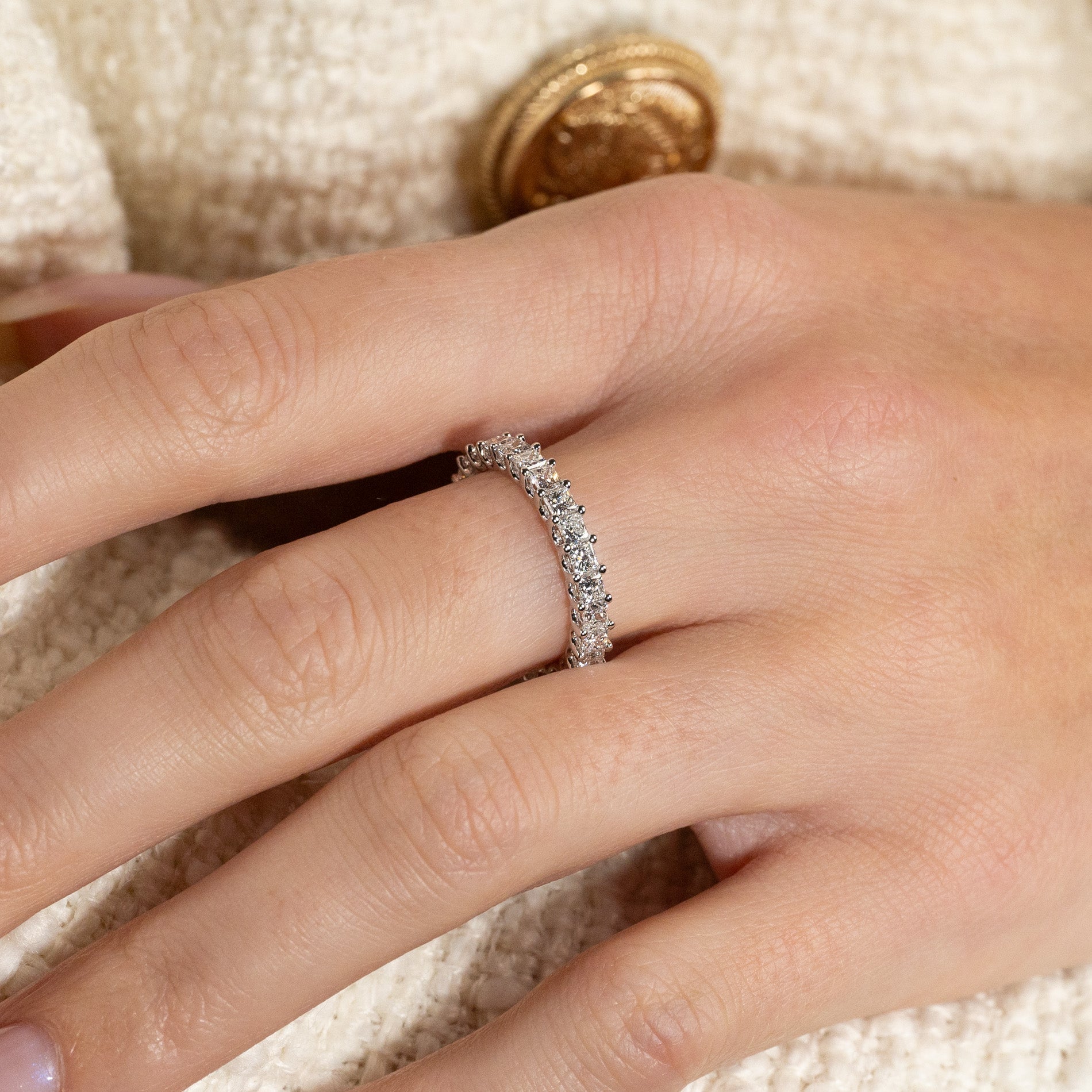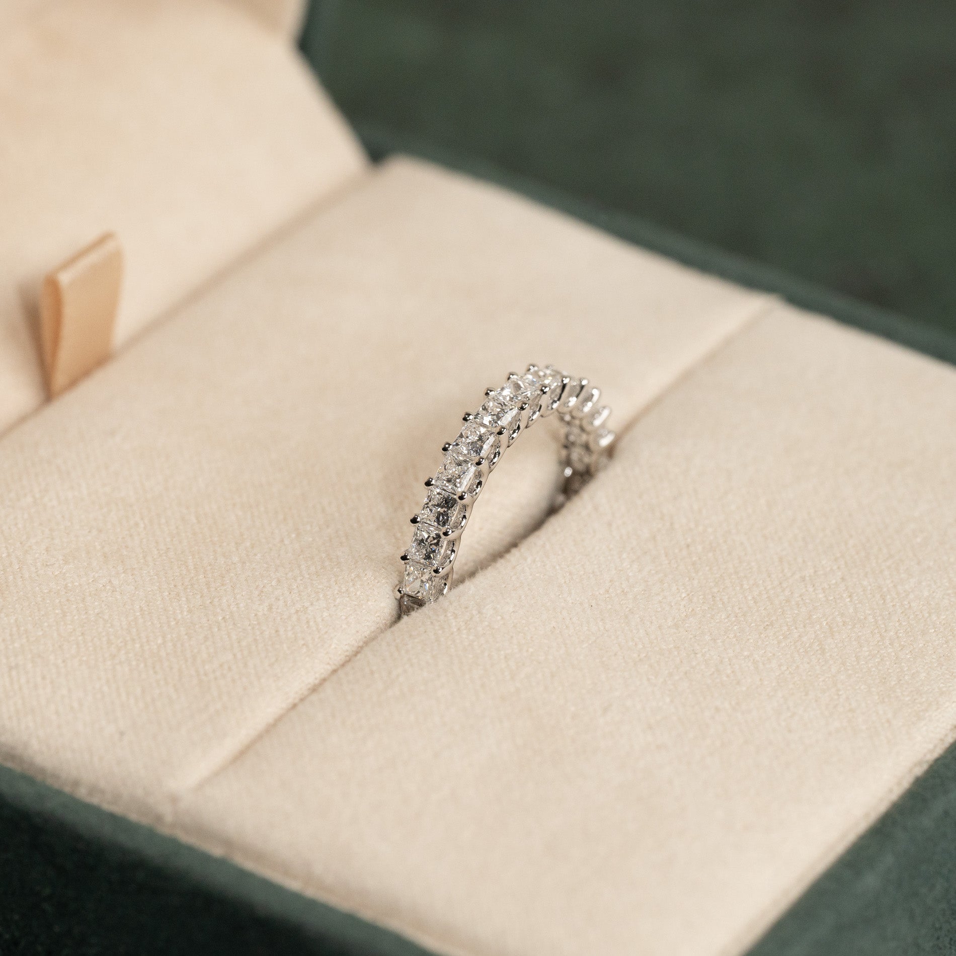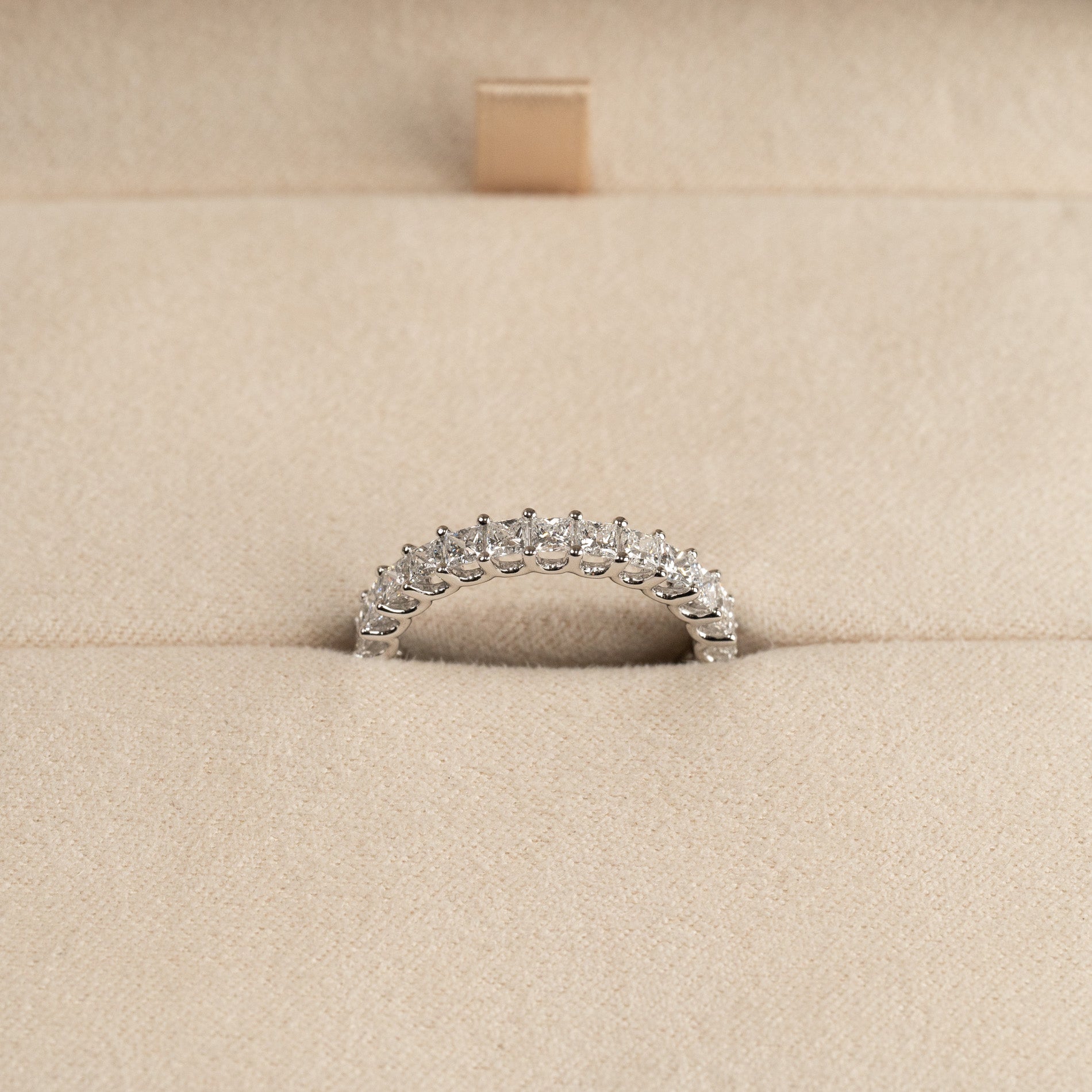 Alliansring i 14 kt vitguld med 2,0 ct labbodlade princess-cut diamanter. Denna eleganta alliansring är tillverkad i 14 kt vitguld och prydd med 27 labbodlade princess-cut diamanter med en totalvikt på 2,0 ct, som löper längs hela ringskenan.