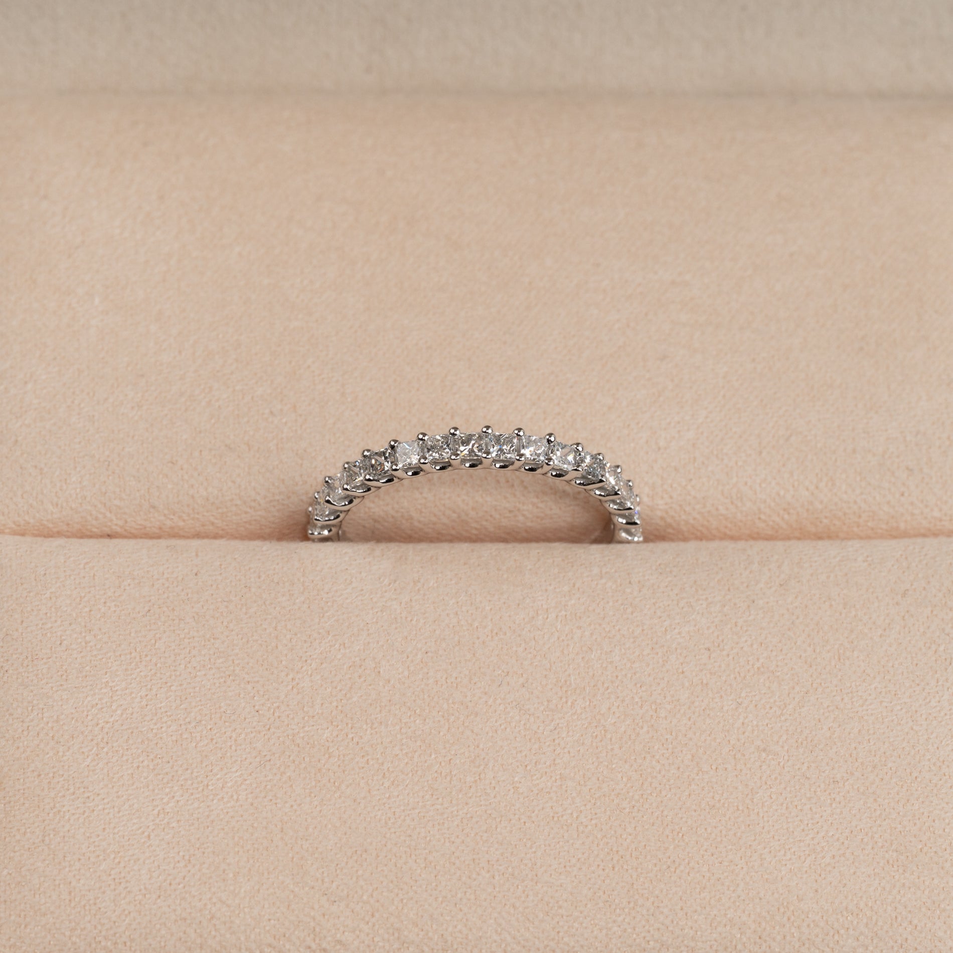 Halvalliansring i 14 kt vitguld med 0,5 ct labbodlade princess-cut diamanter. Denna eleganta halvalliansring är tillverkad i 14 kt vitguld och prydd med 17 labbodlade princess-cut diamanter med en totalvikt på 0,5 ct, som löper längs den övre halvan av ringskenan.