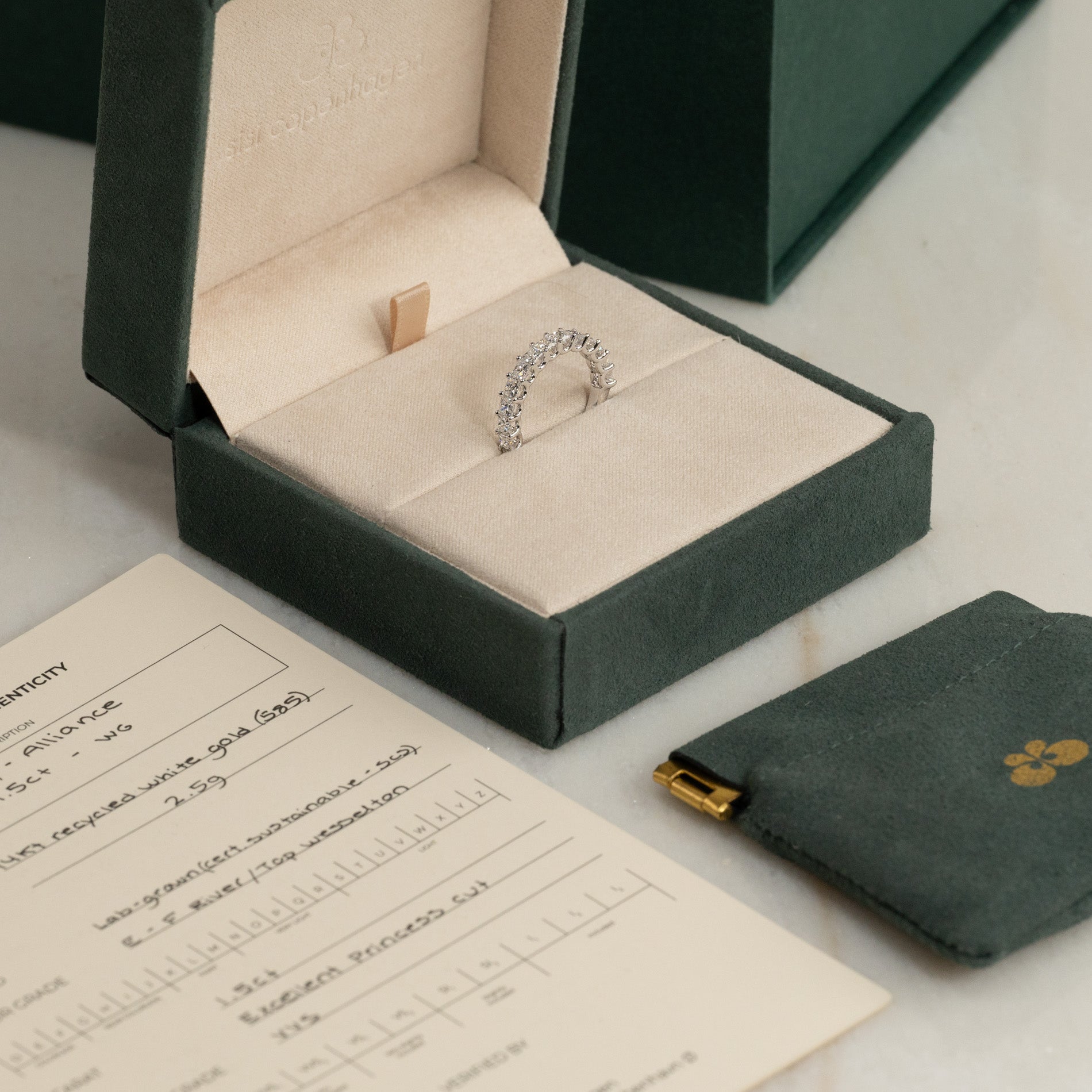 Diamanterna har färgen E/F (River) och klarheten VVS. Smycket är skapat med omtanke; diamanterna är producerade med bland annat solenergi, och guldet är 100% certifierat återvunnet.