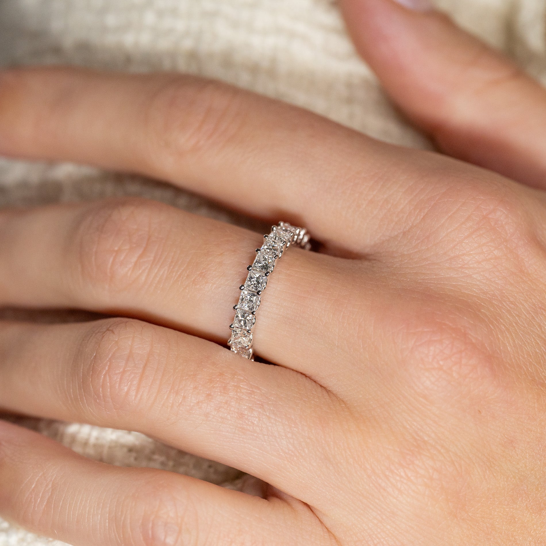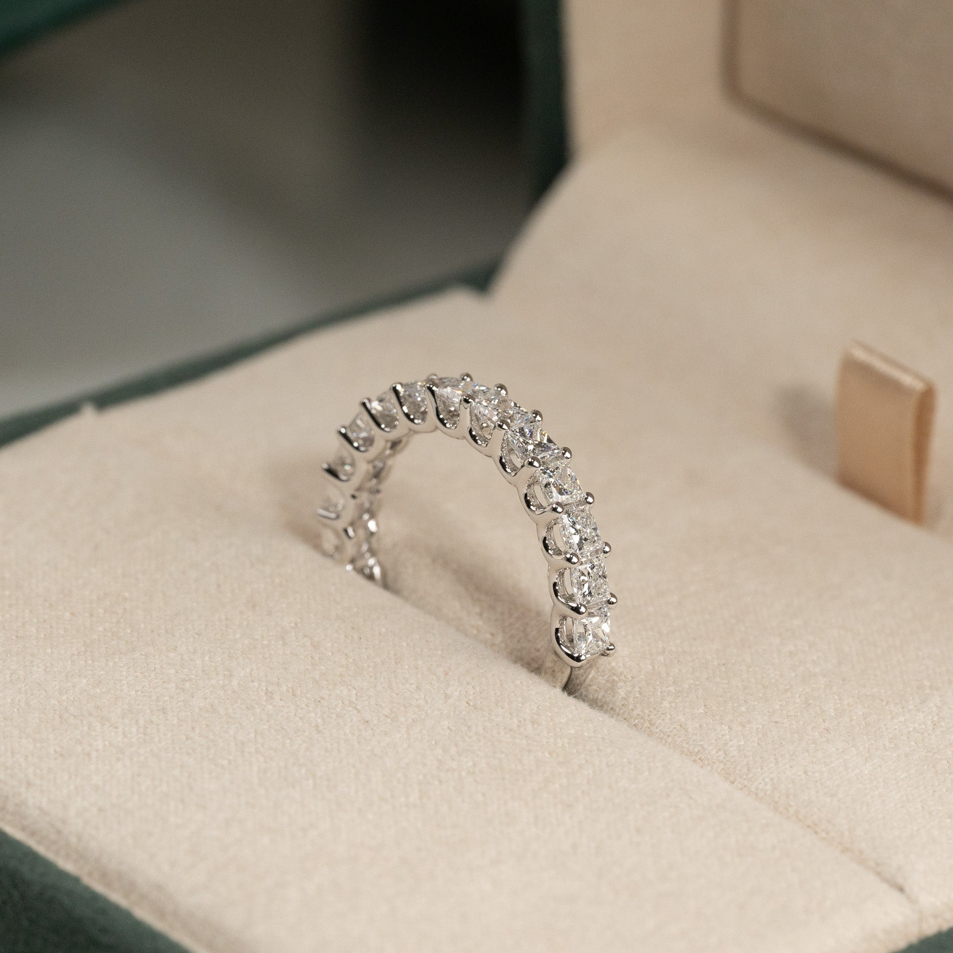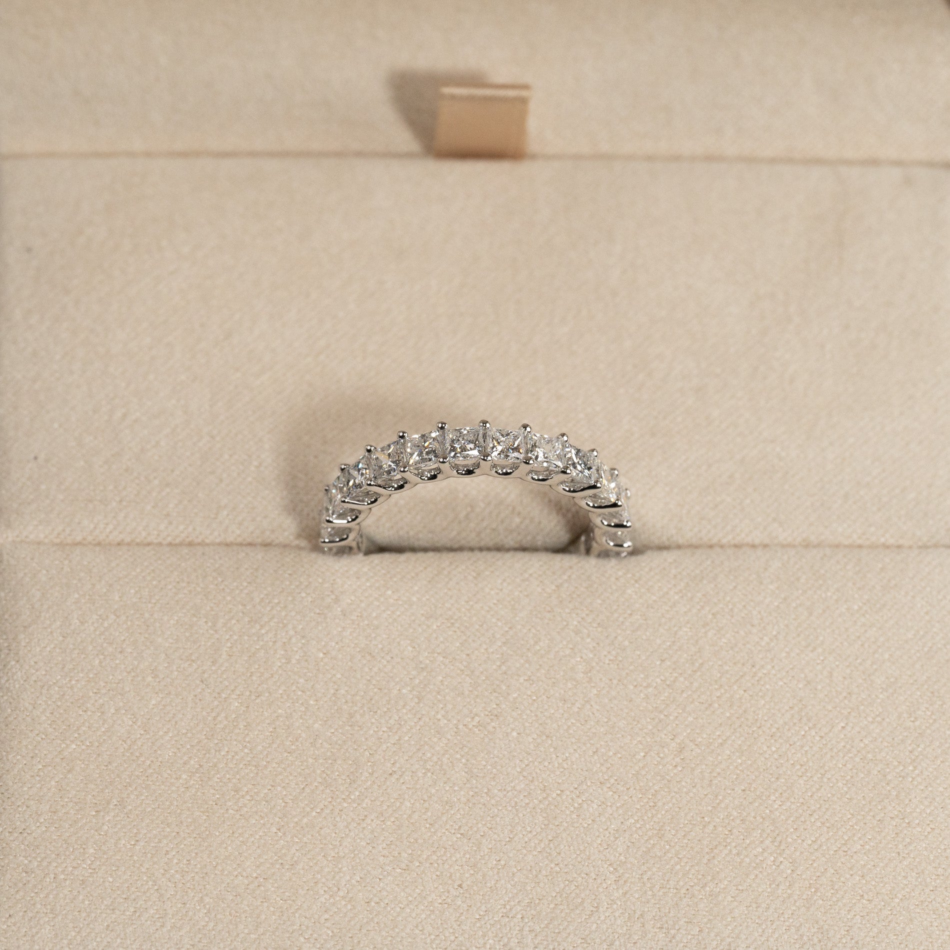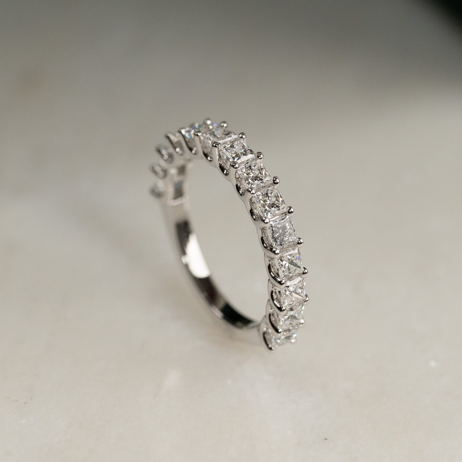 Halvalliansring i 14 kt vitguld med 1,5 ct labbodlade princess-cut diamanter. Denna eleganta halvalliansring är tillverkad i 14 kt vitguld och prydd med 14 princess-cut labbodlade diamanter med en totalvikt på 1,5 ct, placerade längs den övre halvan av ringskenan.
