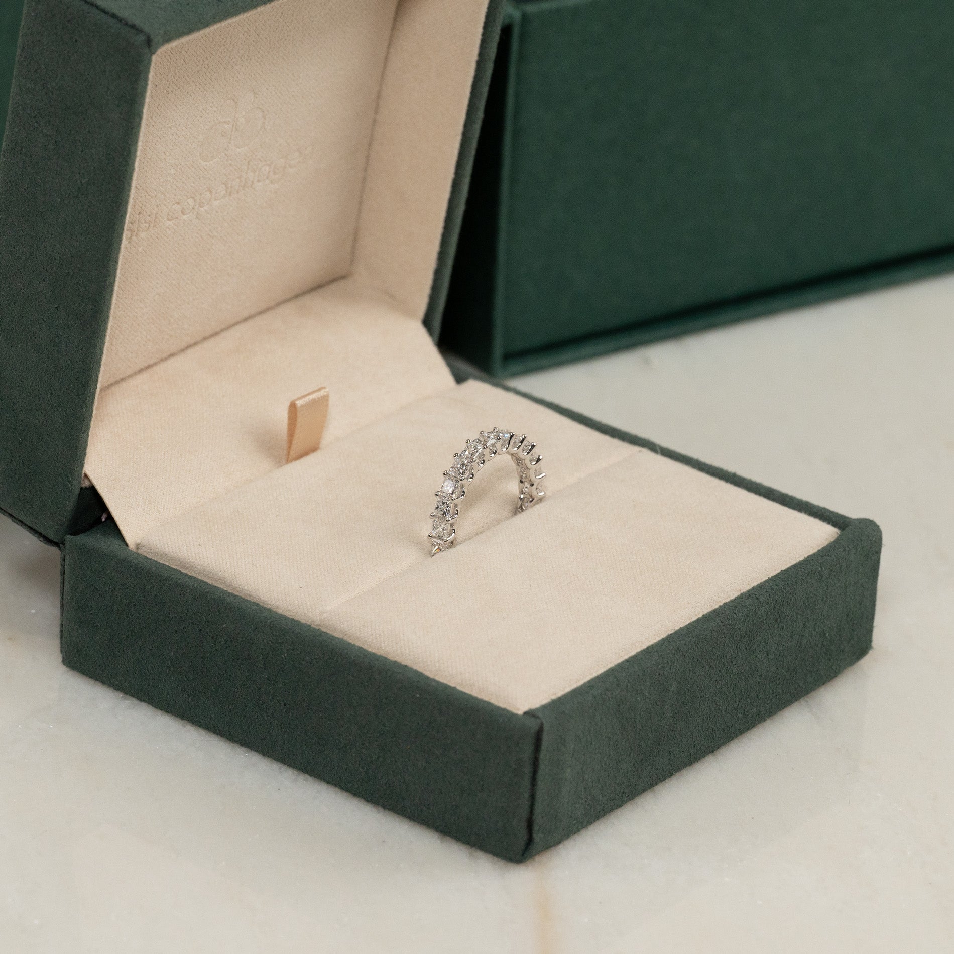 Smycket är vackert och säkert placerat i en smyckeskrin som är klädd i veganskt mocka.