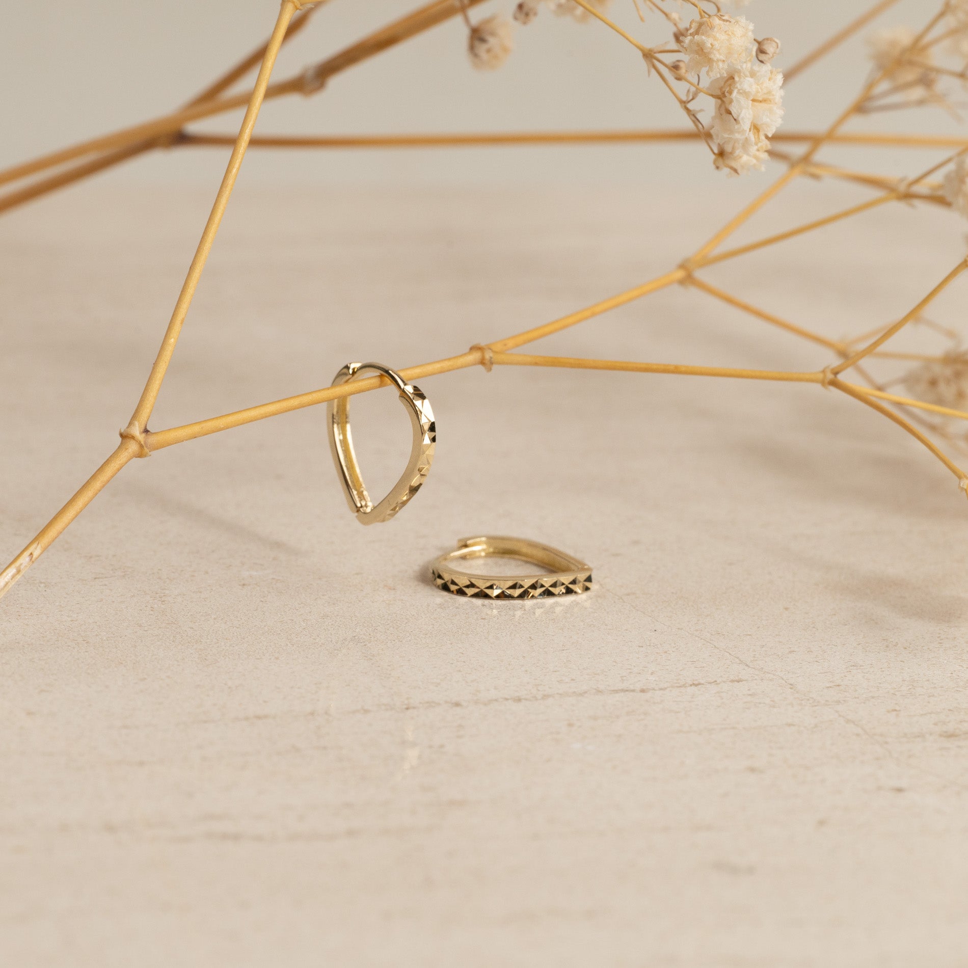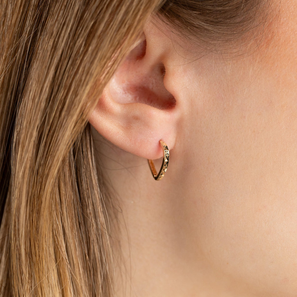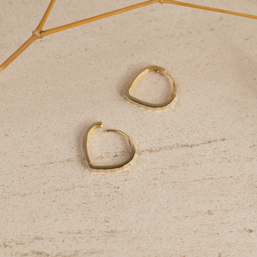 Creoler i 100 % återvunnet 9 karat guld. Dessa creoler har en lätt organisk hjärtformad design med en facetterad (diamond-cut) yta som tillför struktur och eleganta detaljer till örhängena.