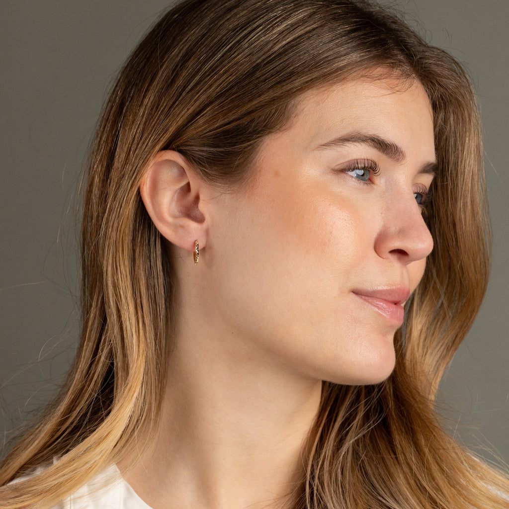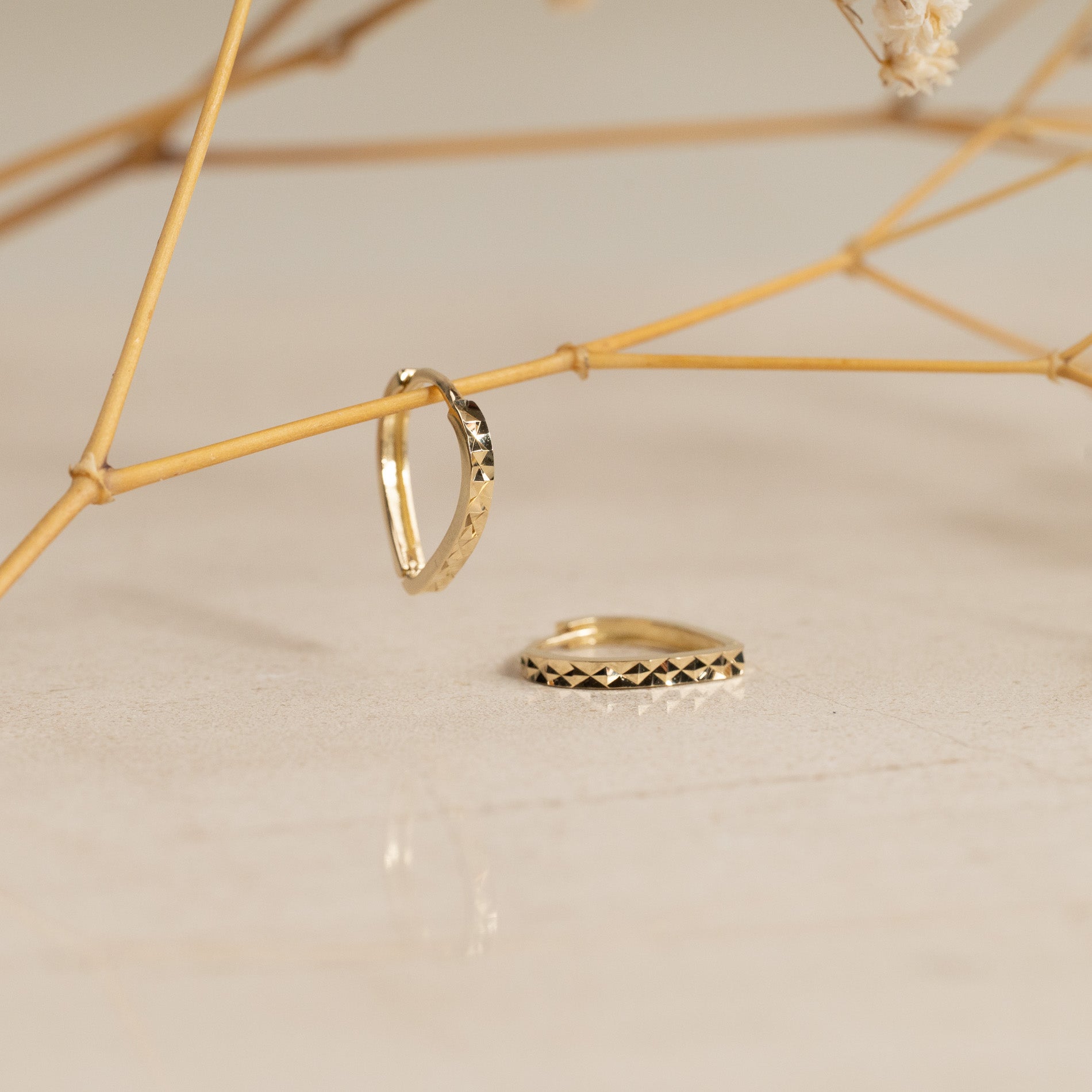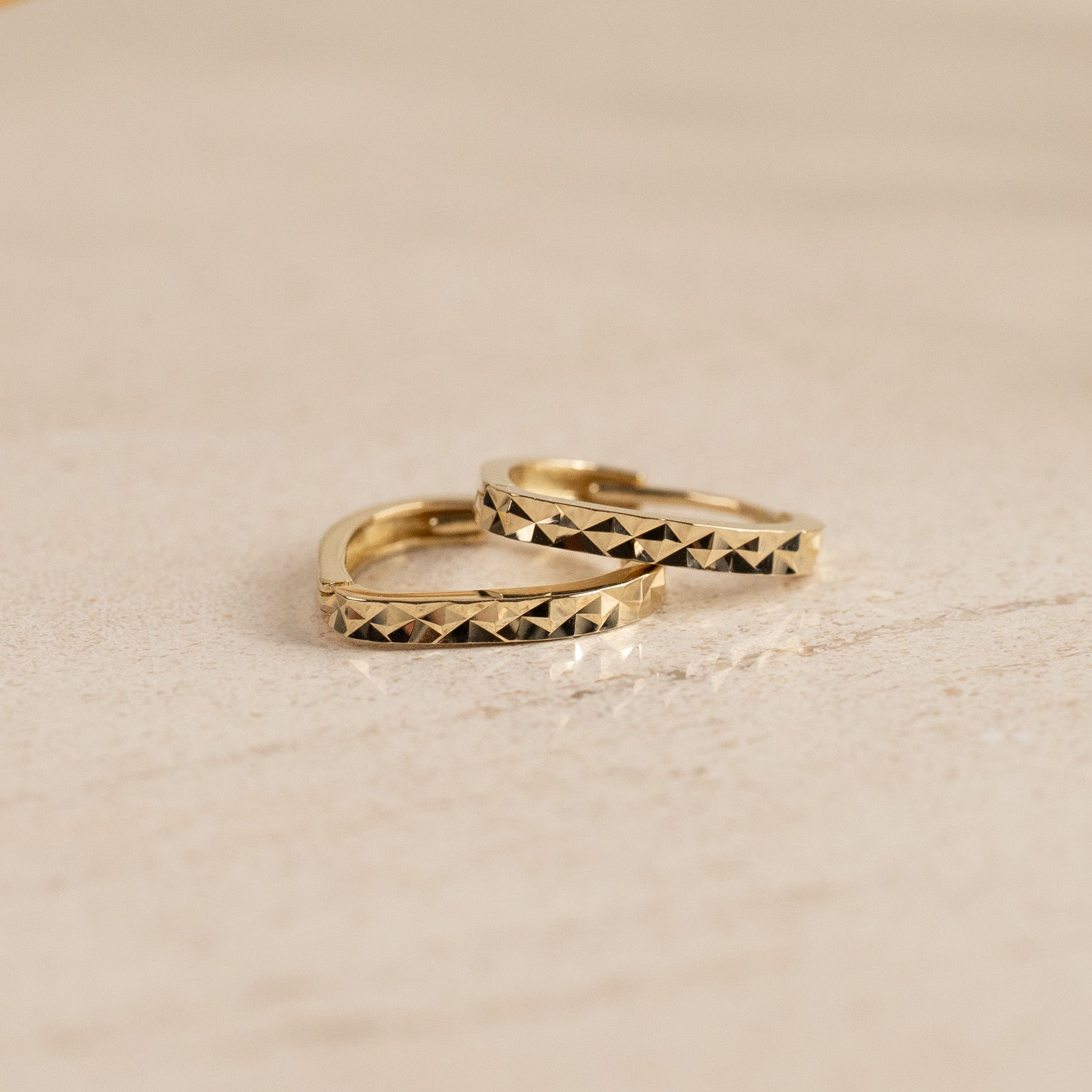 Creoler i 100 % återvunnet 9 karat guld. Dessa creoler har en lätt organisk hjärtformad design med en facetterad (diamond-cut) yta som tillför struktur och eleganta detaljer till örhängena.