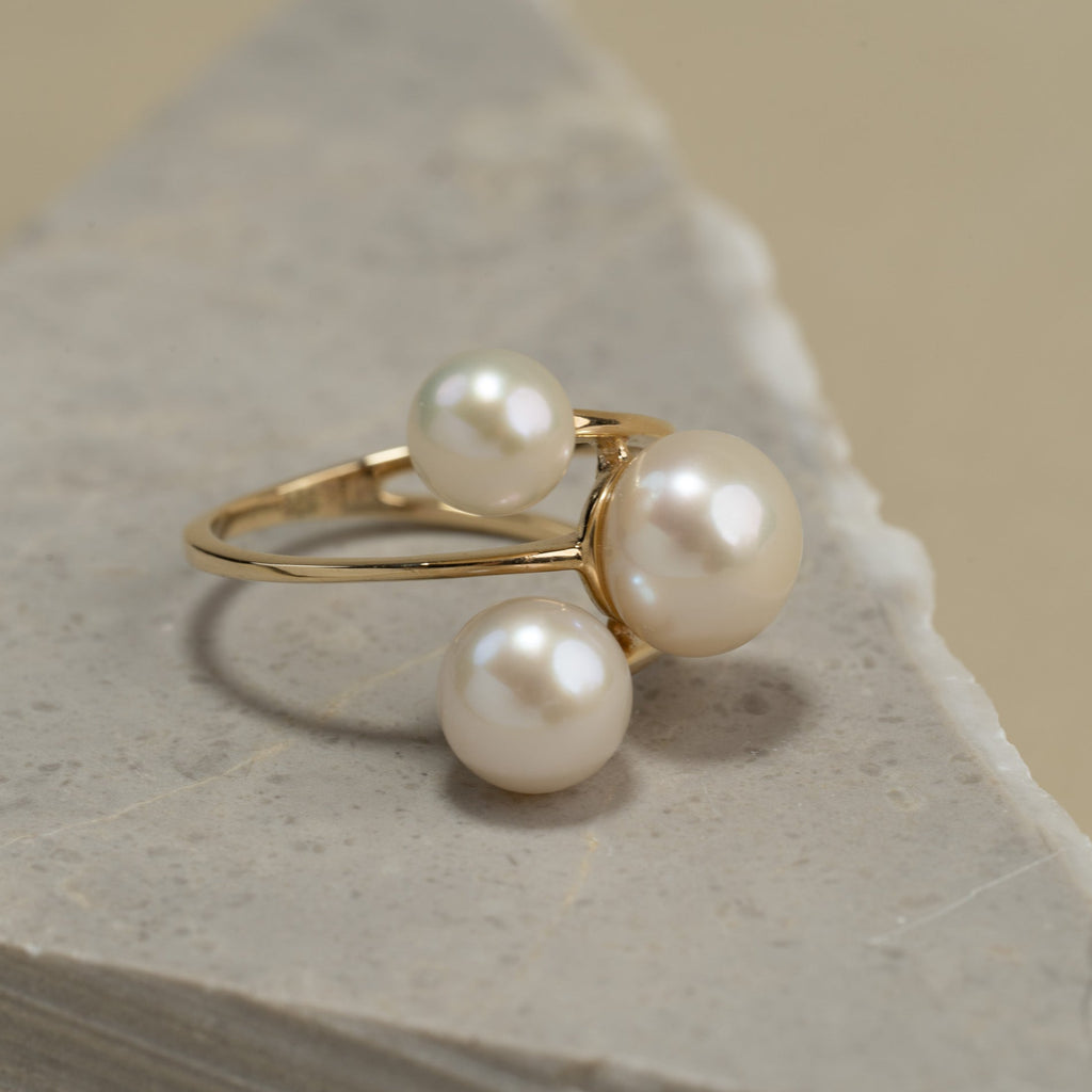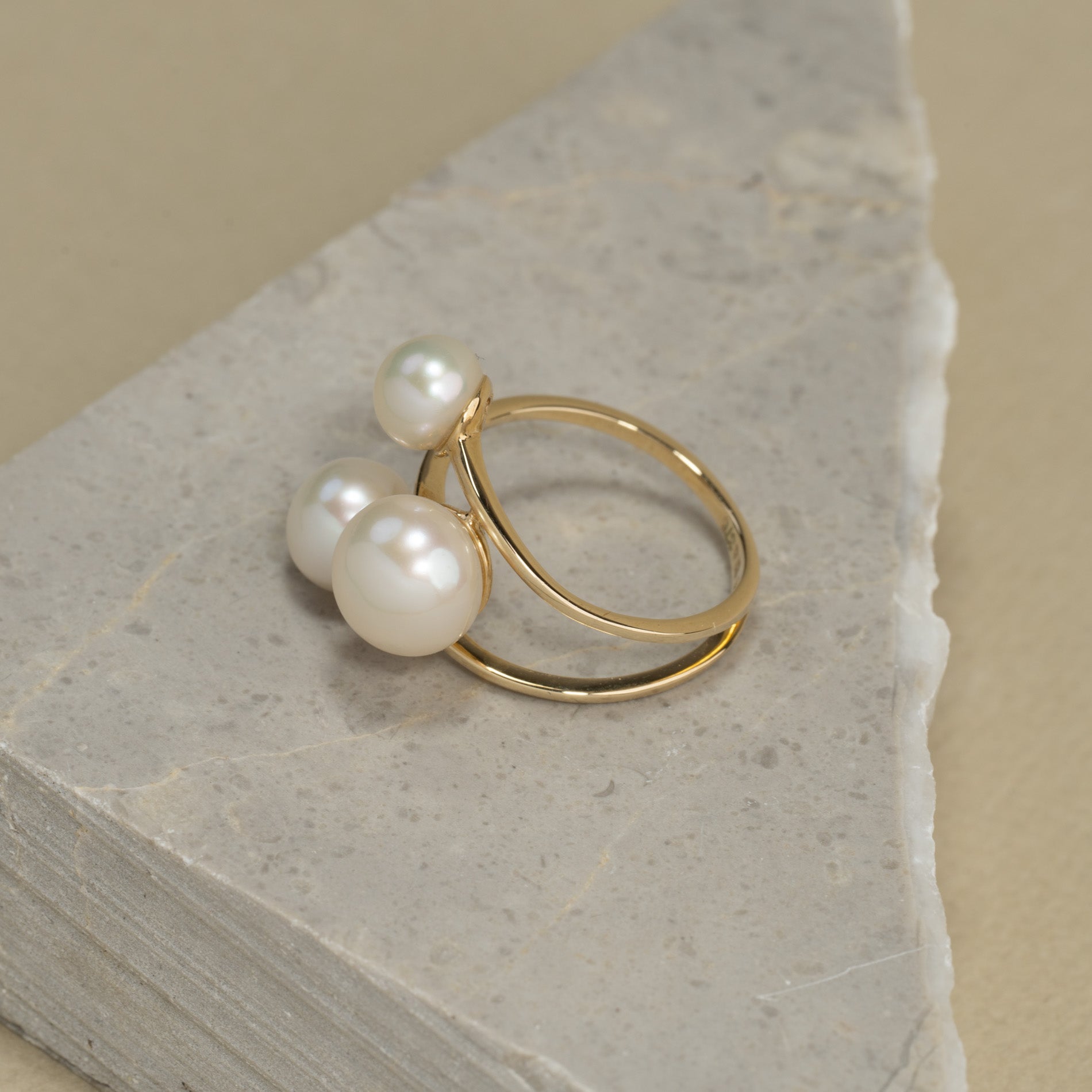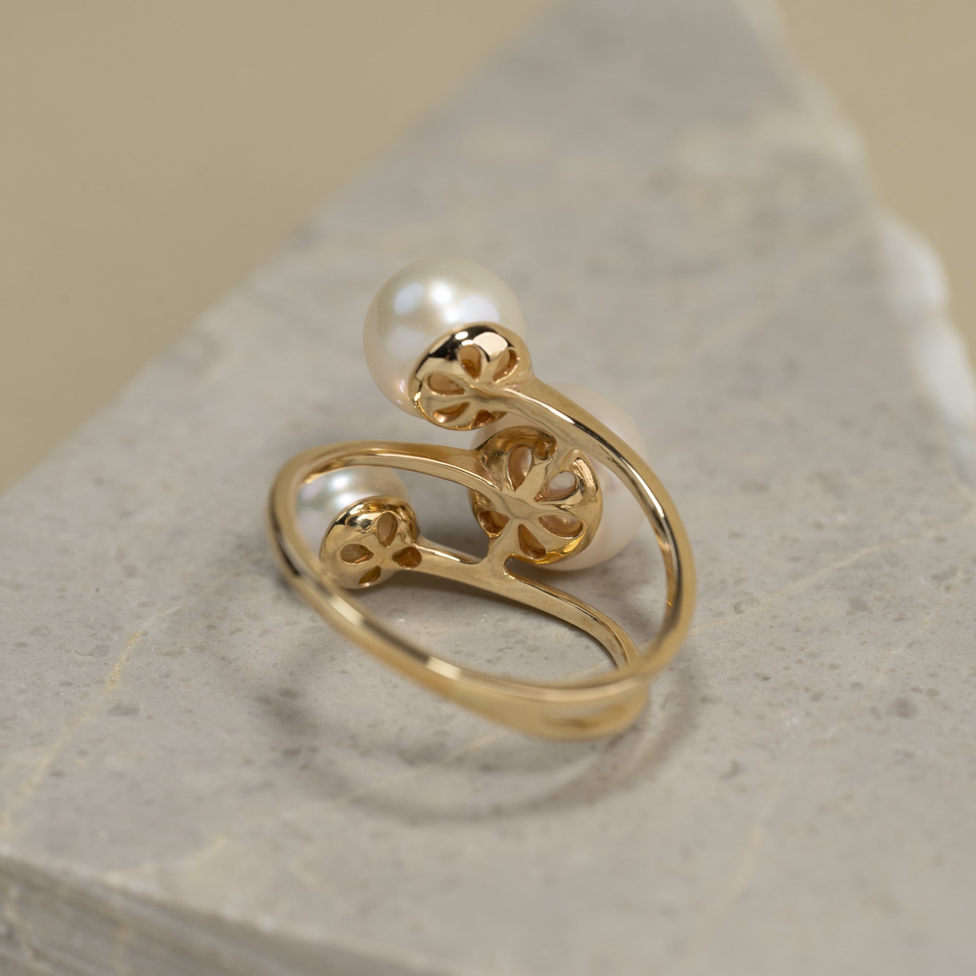Ringen är tillverkad i 100% återvunnet massivt 9 karat guld med tre fina vita sötvattenpärlor i olika storlekar. Det ger en fin detalj till ringen. Pärlorna mäter cirka 6 mm, 7 mm och 8 mm.