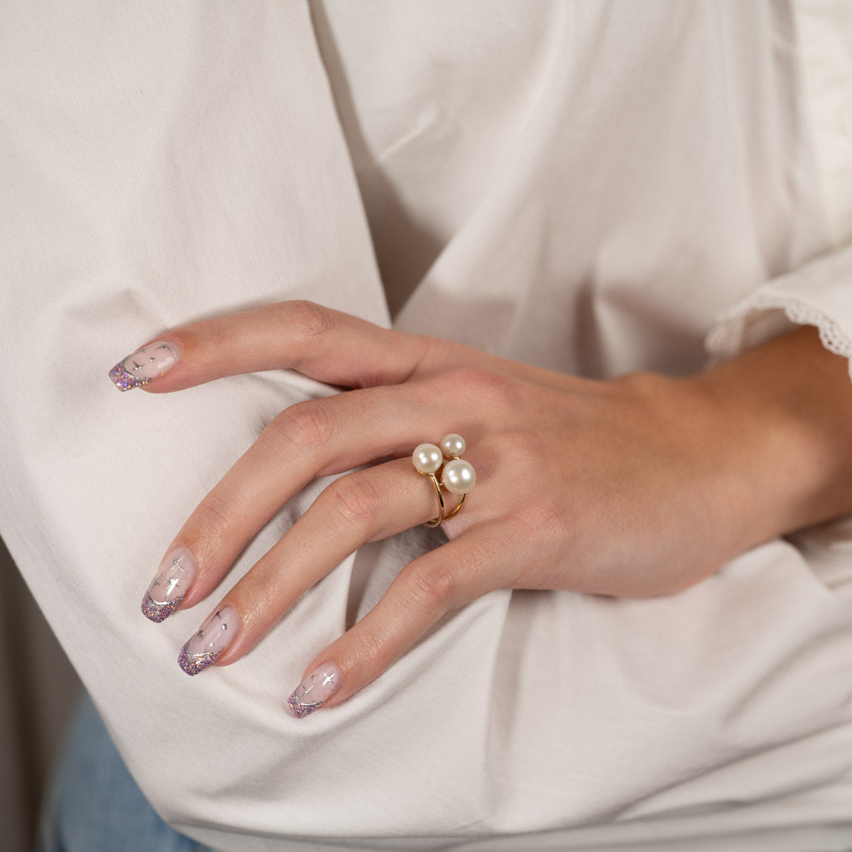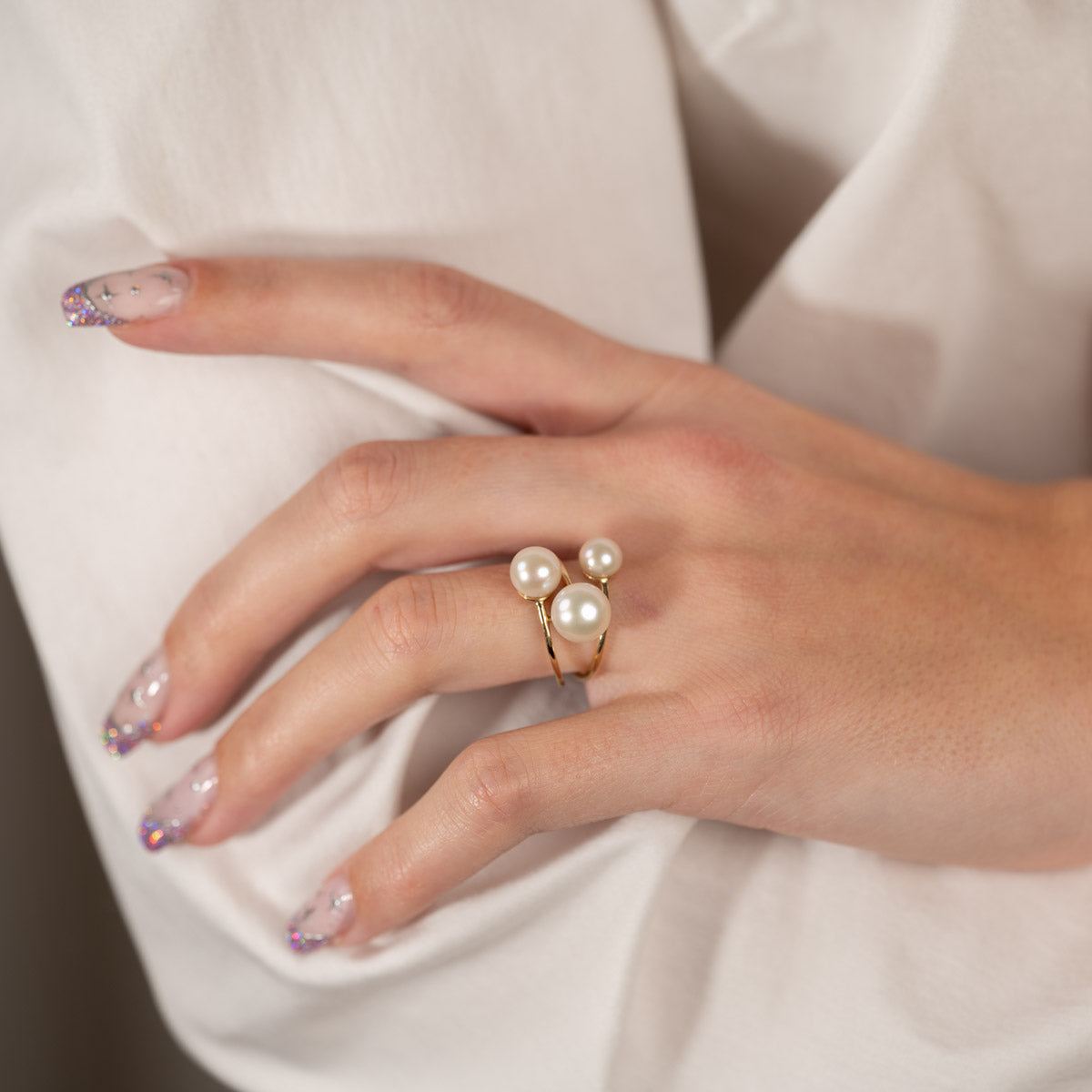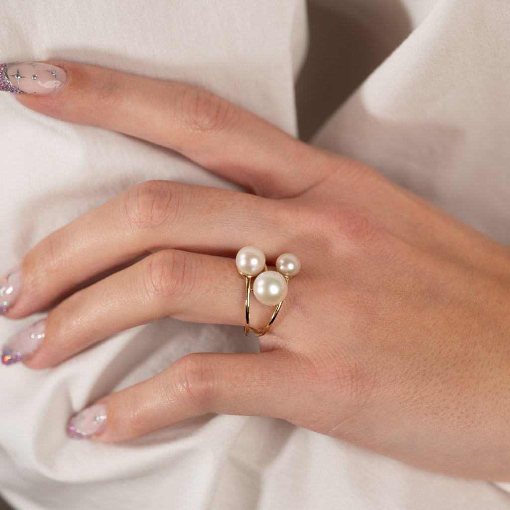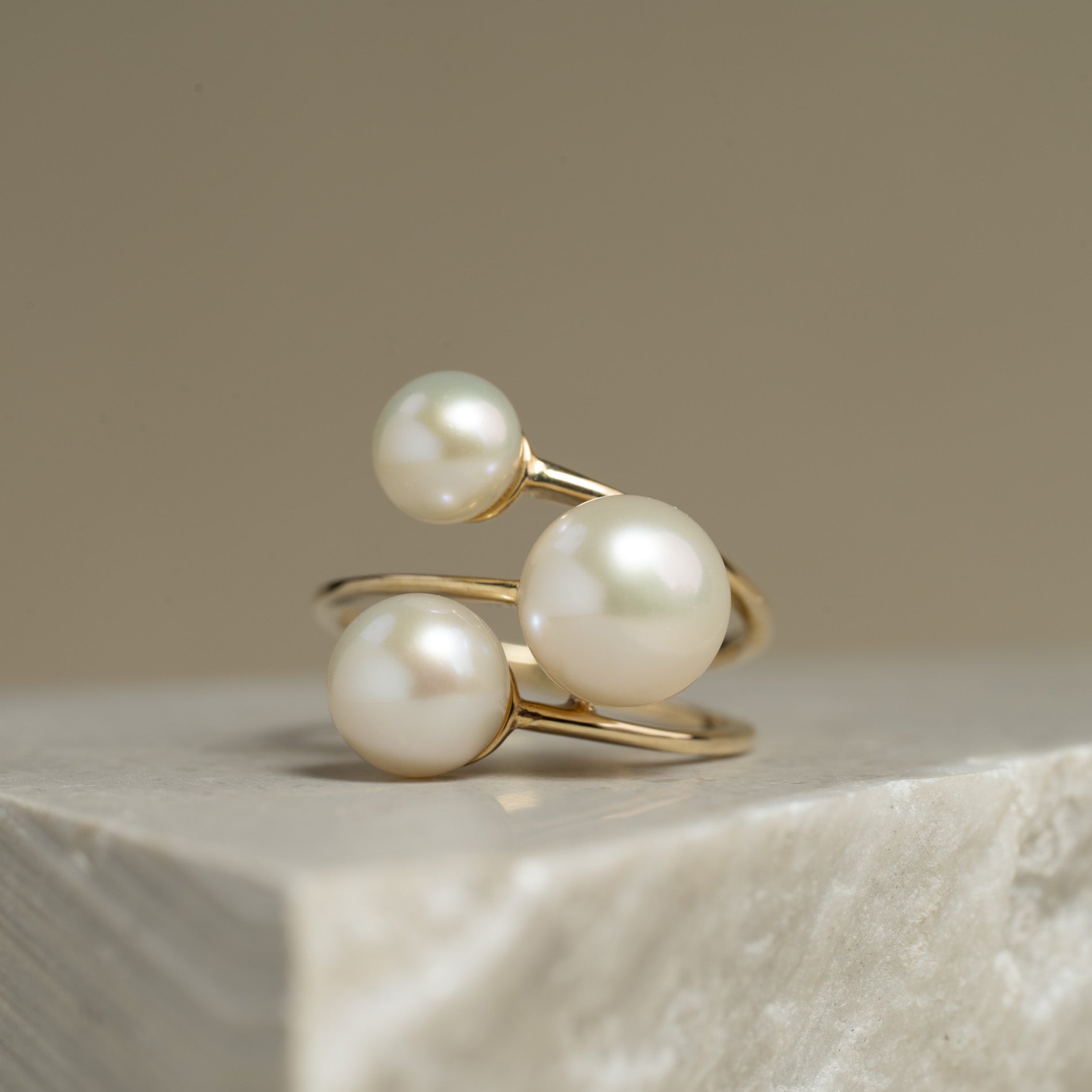 Ringen är tillverkad i 100% återvunnet massivt 9 karat guld med tre fina vita sötvattenpärlor i olika storlekar. Det ger en fin detalj till ringen. Pärlorna mäter cirka 6 mm, 7 mm och 8 mm.