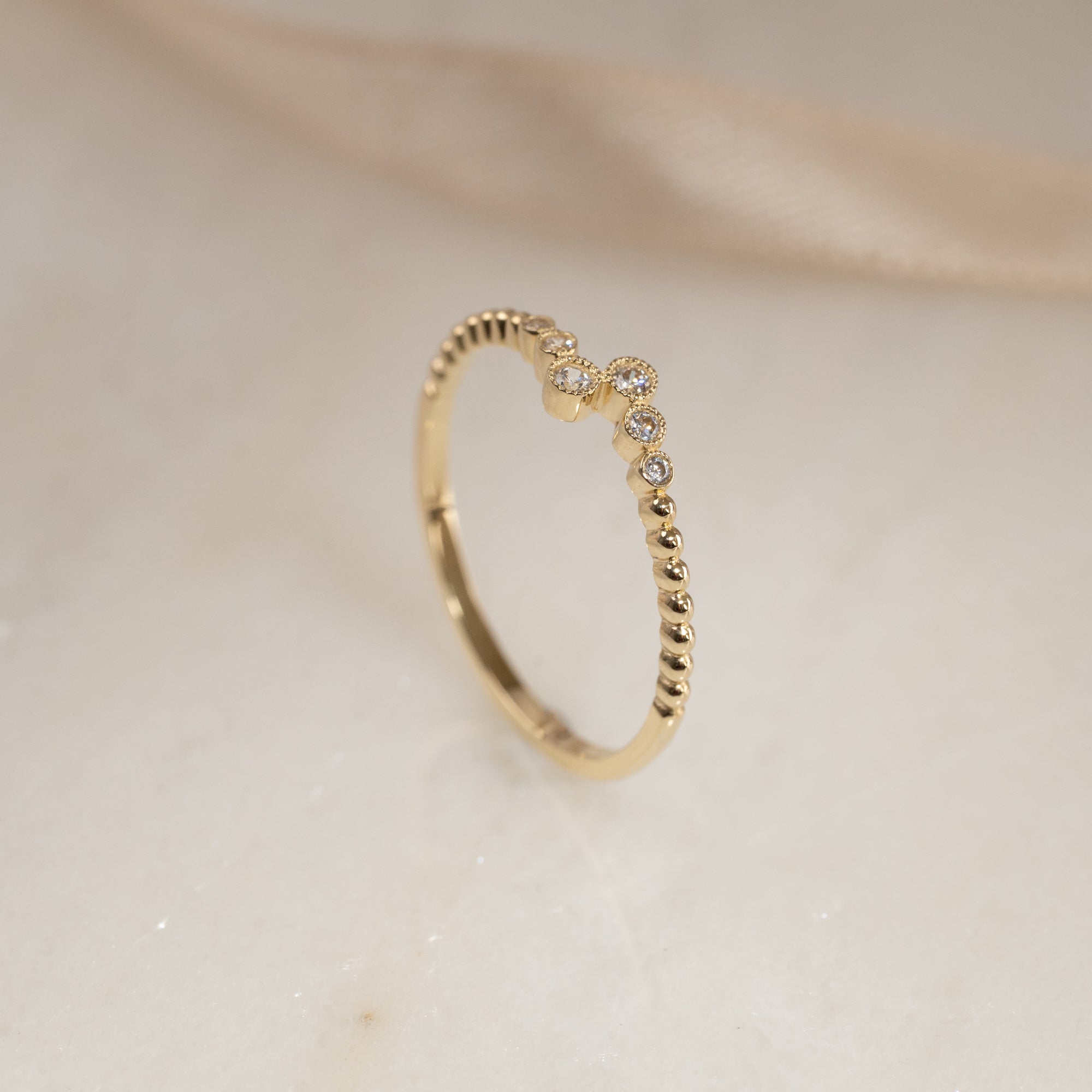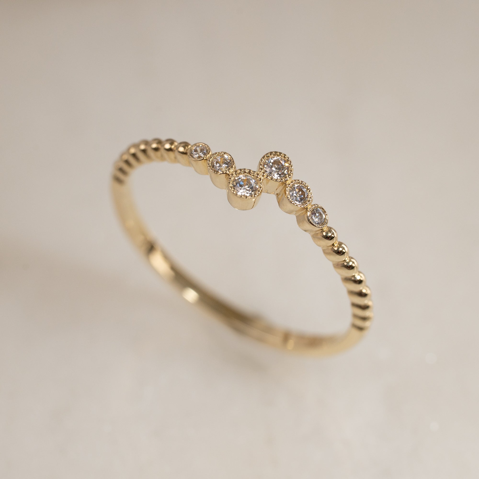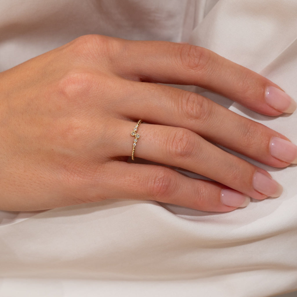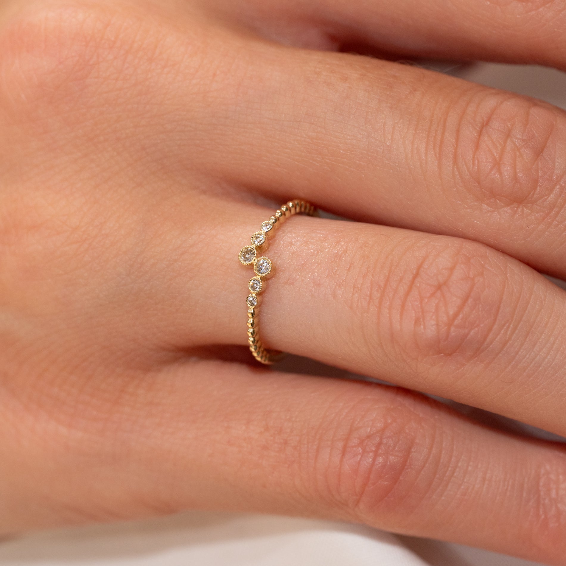 En fin och feminin ring med små stenar på ringskenan, som gör ringen till ett elegant och stilrent smycke. De små stenarna är placerade i en liten klunga och tillför extra glans för ett uppseendeväckande uttryck.