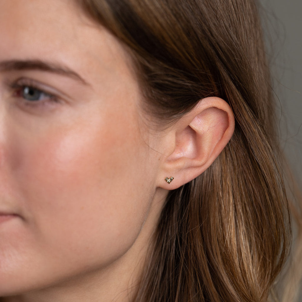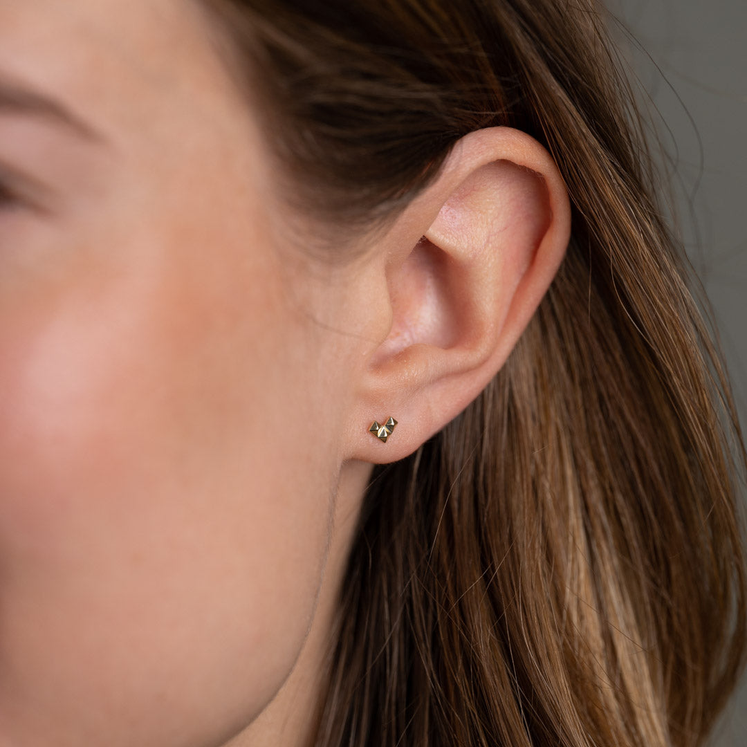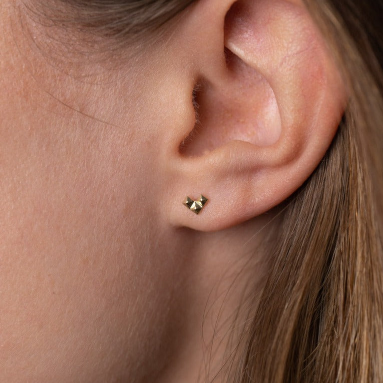 Våra örhängen är gjorda av 100% återvunnen 9 karats guld. De är designade som tre "nitar" som tillsammans bildar ett fint hjärta eller en pil beroende på hur du bär dem. Det råa uttrycket från nitarna i den fina lilla designen kan vara ett perfekt sätt att ge din outfit det lilla extra.