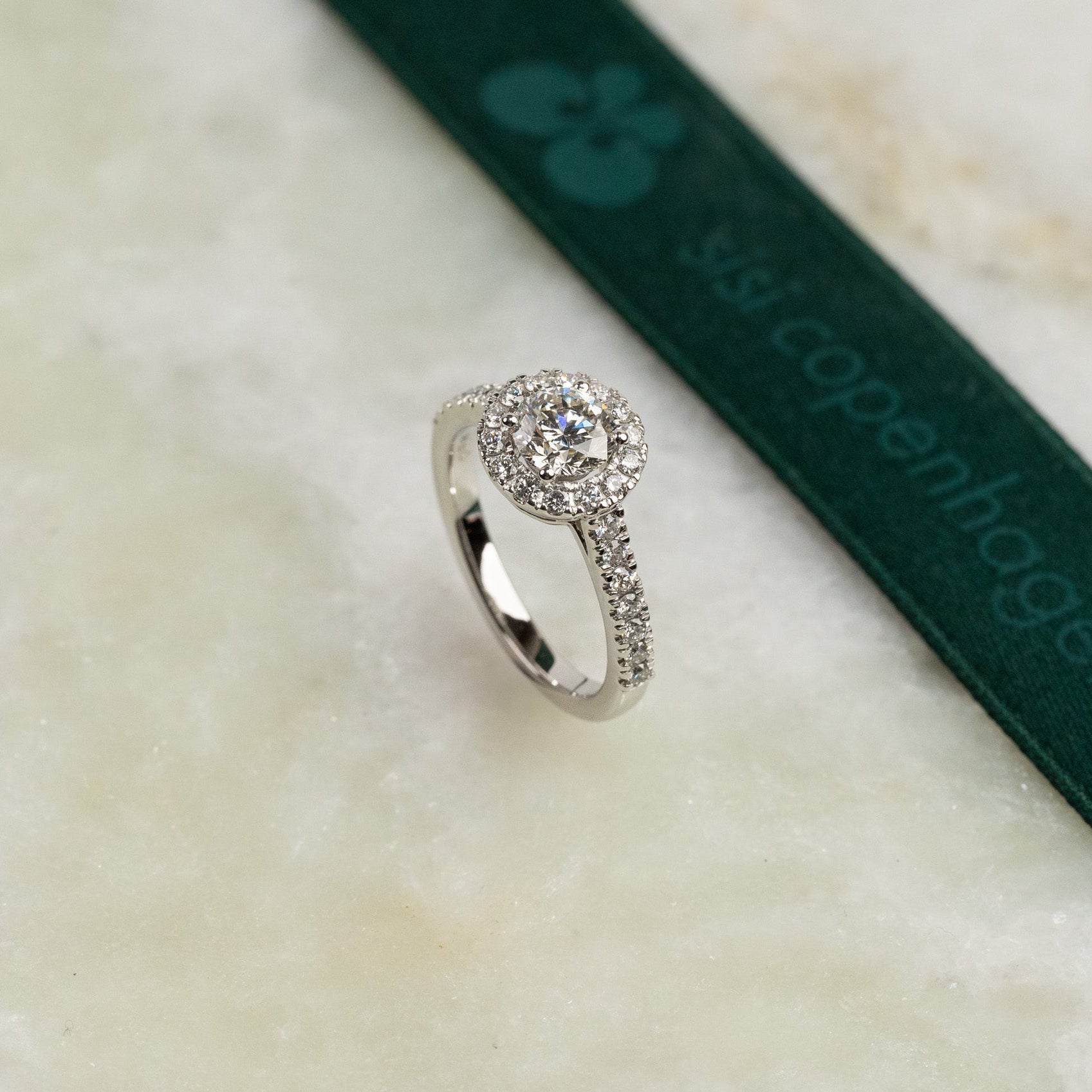 Elegant rosettring i 14 kt vitguld med 1,2 ct labbodlade diamanter. Denna vackra rosettring är tillverkad i 14 karat vitguld och prydd med 1,2 ct labbodlade diamanter. Mittstenen består av en 0,8 ct diamant, omgiven av en 0,15 ct halo. Ringskenan är även dekorerad med 0,2 ct sidodiamanter, vilket ger ringen en extra lyxig effekt.