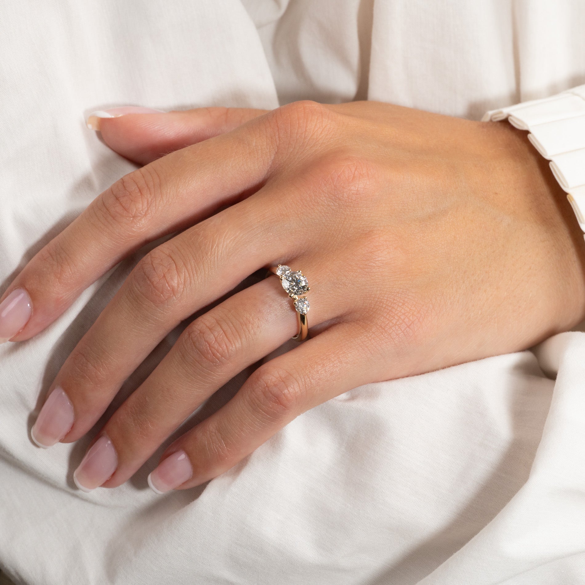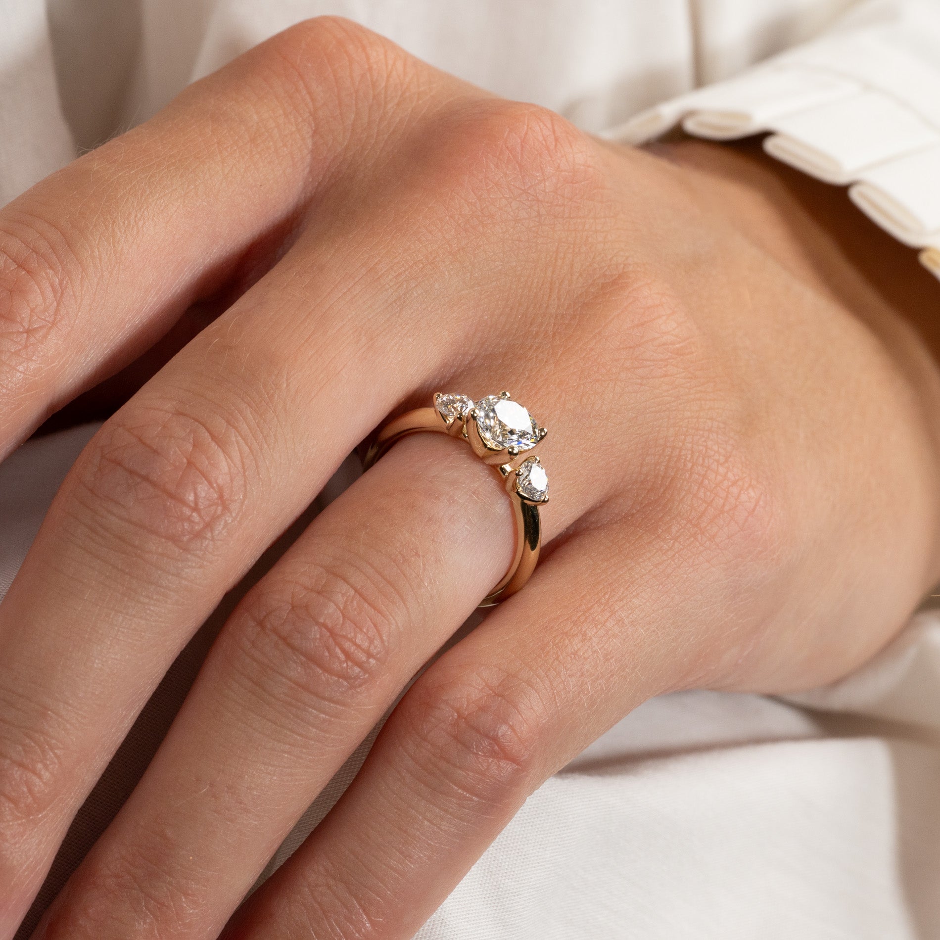Ringen är tillverkad i 14 karat massivt guld med tre etiskt framställda labbodlade diamanter på totalt 1,40 ct. Diamanterna har färgen E/F (River) och klarheten VVS. Smycket är skapat med omtanke; diamanterna är tillverkade med hjälp av bland annat solenergi, och guldet är 100% certifierat återvunnet.