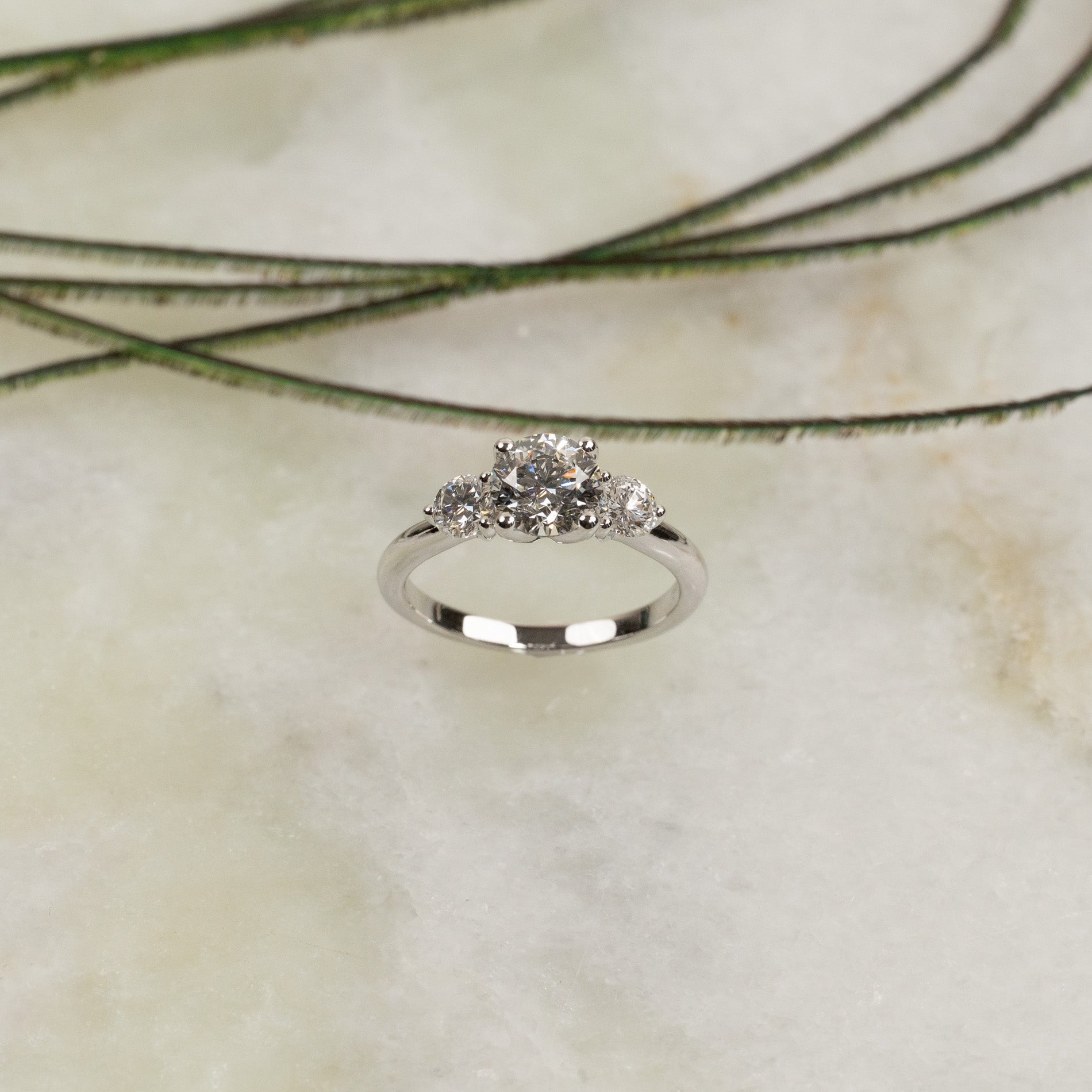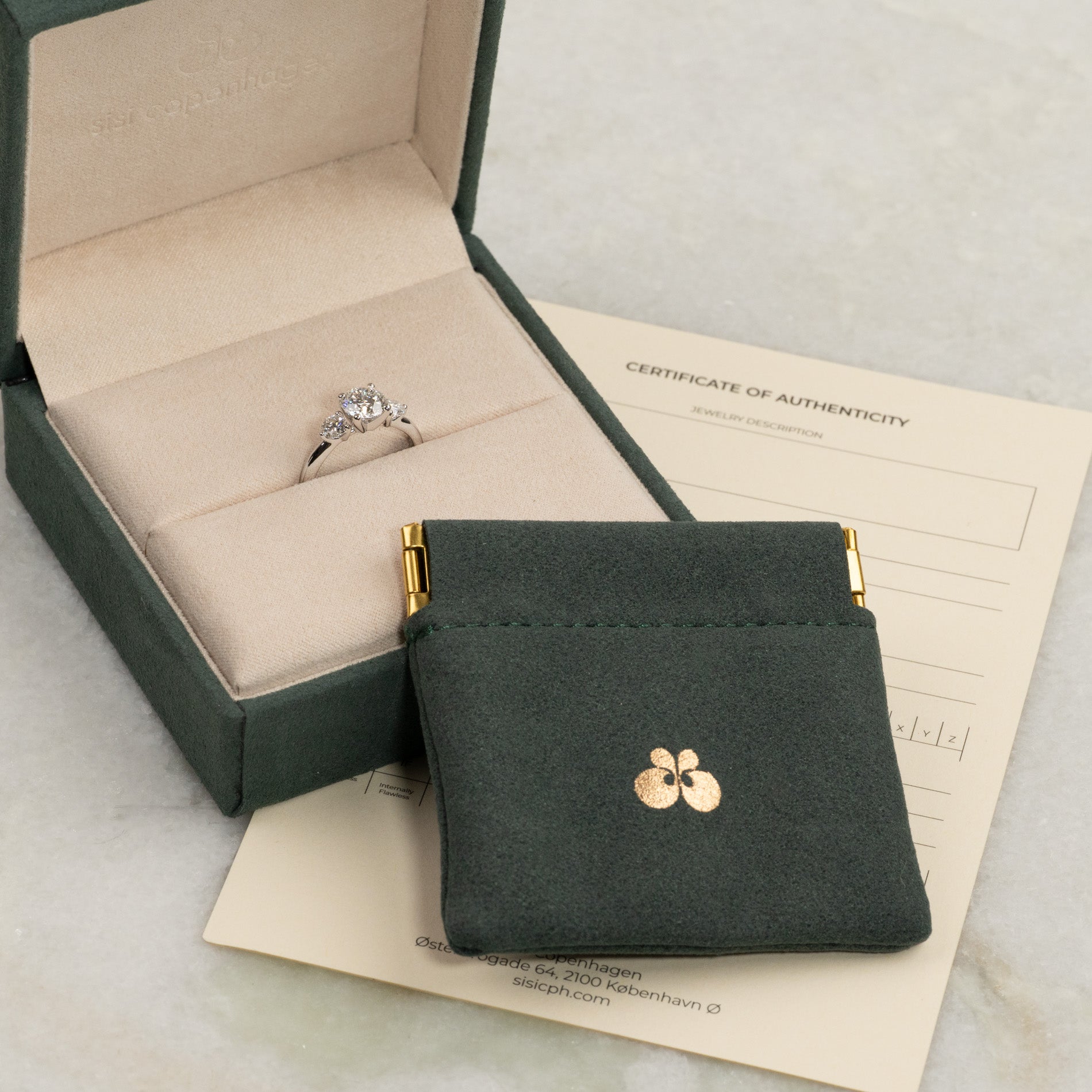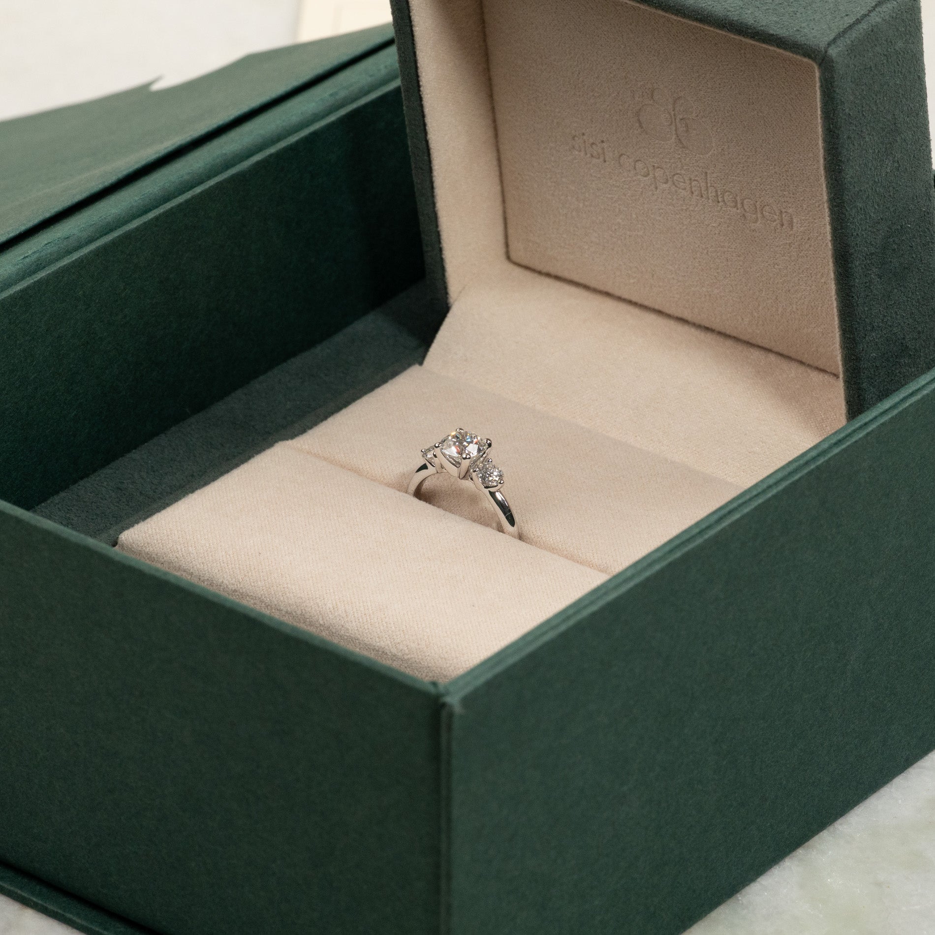 Ringen är tillverkad i 14 karat massivt vitguld med tre labbodlade diamanter på totalt 1,75 ct. Diamanterna har färg E/F (River) och klarhet VVS. Smycket är skapat med omtanke - diamanterna är framtagna med bland annat solenergi, och guldet är 100 % certifierat återvunnet.