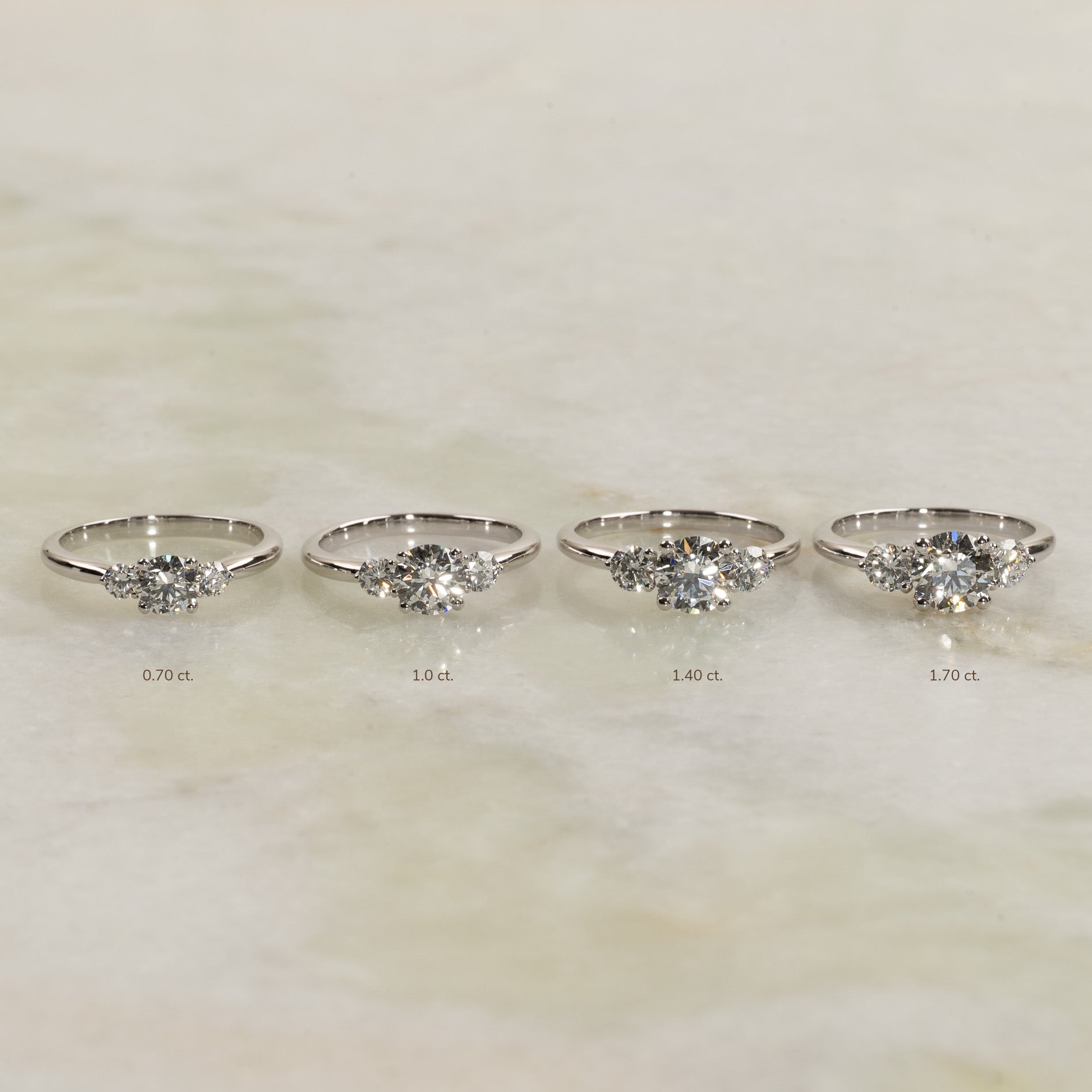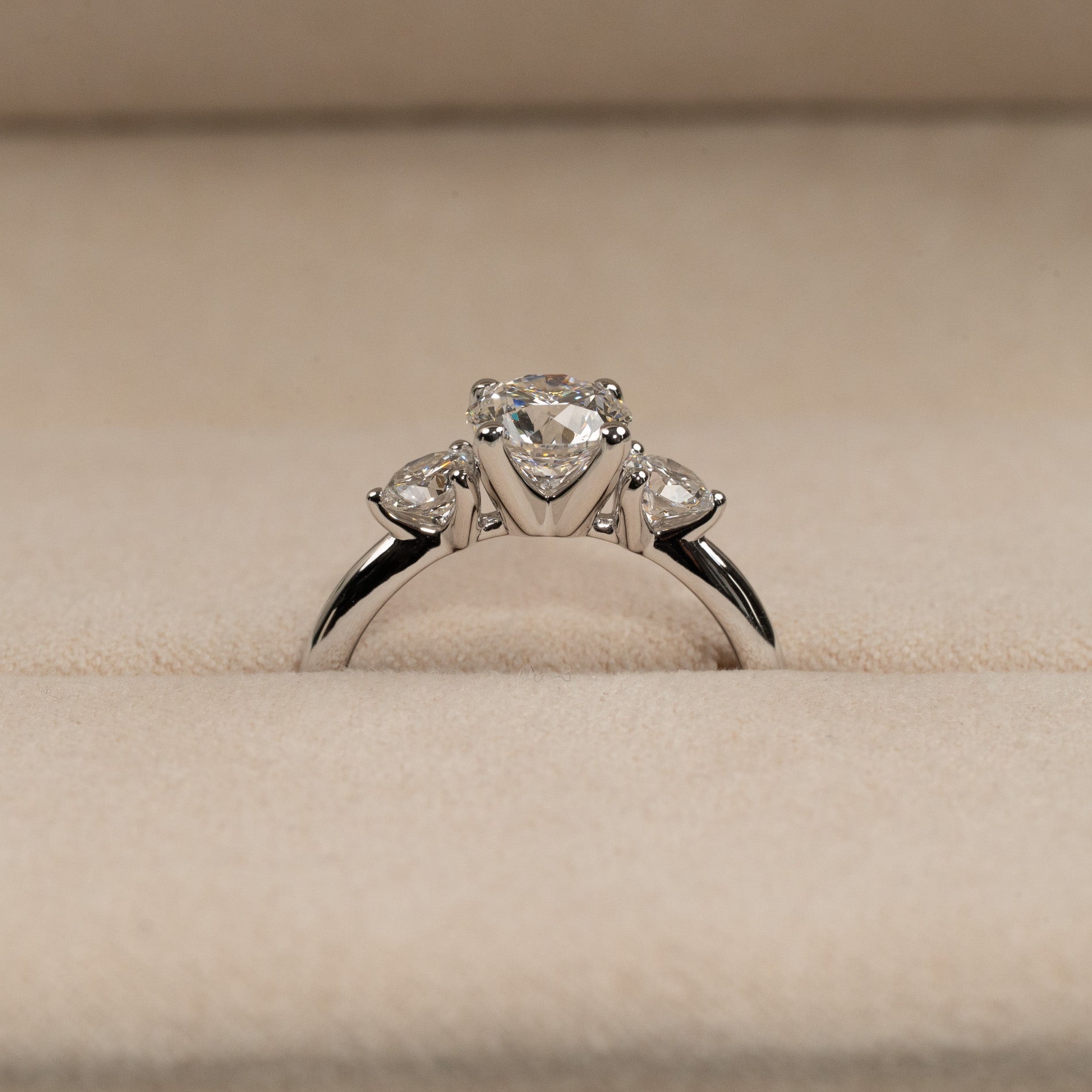 Designen lyfter fram de tre diamanterna i graderad storlek runt mittstenen. Infattningen är formad som ett V, där klorna elegant framhäver stenarna och släpper in ljus från flera vinklar för maximal briljans och lyster.