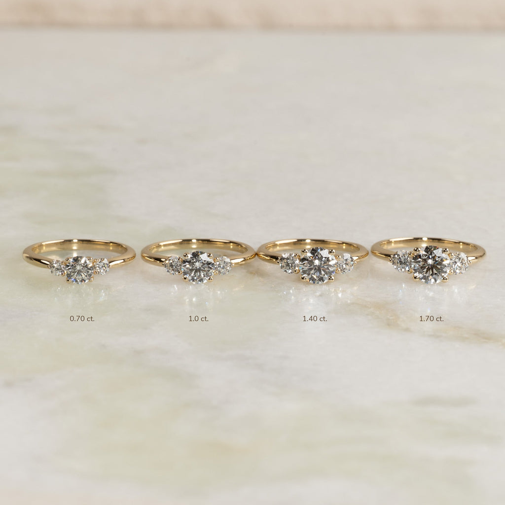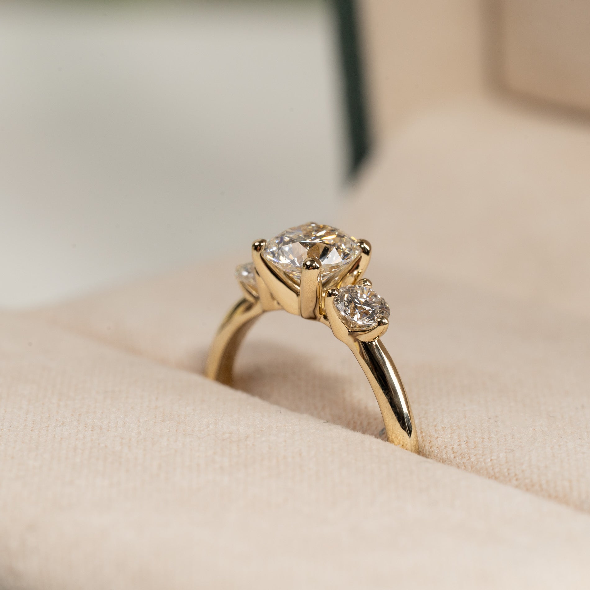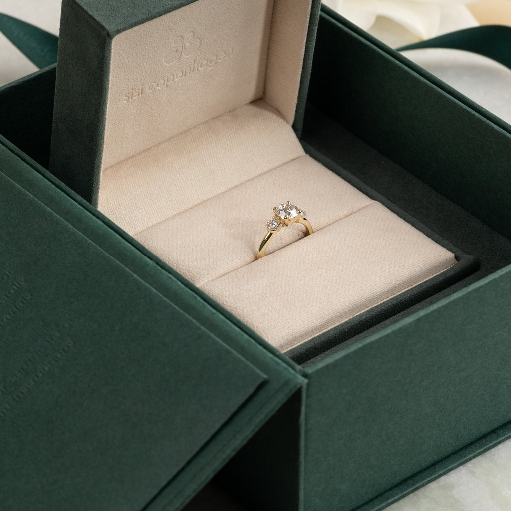 Ringen är gjord i 14 karat massivt guld med tre etiskt framställda labbodlade diamanter på totalt 1,75 ct. Diamanterna har färg E/F (River-Top Wesselton) och klarhet VVS-VS. Smycket är skapat med omtanke – diamanterna är tillverkade med hjälp av bland annat solenergi, och guldet är 100% certifierat återvunnet.