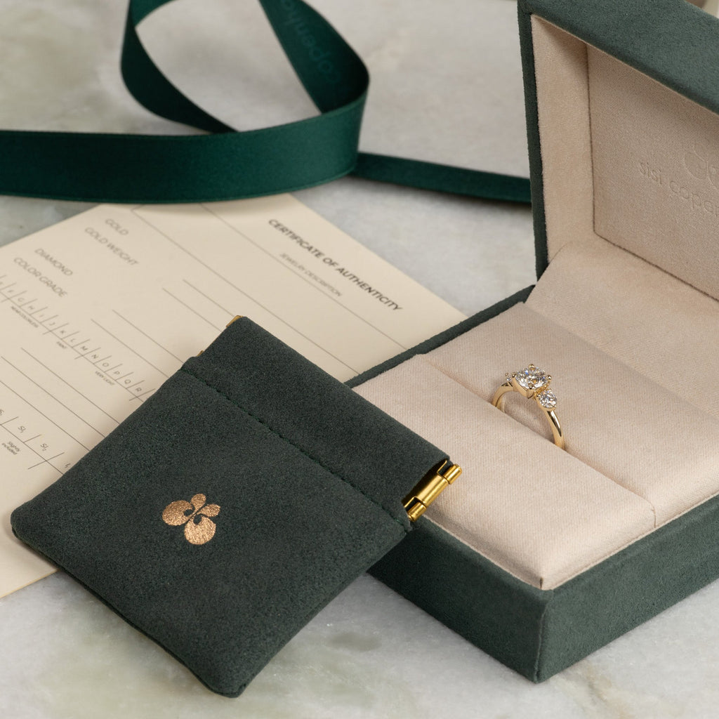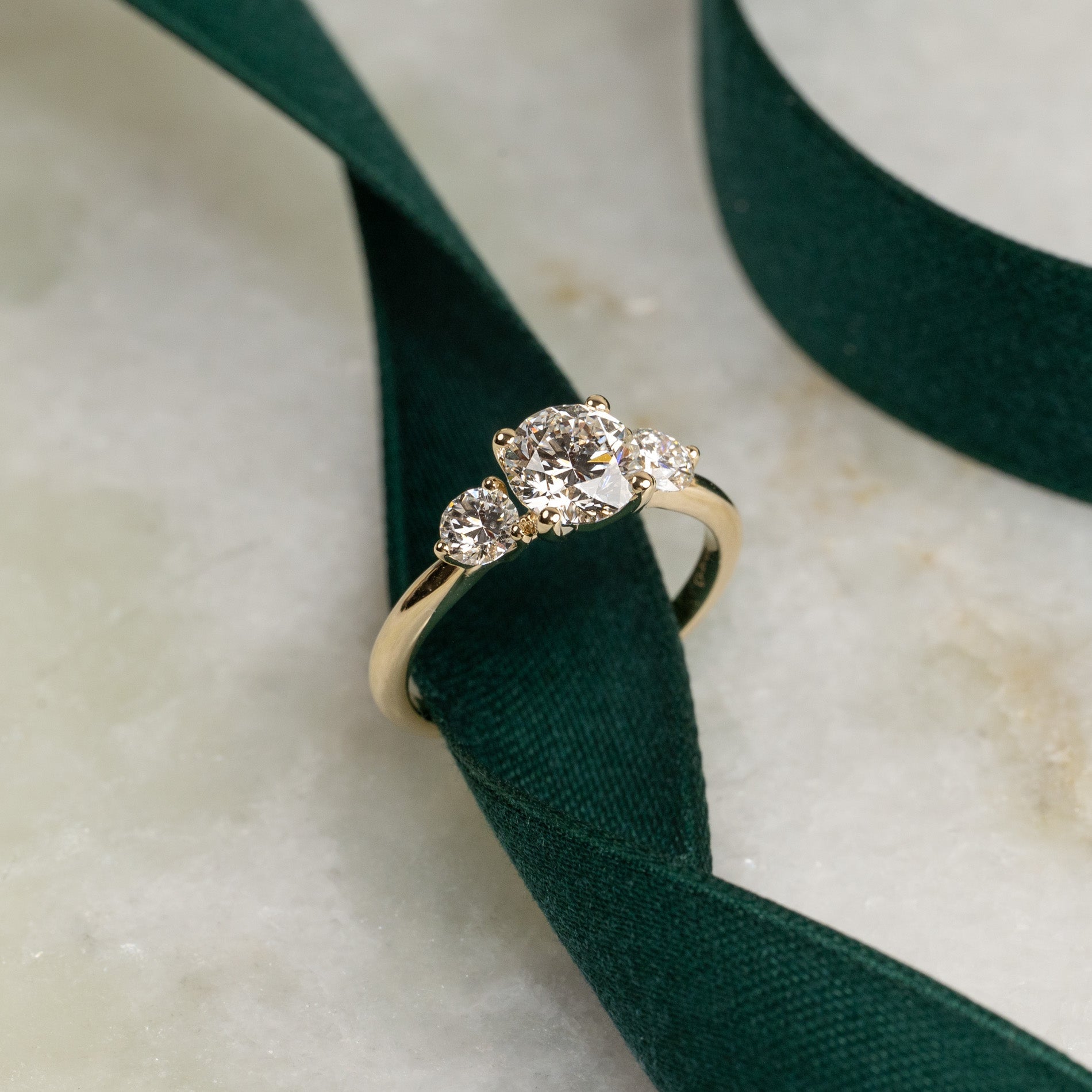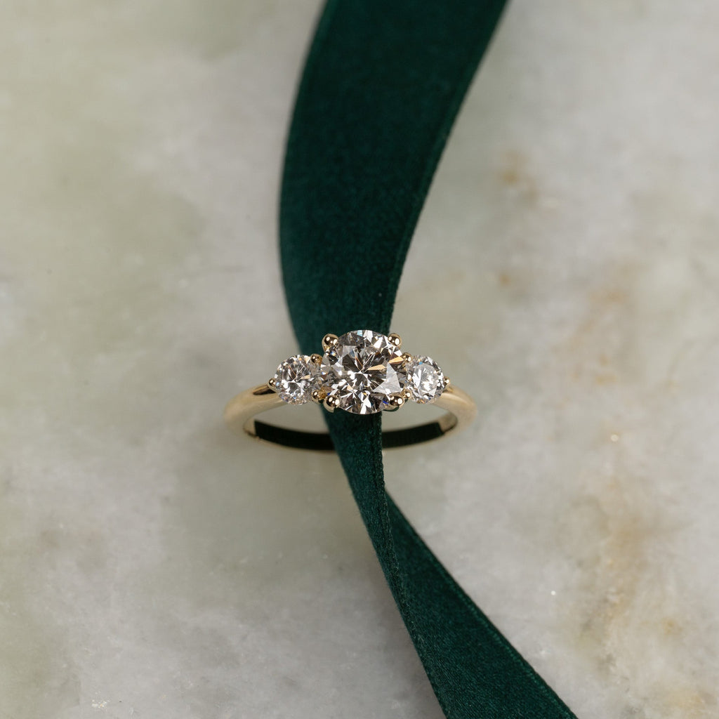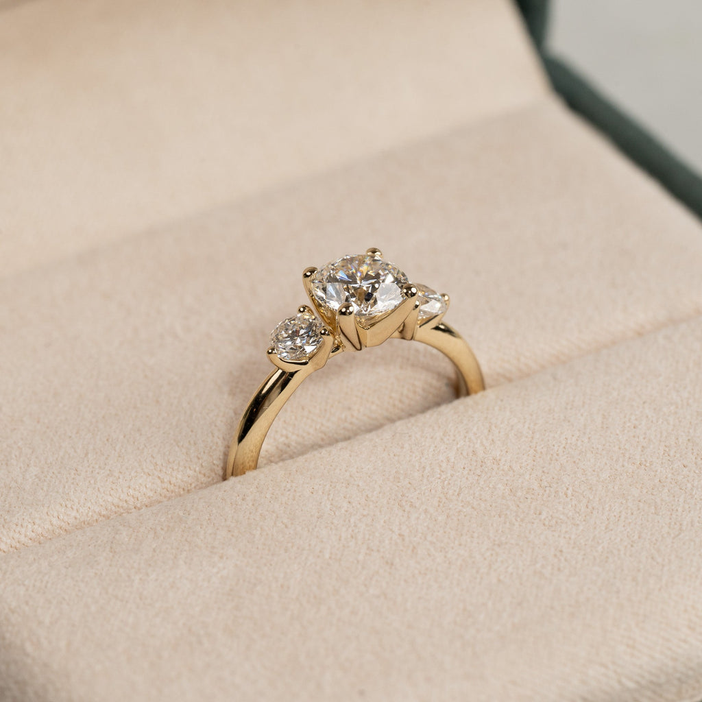Ringen är gjord i 14 karat massivt guld med tre etiskt framställda labbodlade diamanter på totalt 1,75 ct. Diamanterna har färg E/F (River-Top Wesselton) och klarhet VVS-VS. Smycket är skapat med omtanke – diamanterna är tillverkade med hjälp av bland annat solenergi, och guldet är 100% certifierat återvunnet.