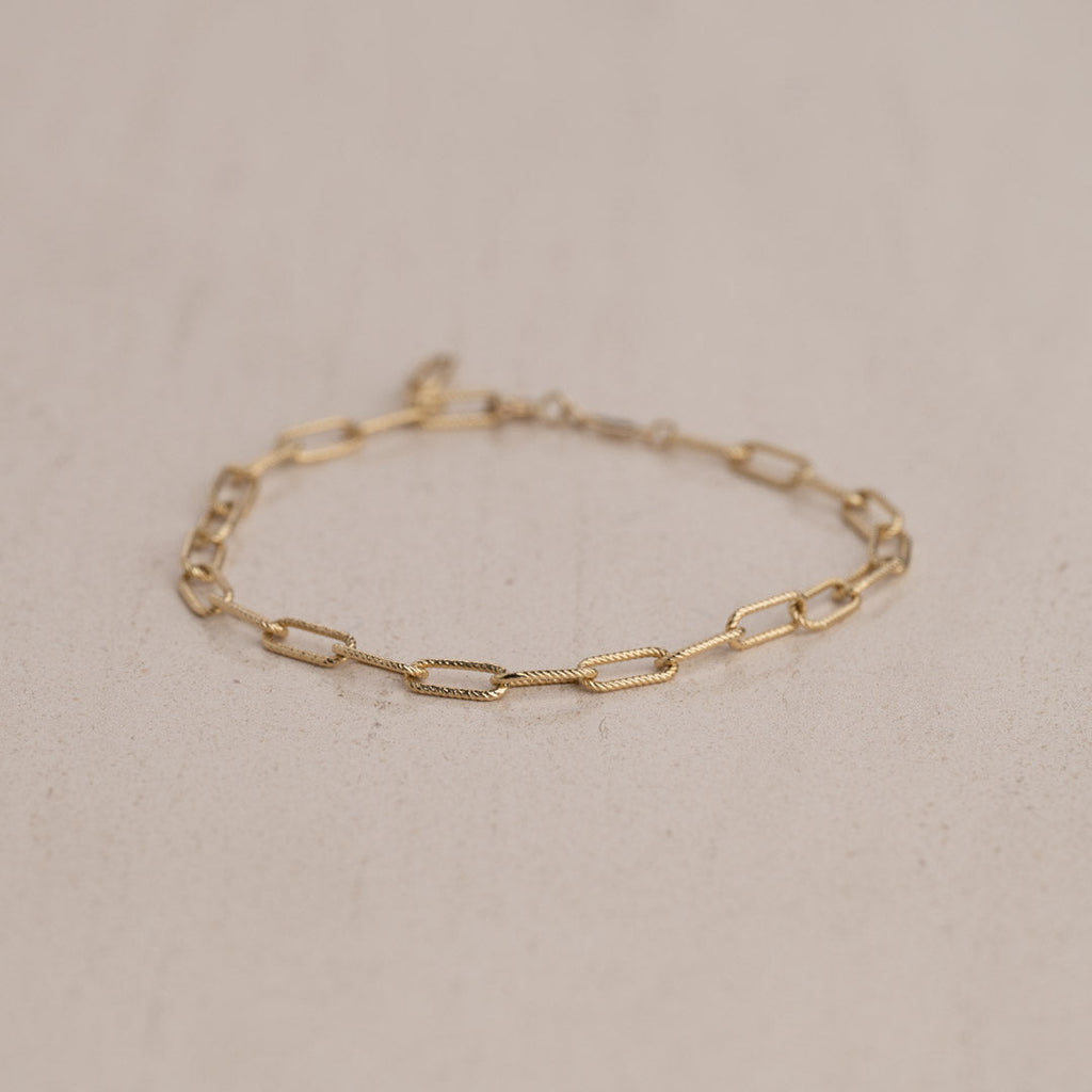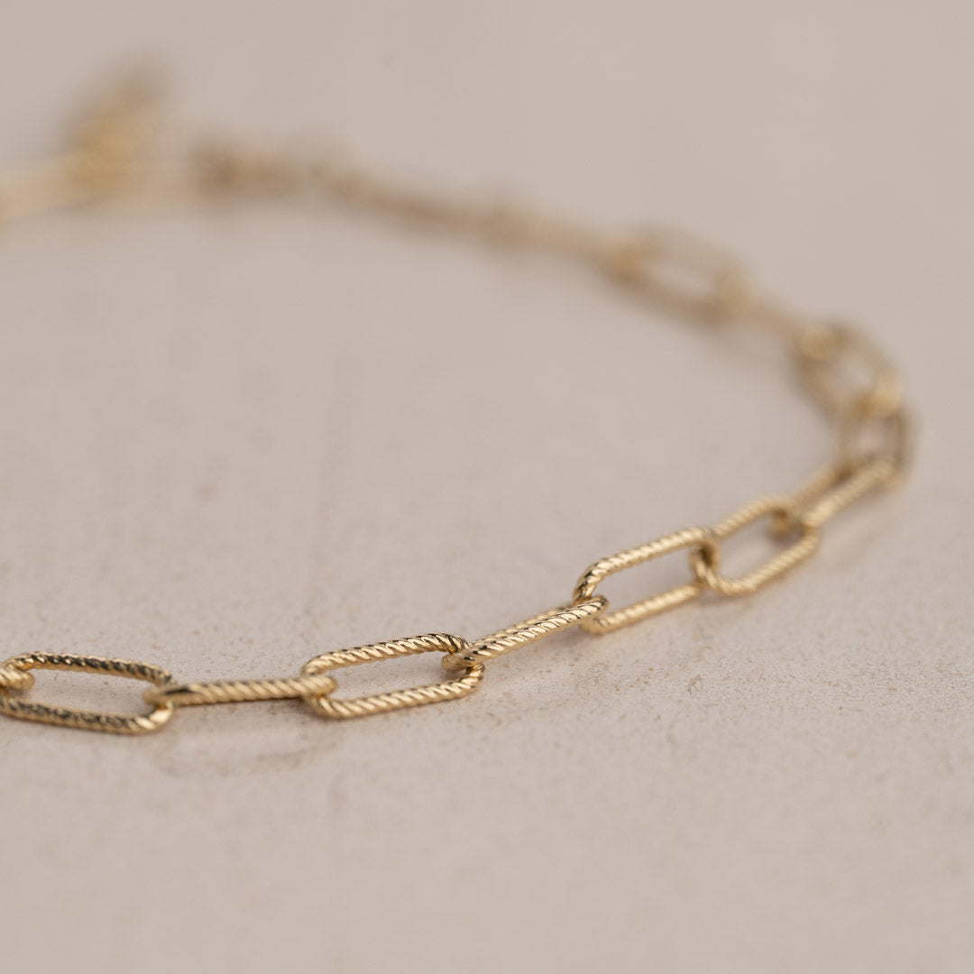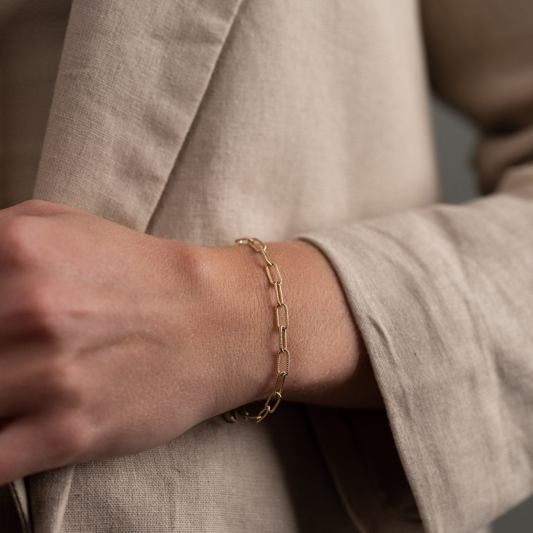 Vårt Roxanne -guldarmband är tillverkade av 100% återvunnet massivt 9 karats guld. De vackra armbanden är designade med halvstora kedjelänkar med räfflad struktur.