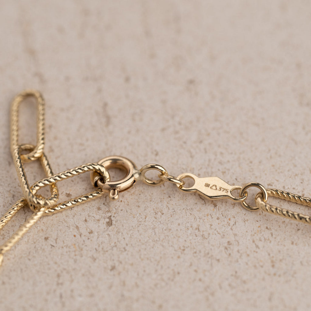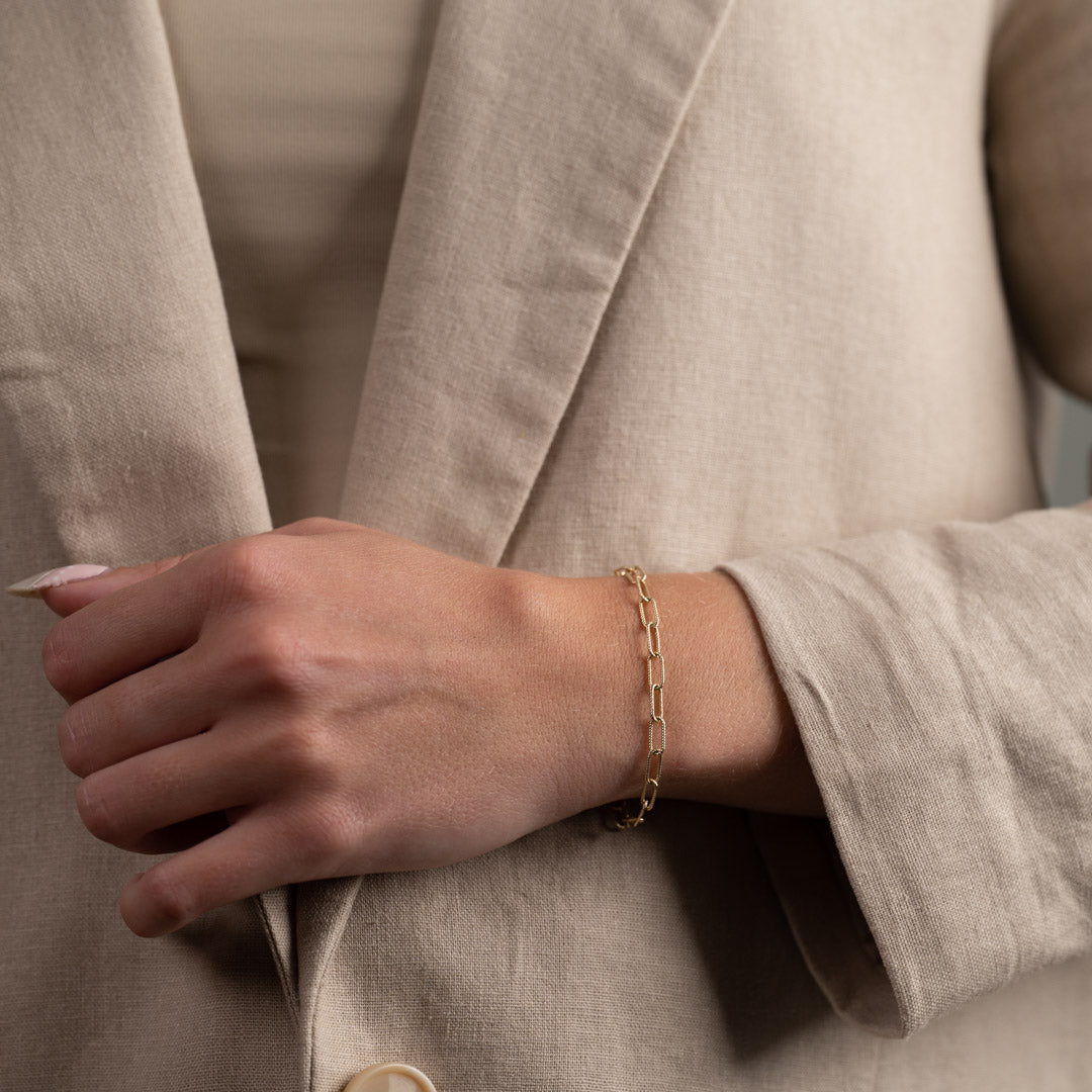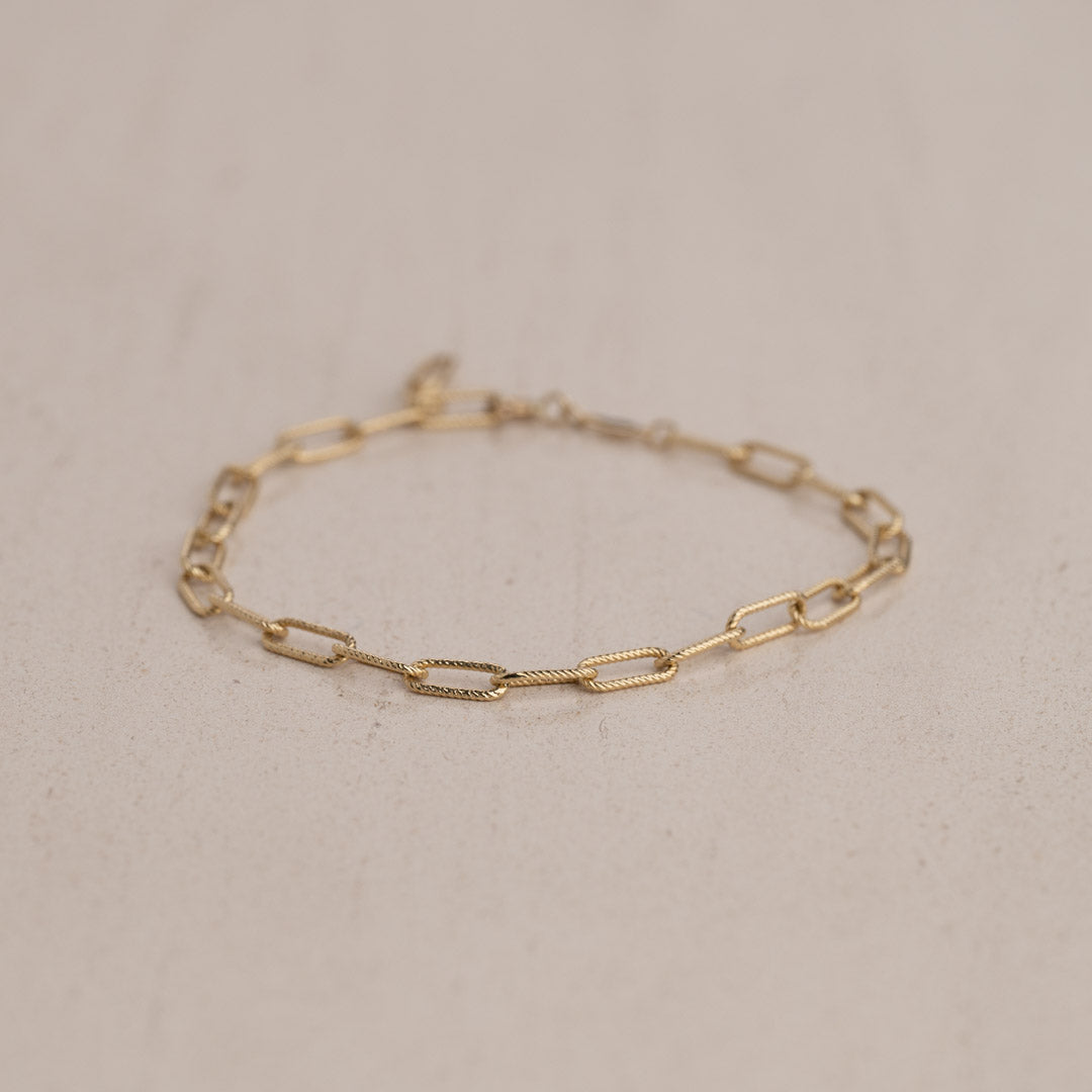 Vårt Roxanne -guldarmband är tillverkade av 100% återvunnet massivt 9 karats guld. De vackra armbanden är designade med halvstora kedjelänkar med räfflad struktur.