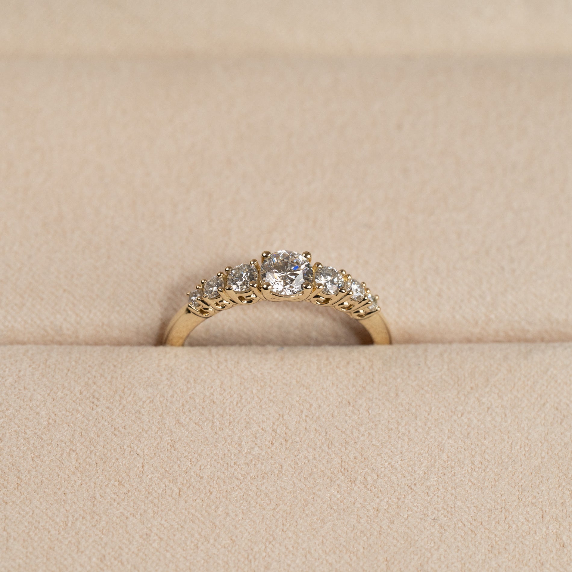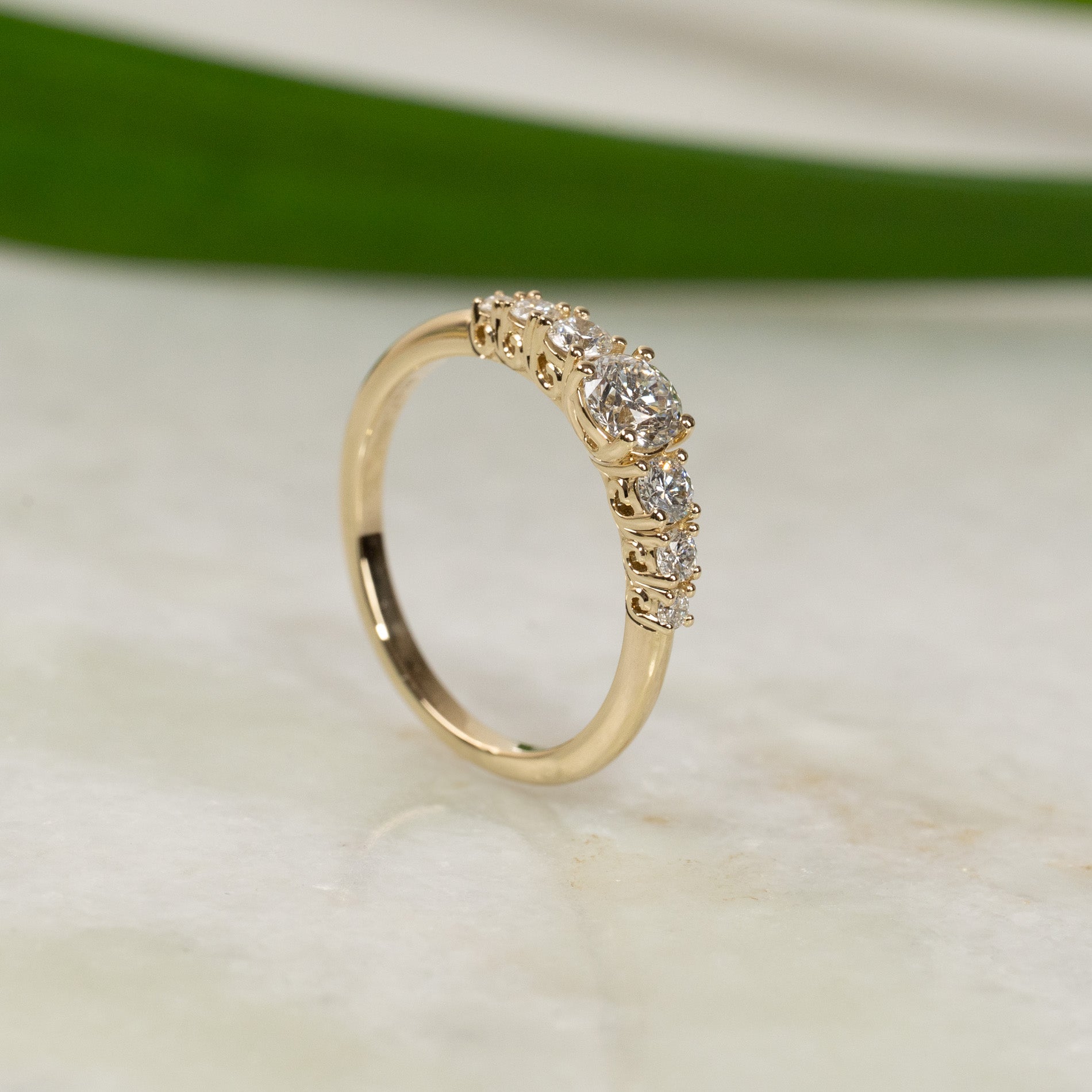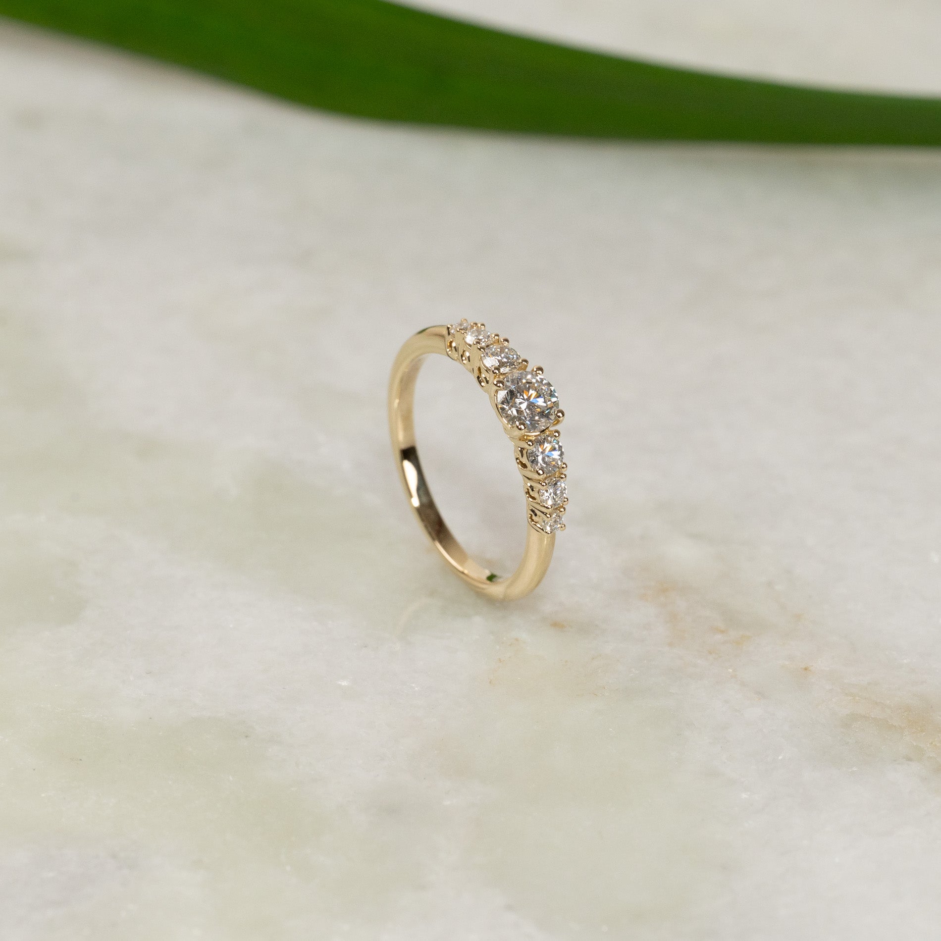 Ringen är tillverkad i 14 karat massivt guld med sju labbodlade diamanter på totalt 0,7 ct. Diamanterna har färgen E/F (River) och klarheten VVS. Smycket är skapat med omtanke – diamanterna är framställda med hjälp av bland annat solenergi, och guldet är 100 % certifierat återvunnet.
