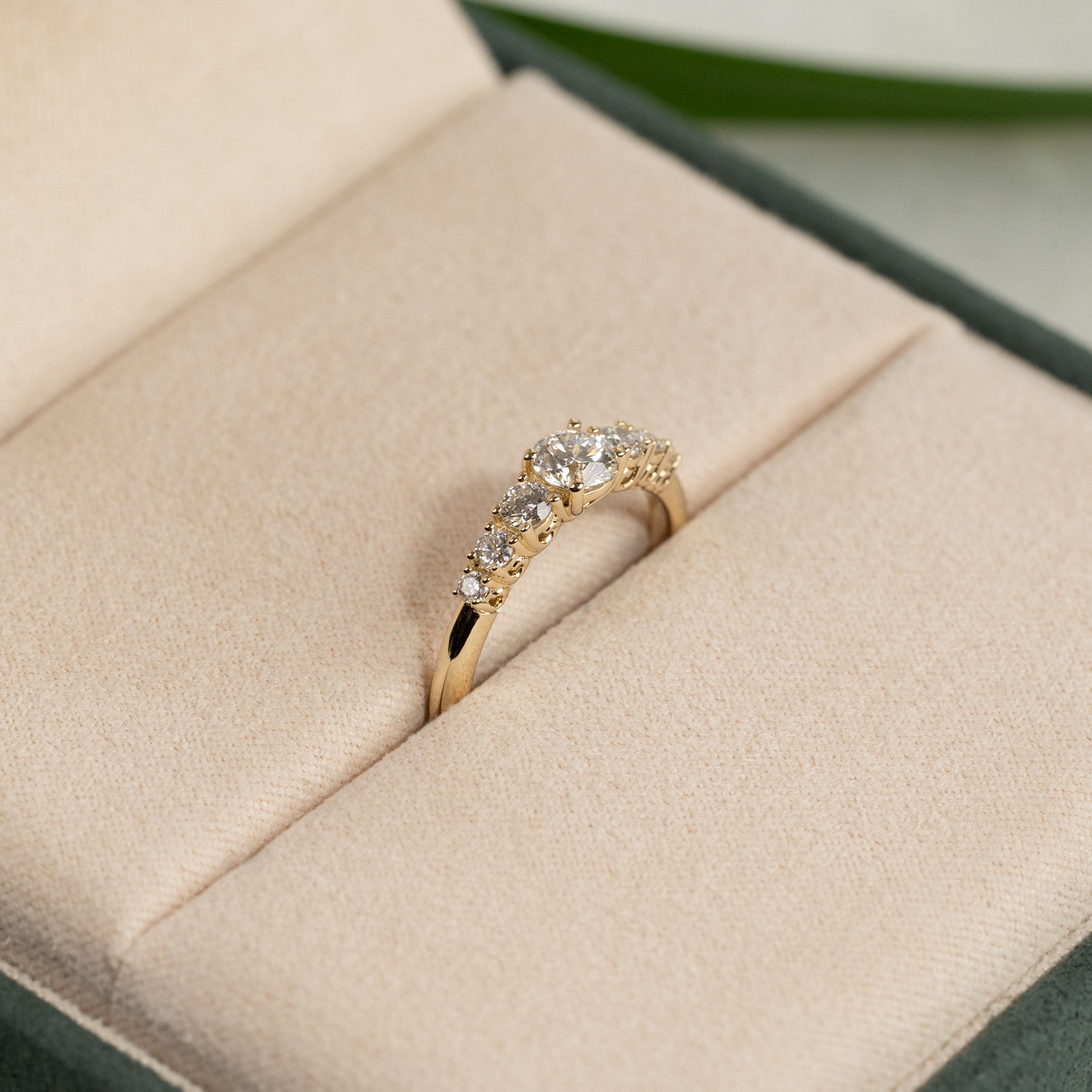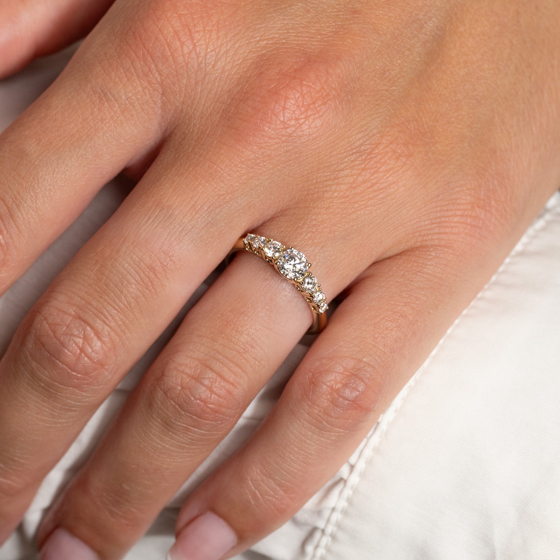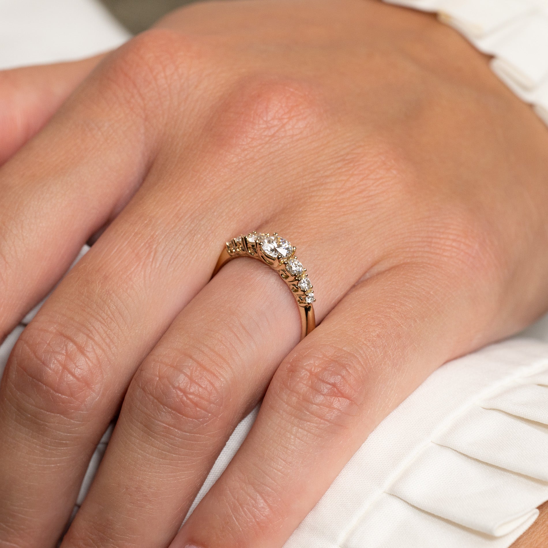 Ringen är tillverkad i 14 karat massivt guld med sju labbodlade diamanter på totalt 0,7 ct. Diamanterna har färgen E/F (River) och klarheten VVS. Smycket är skapat med omtanke – diamanterna är framställda med hjälp av bland annat solenergi, och guldet är 100 % certifierat återvunnet.