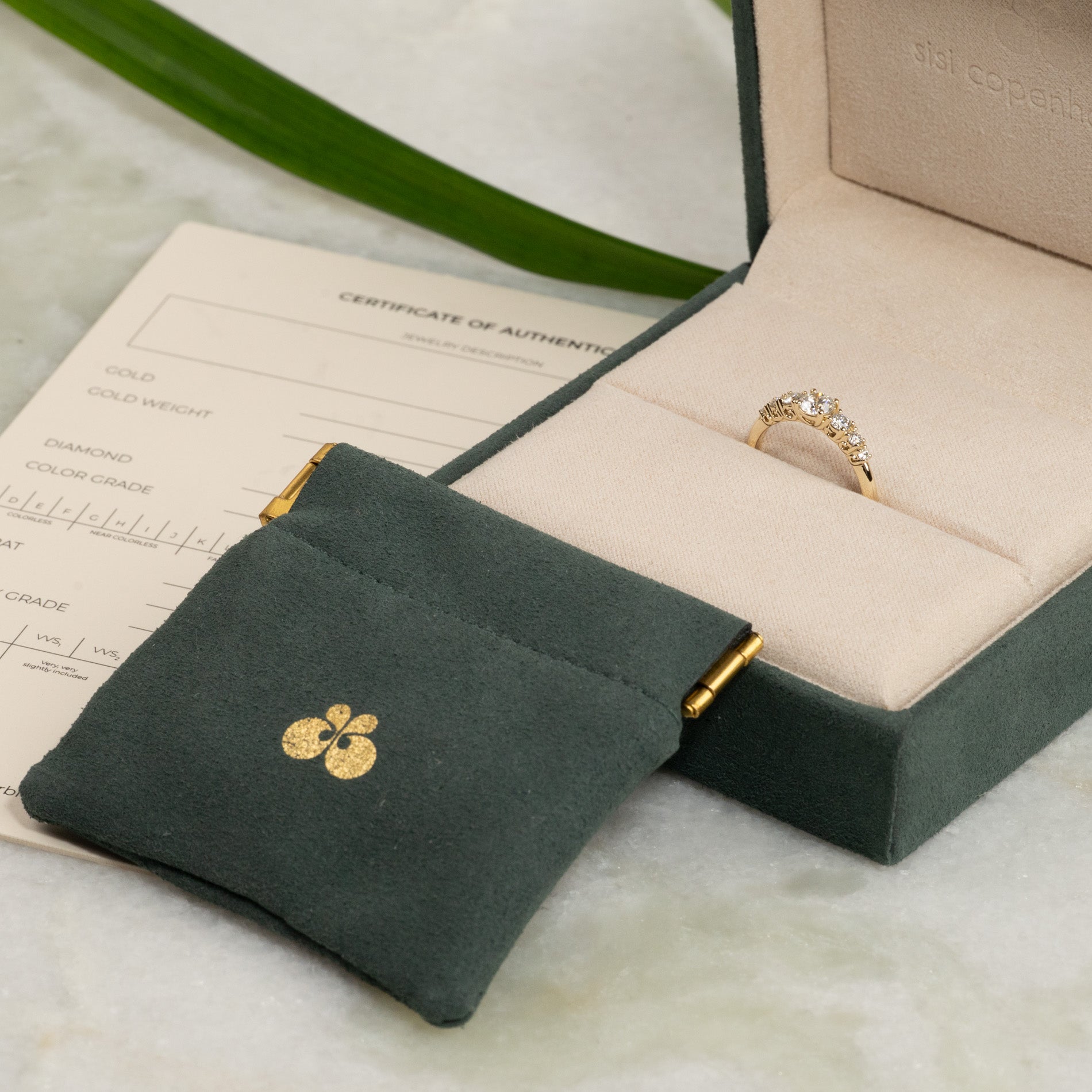 Vi erbjuder en fin lösning: Vi skickar den vackra presentboxen i förväg, fint inslagen, men utan smycket. Tillsammans med boxen skickar vi med ett kort som berättar för den lyckliga mottagaren vad de har att se fram emot. Så snart smycket är färdigt skickas det separat i vår fina smyckesask tillsammans med certifikatet. På så sätt kan du ge en oförglömlig gåva, även om smycket inte är klart på den speciella dagen.