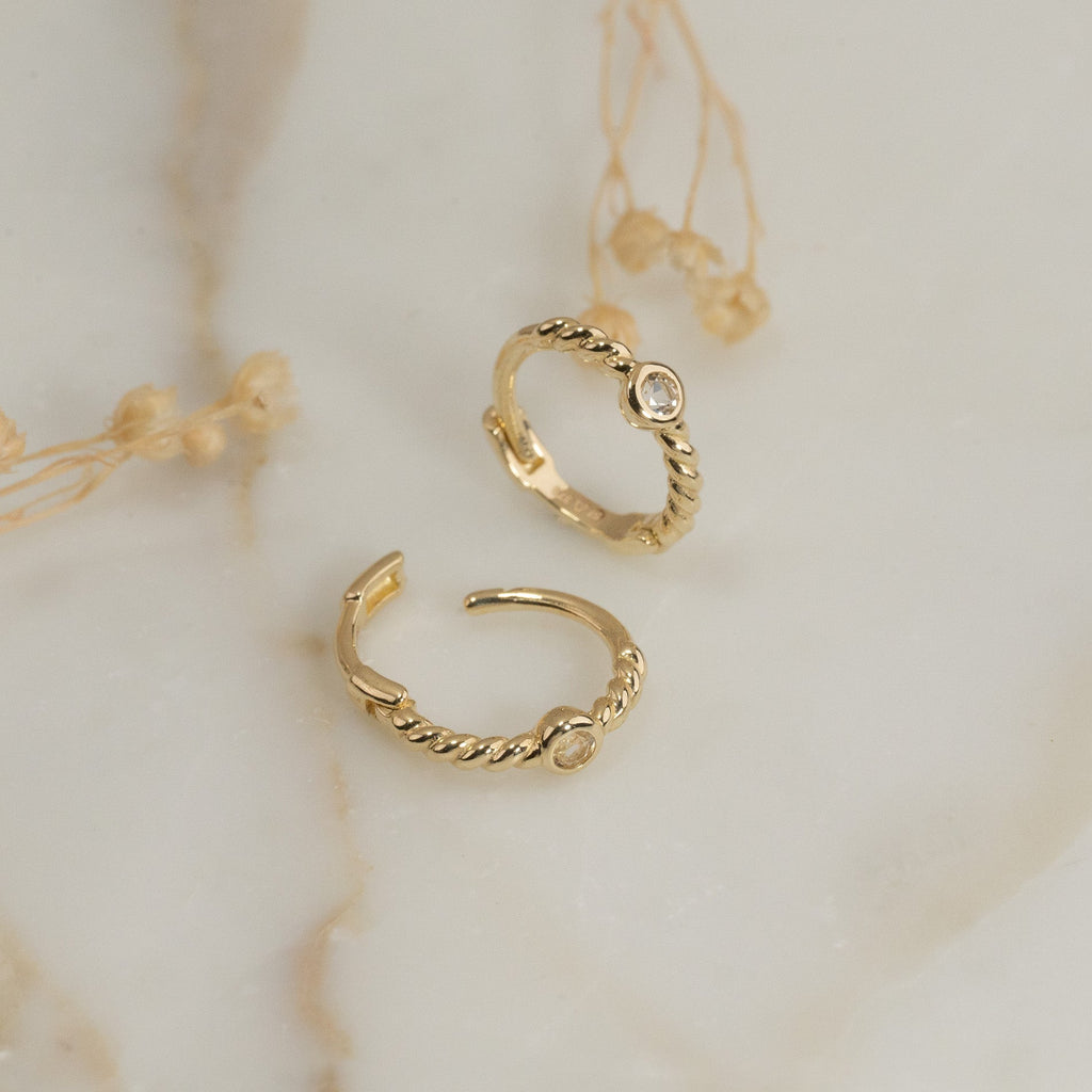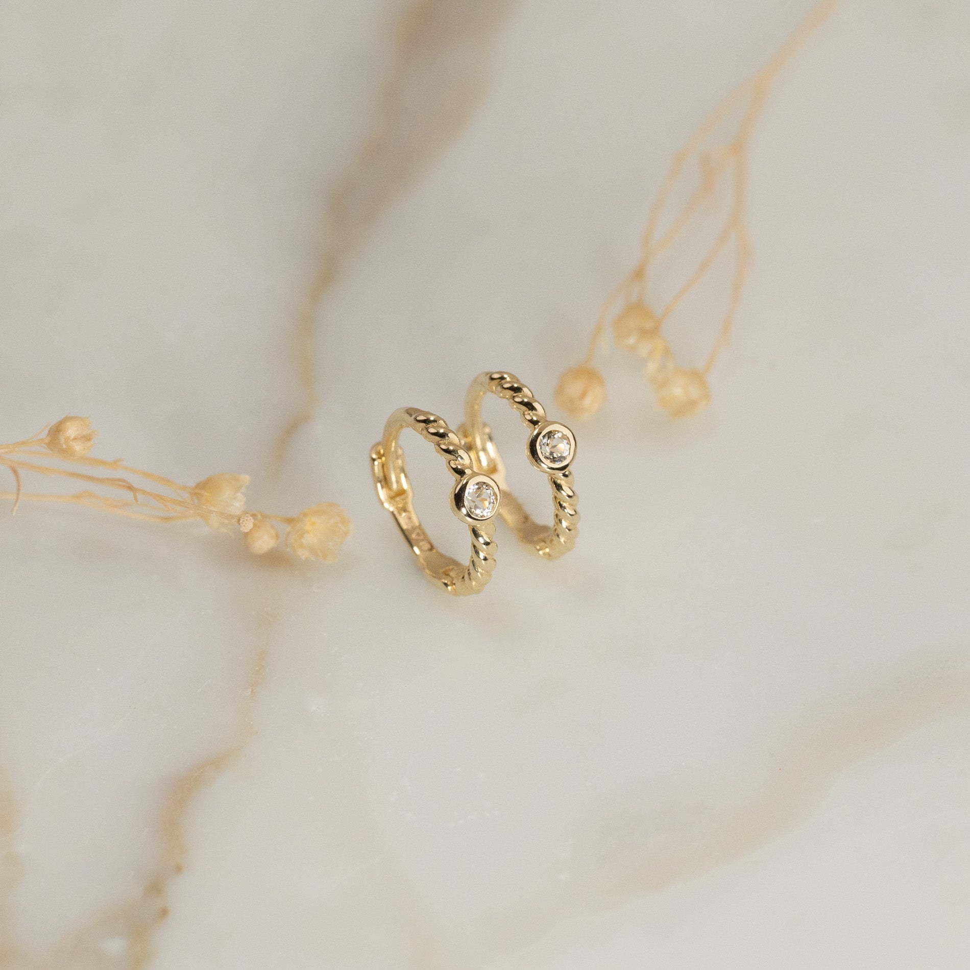 Små guldcreoler i 100% återvunnet massivt 9 karat guld med vit topas