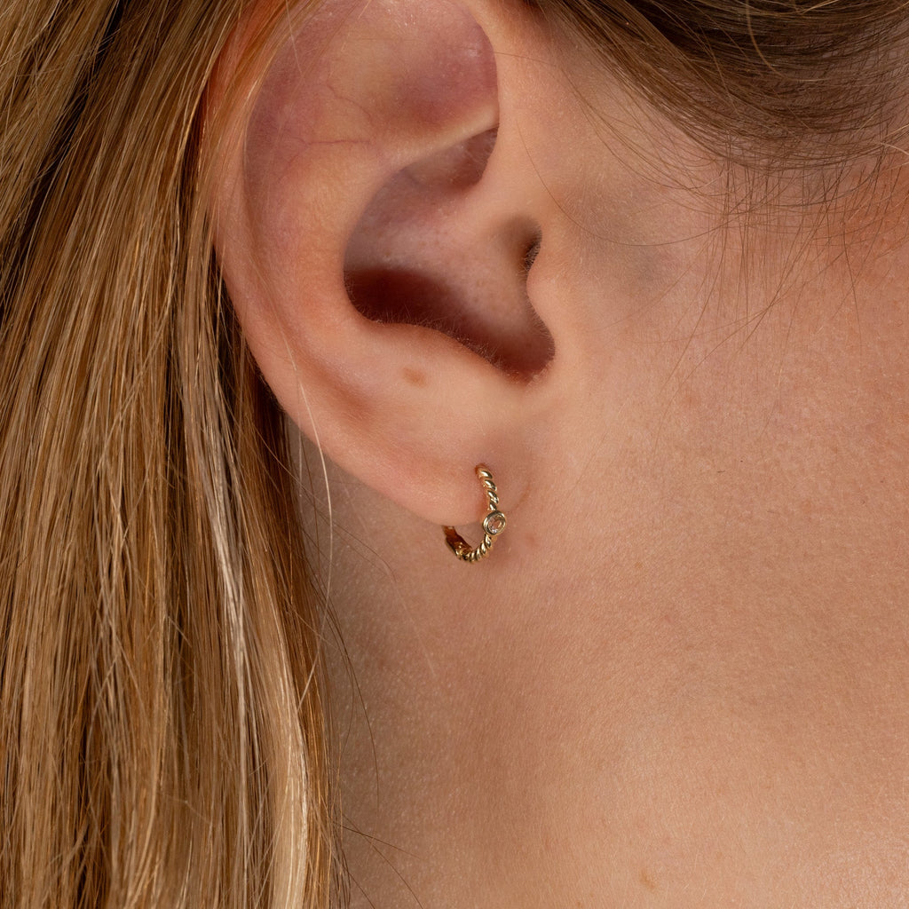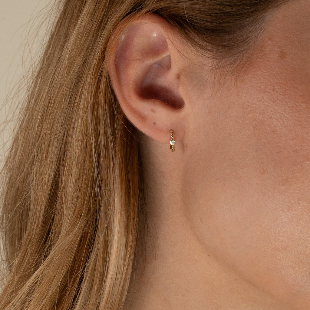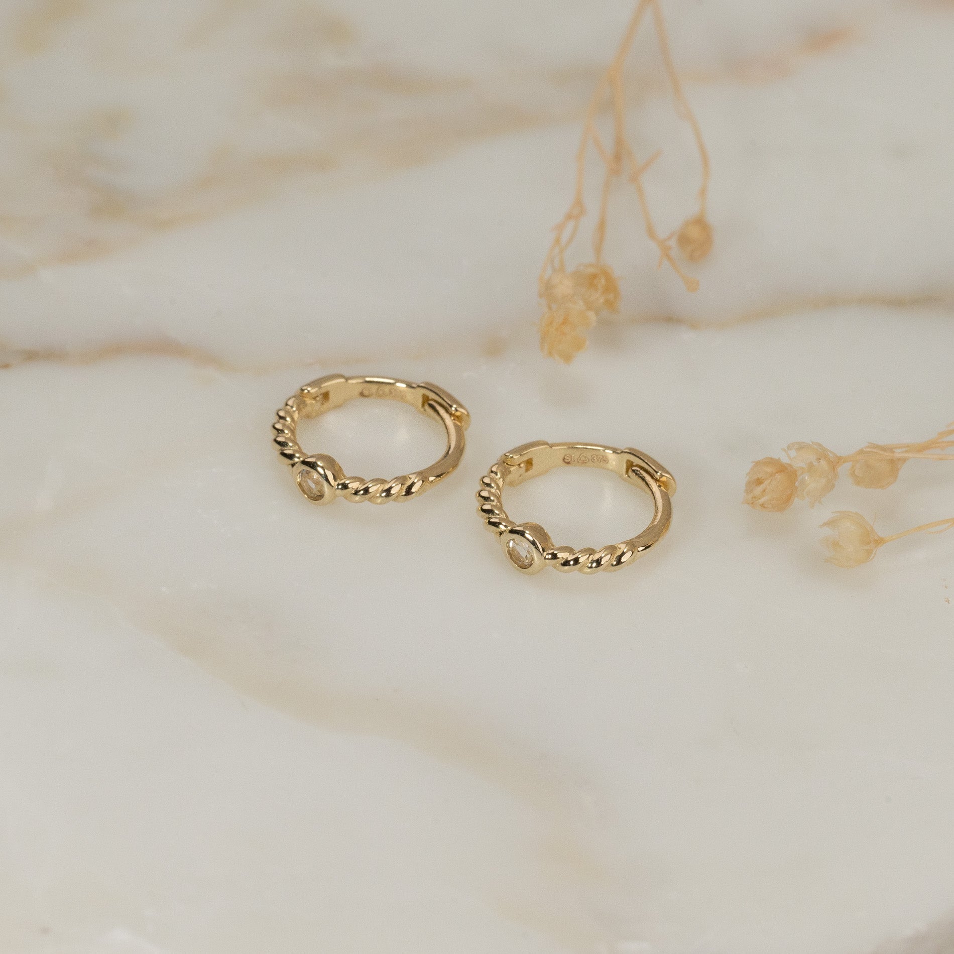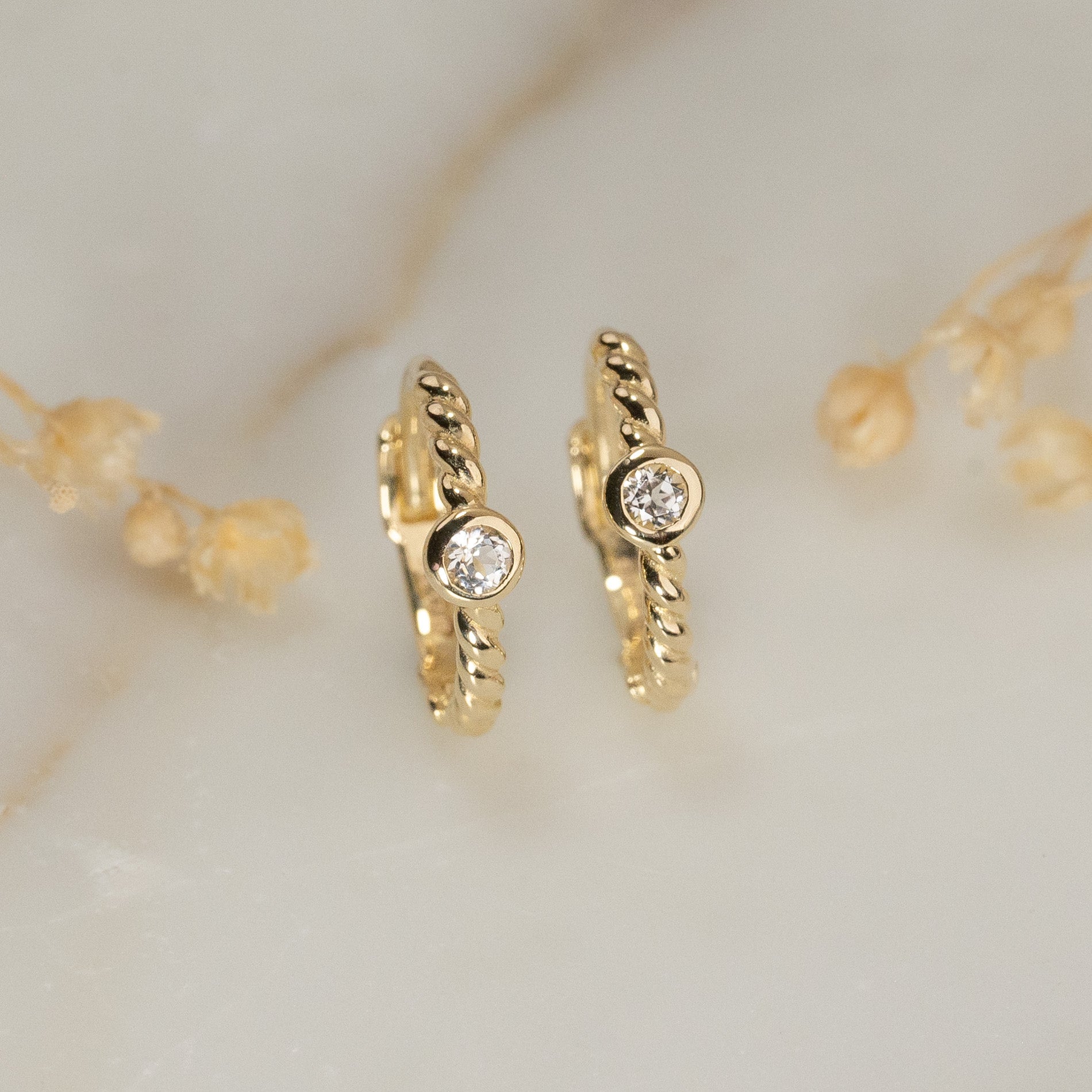 Örhängena har en vriden design med den lilla fina ädelstenen i en bezelfattning i mitten.