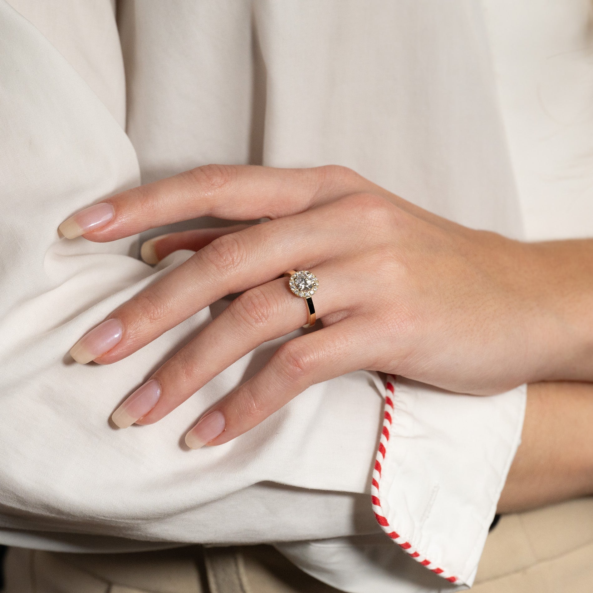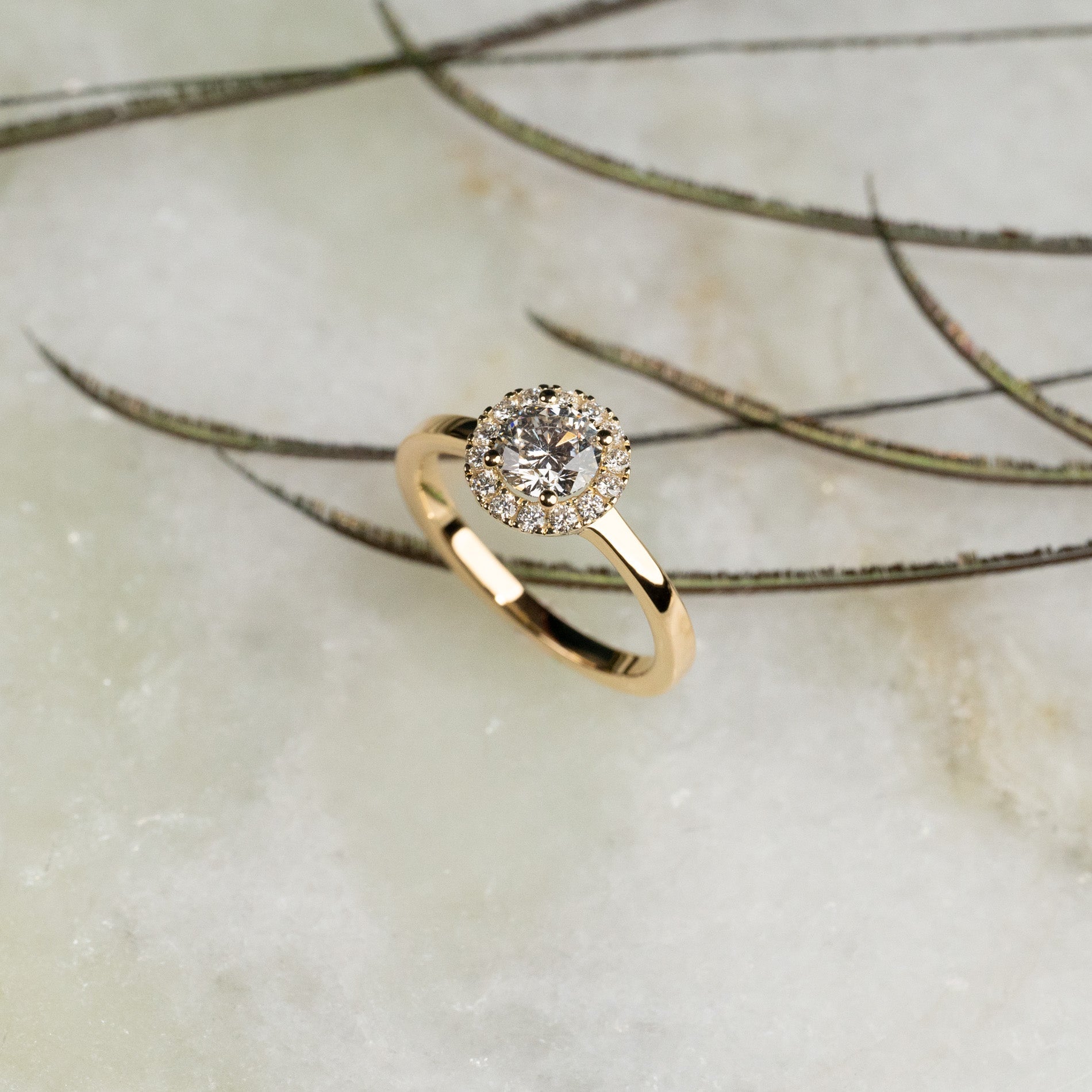 En elegant ring i 14 kt. massivt guld med labbodlade diamanter på totalt 1 ct. Ringen är prydd med en 0,8 ct. briljantslipad diamant, omgiven av en krans med totalt 0,2 ct. diamanter.