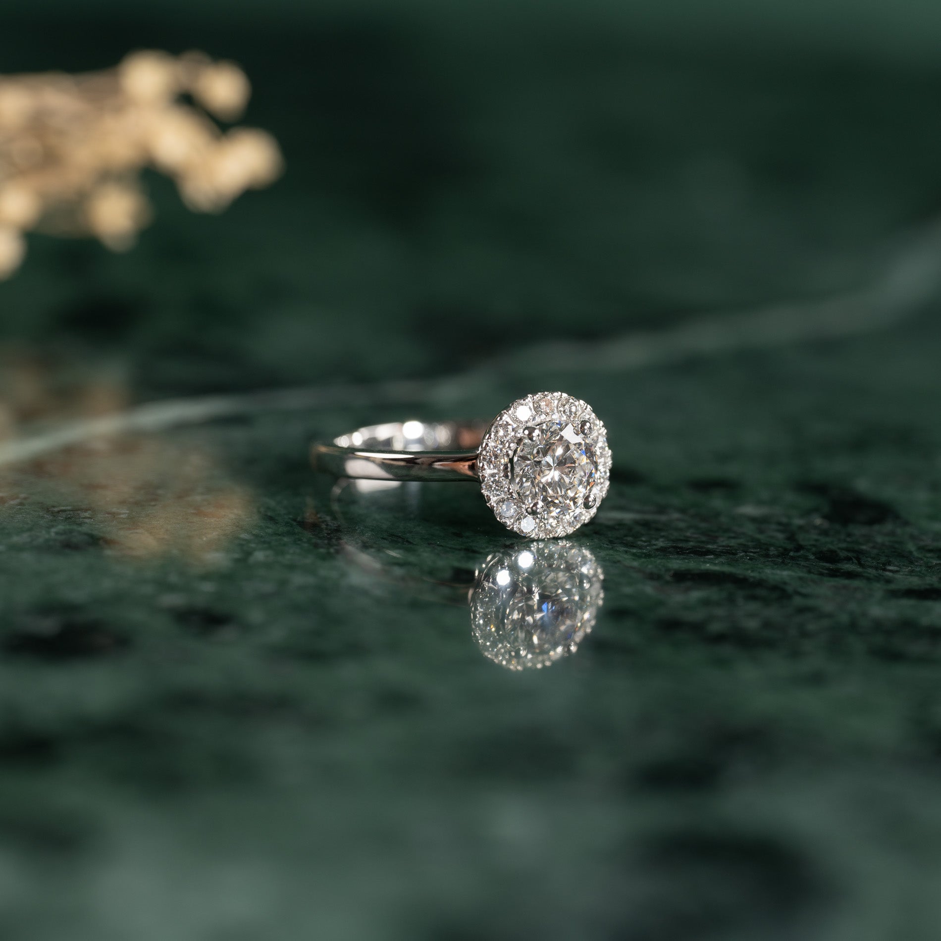 Vacker ring i 14 kt. vitguld med labbodlade diamanter. Ringen består av en 1 ct. diamant, omgiven av en rosett med 0,25 ct diamanter. Sammanlagt har ringen en total caratvikt på 1,25 ct.