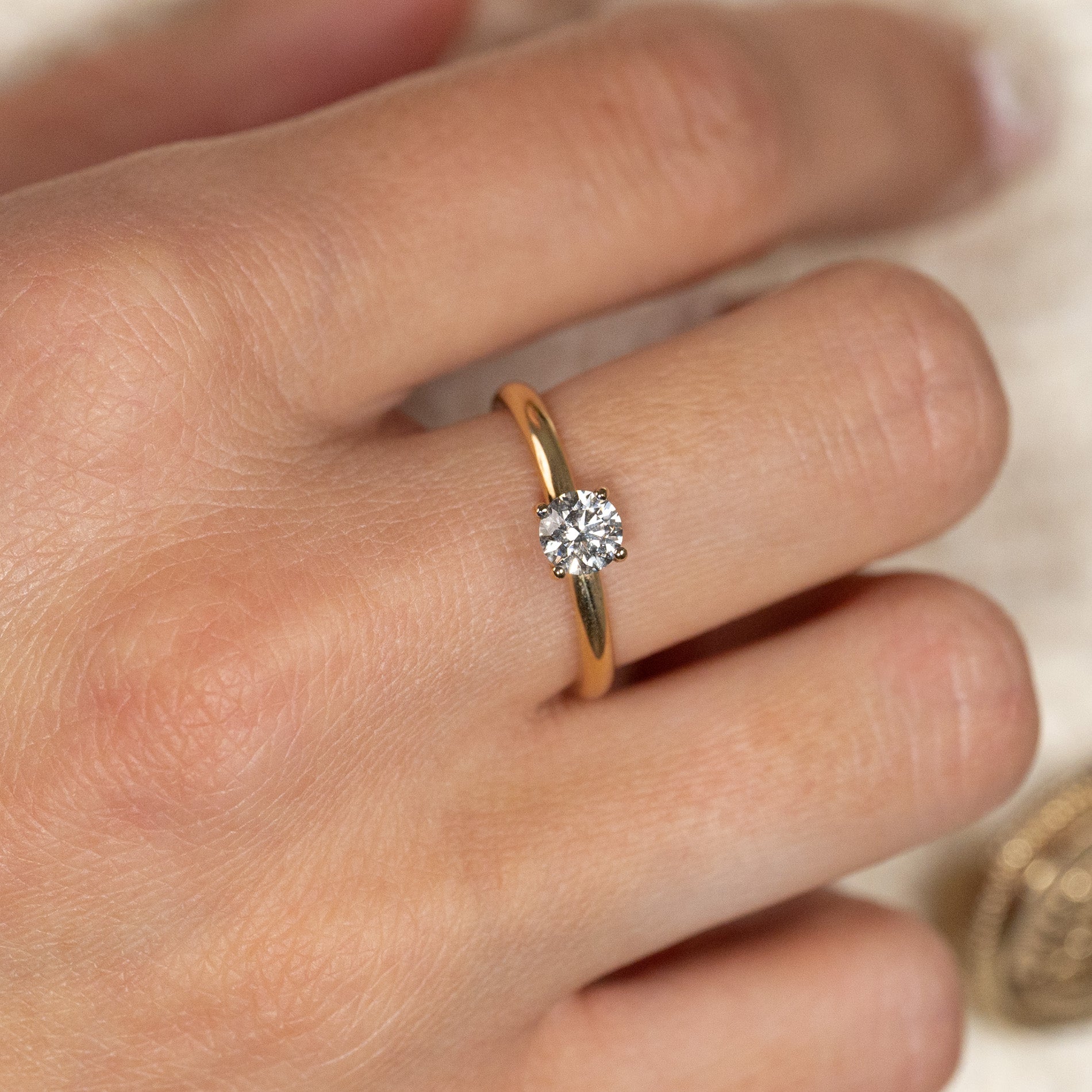 Vår solitärring består av en enkel diamant. Den briljantslipade labbodlade diamanten är fattad i en klassisk basket-fattning, som är vackert höjd över den minimalistiska ringskenan.