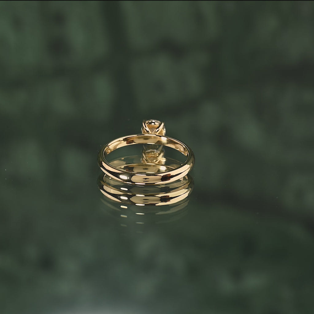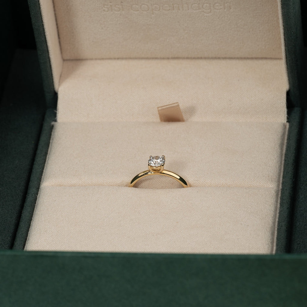 Ringen är i 14 karat massivt guld med en labbodlad diamant i färgen E/F (River) och klarhet VVS. Smycket är skapt med omtanke; diamanterna är producerade med bland annat solenergi, och guldet är 100% certifierat återvunnet.