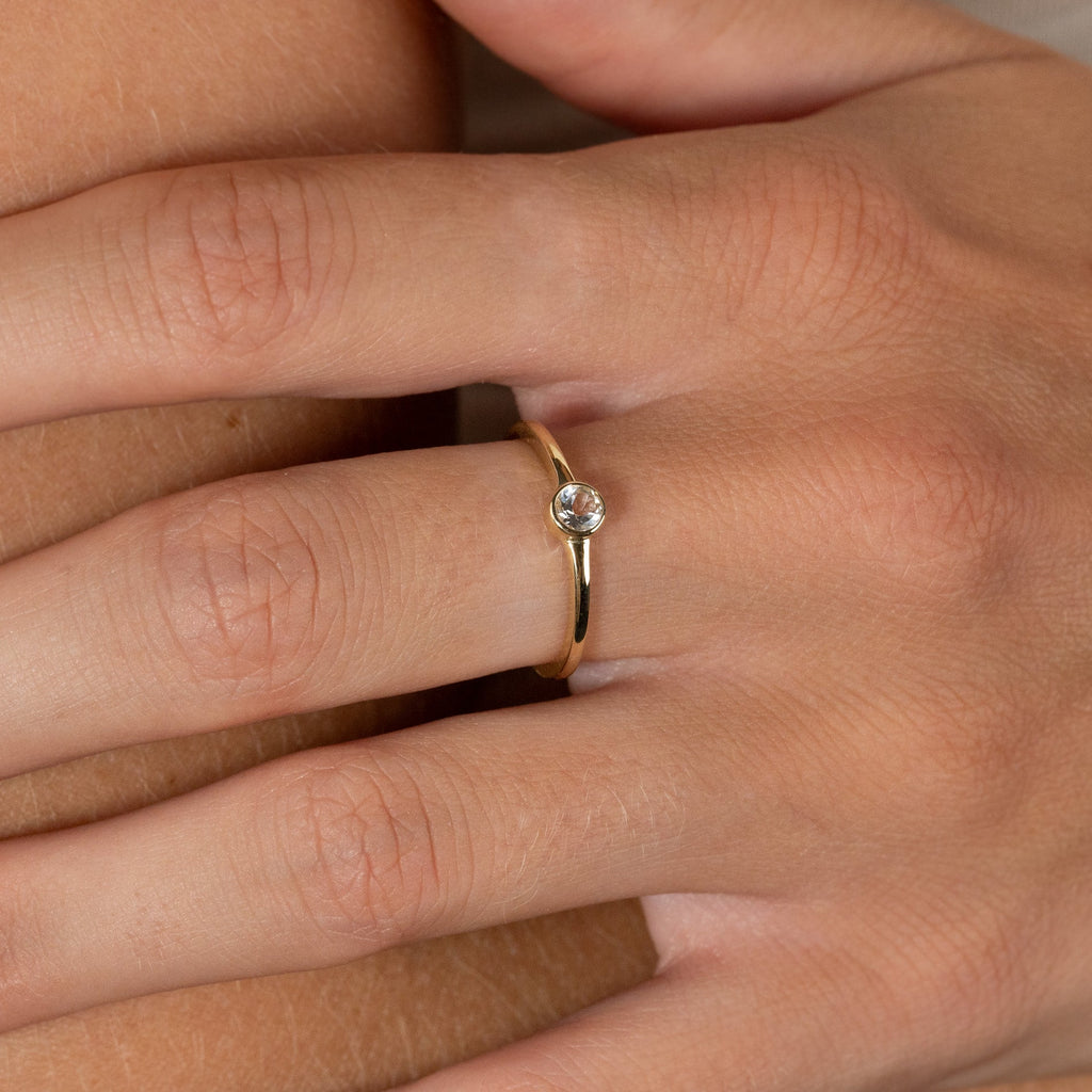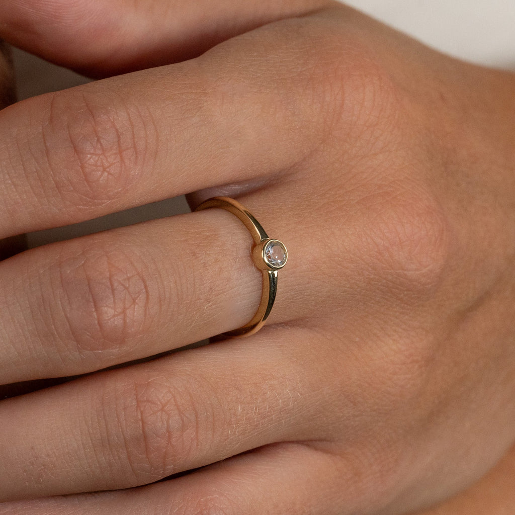 Ring i 100% återvunnet 9 karat massivt guld med rund fasettslipad vit topas i bezel-fattning.