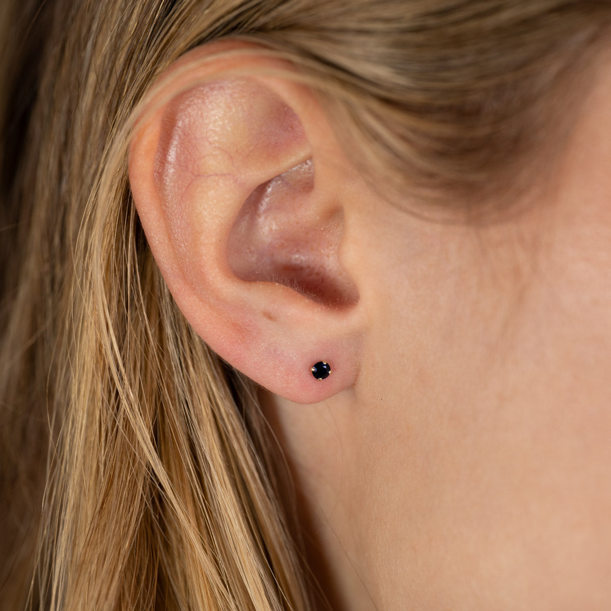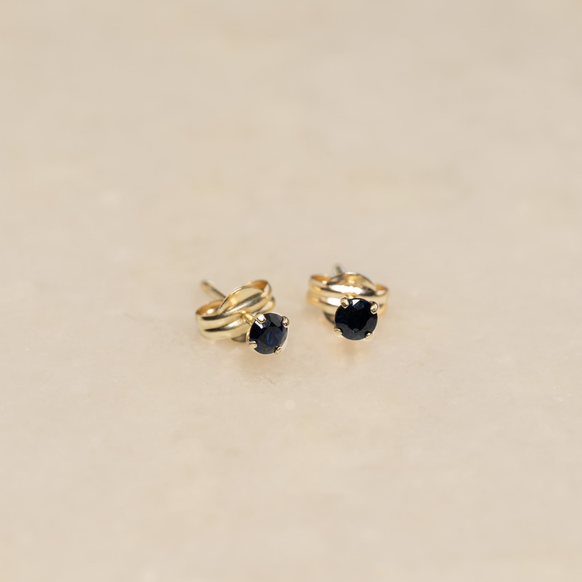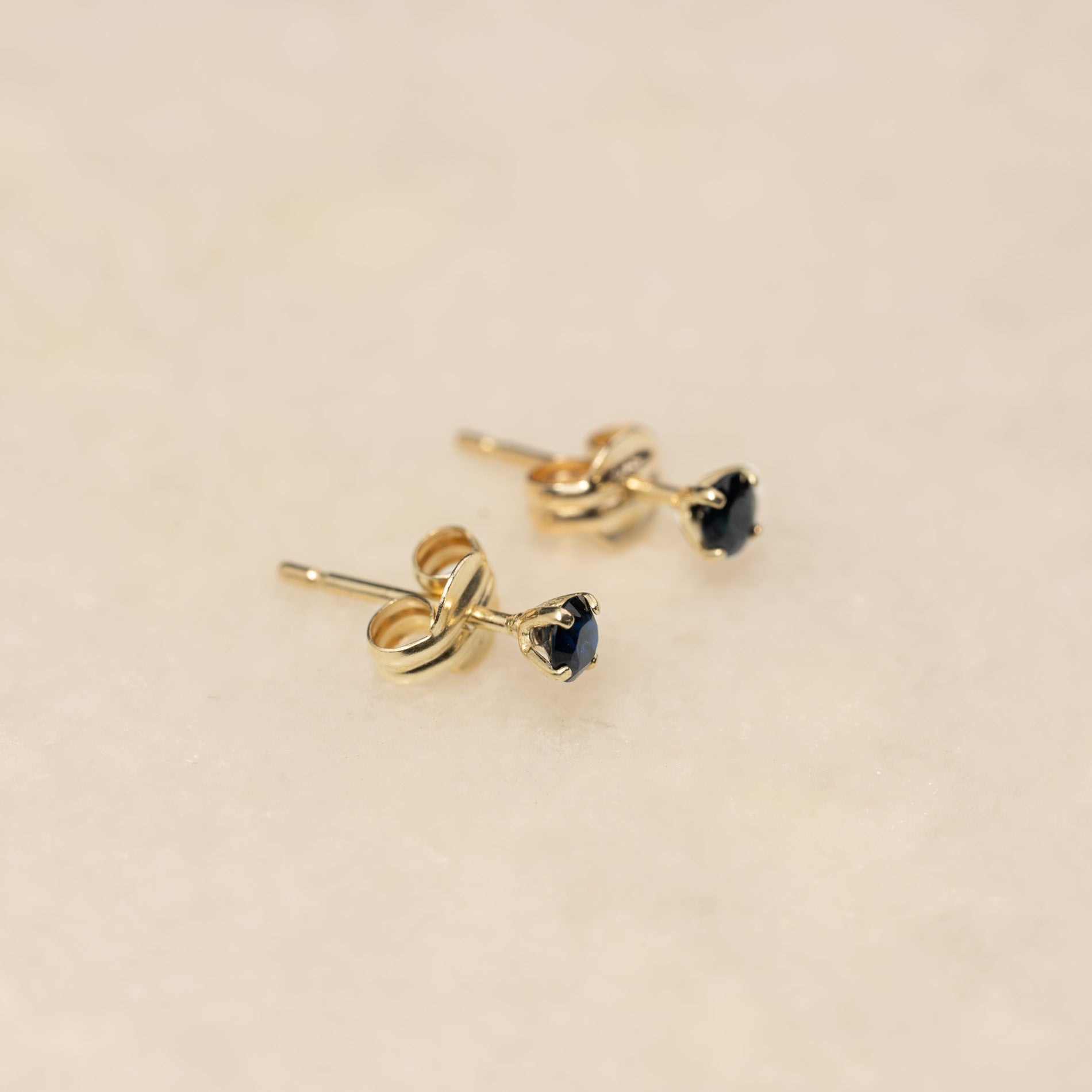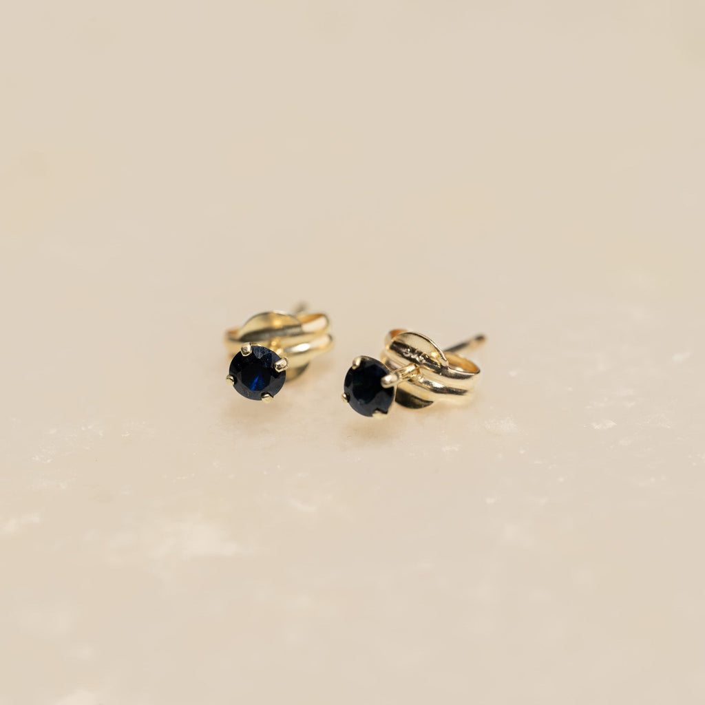 Örhängena är tillverkade i 100% återvunnet 9 karats massivt guld. Dessa örhängen är eleganta och klassiska med en 3 mm fasettslipad djupblå safir som är infattad med en klassisk fattning.