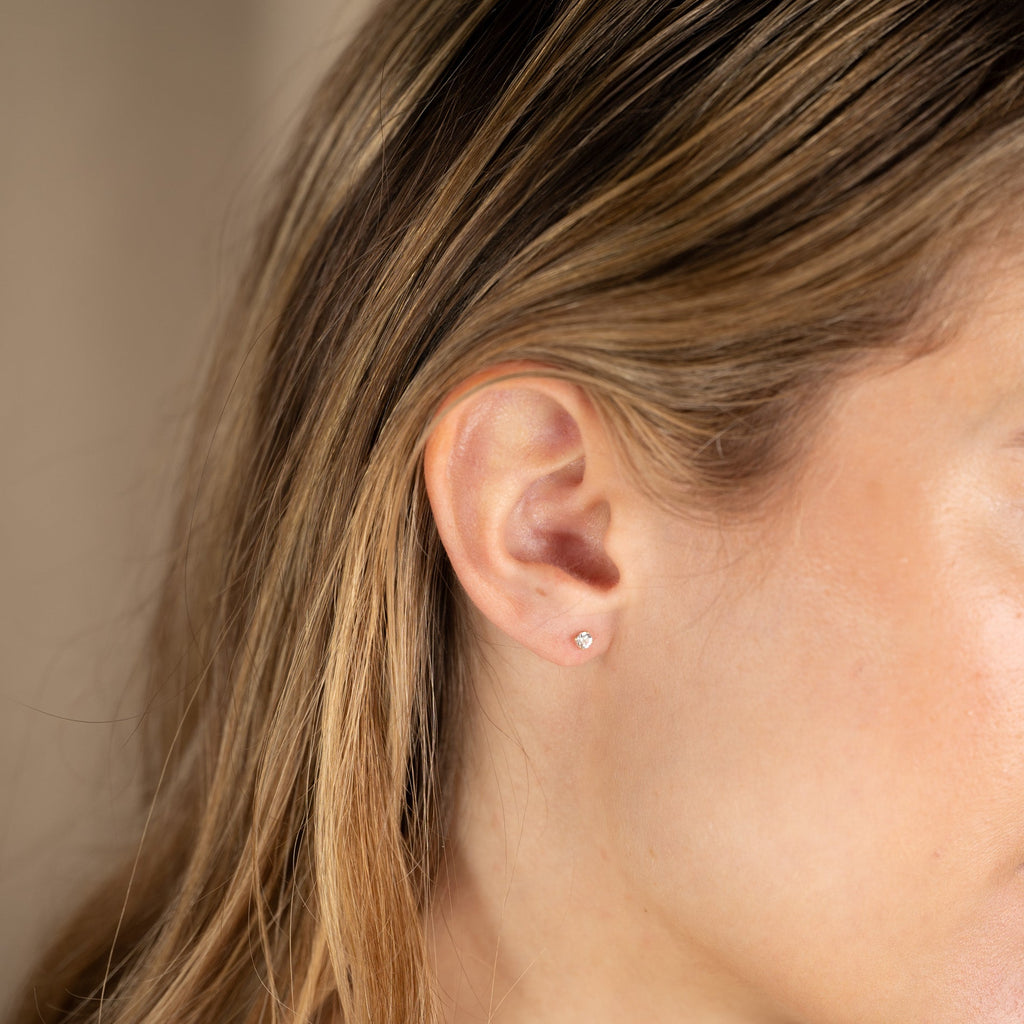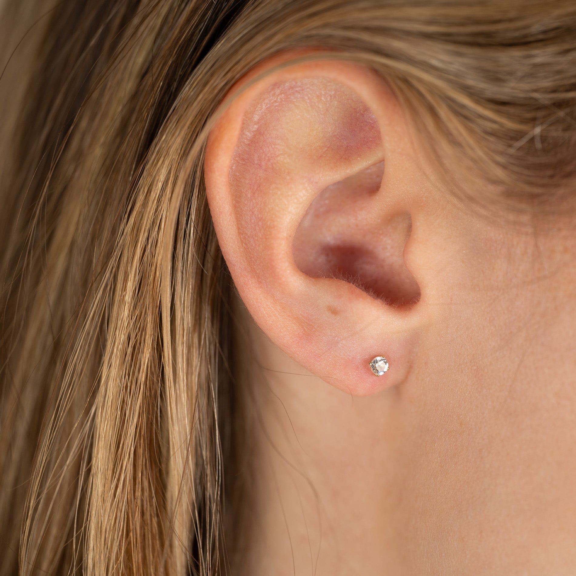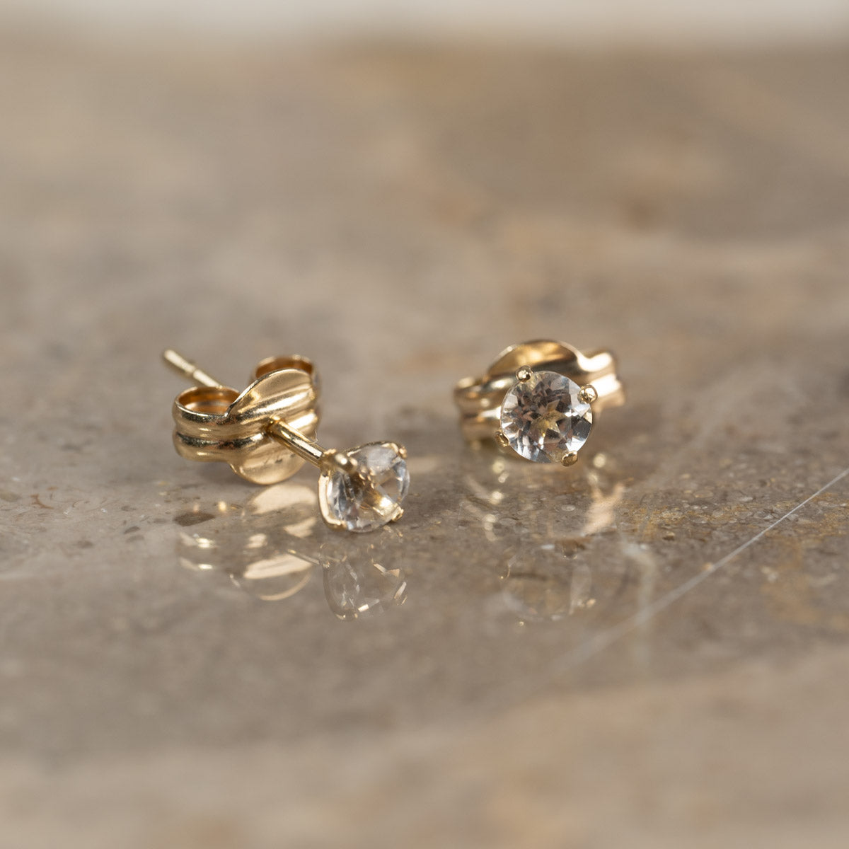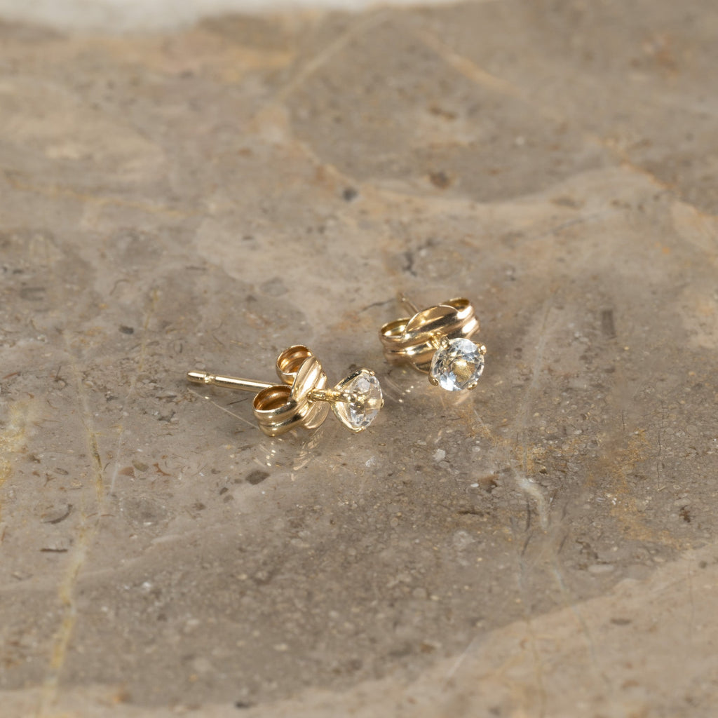 Örhängena är tillverkade av 100% återvunnet 9 karats massivt guld. Dessa örhängen är fina och klassiska med en fasettslipad vit topas som är infattad med en klassisk griphängning. Stenen har en diameter på 3 mm.