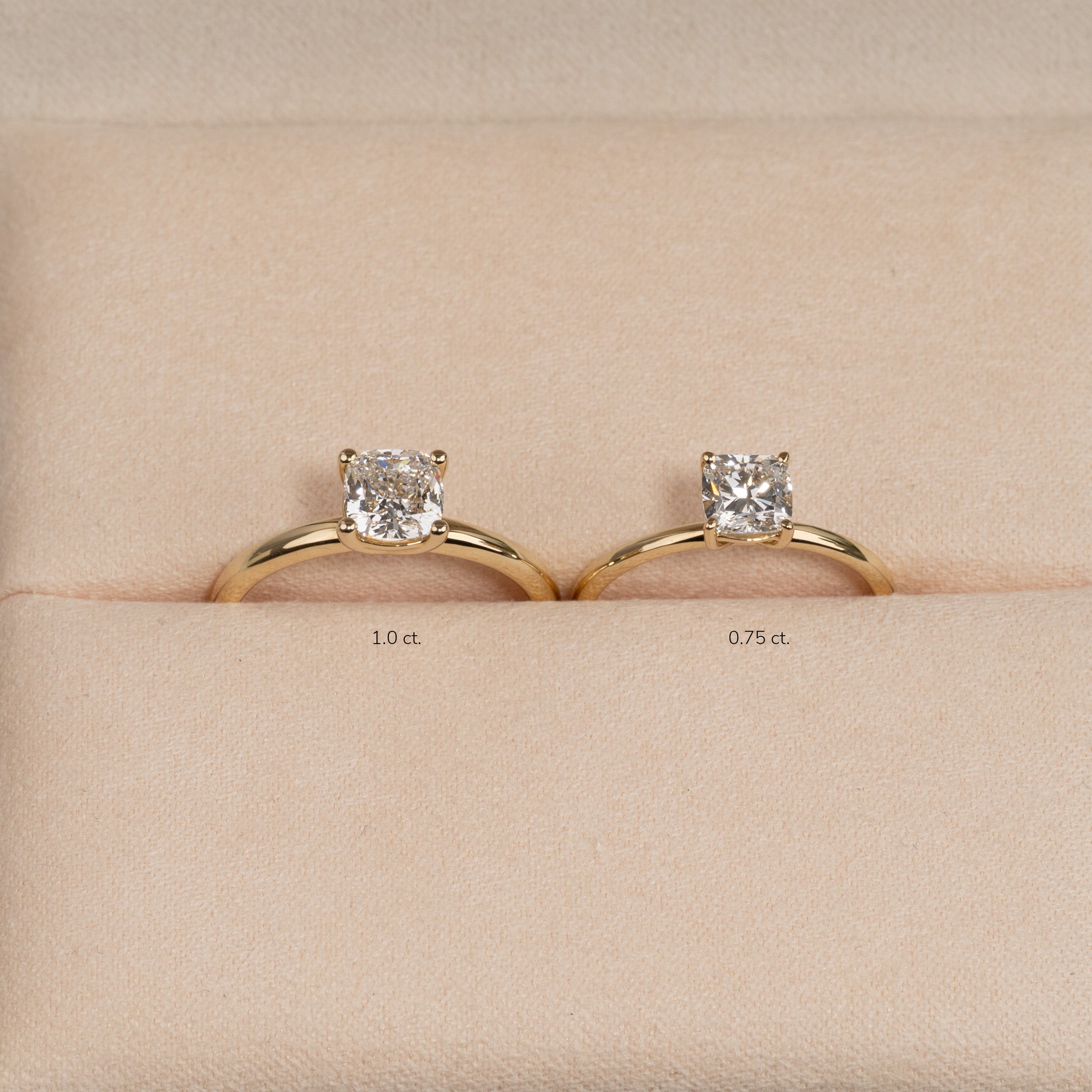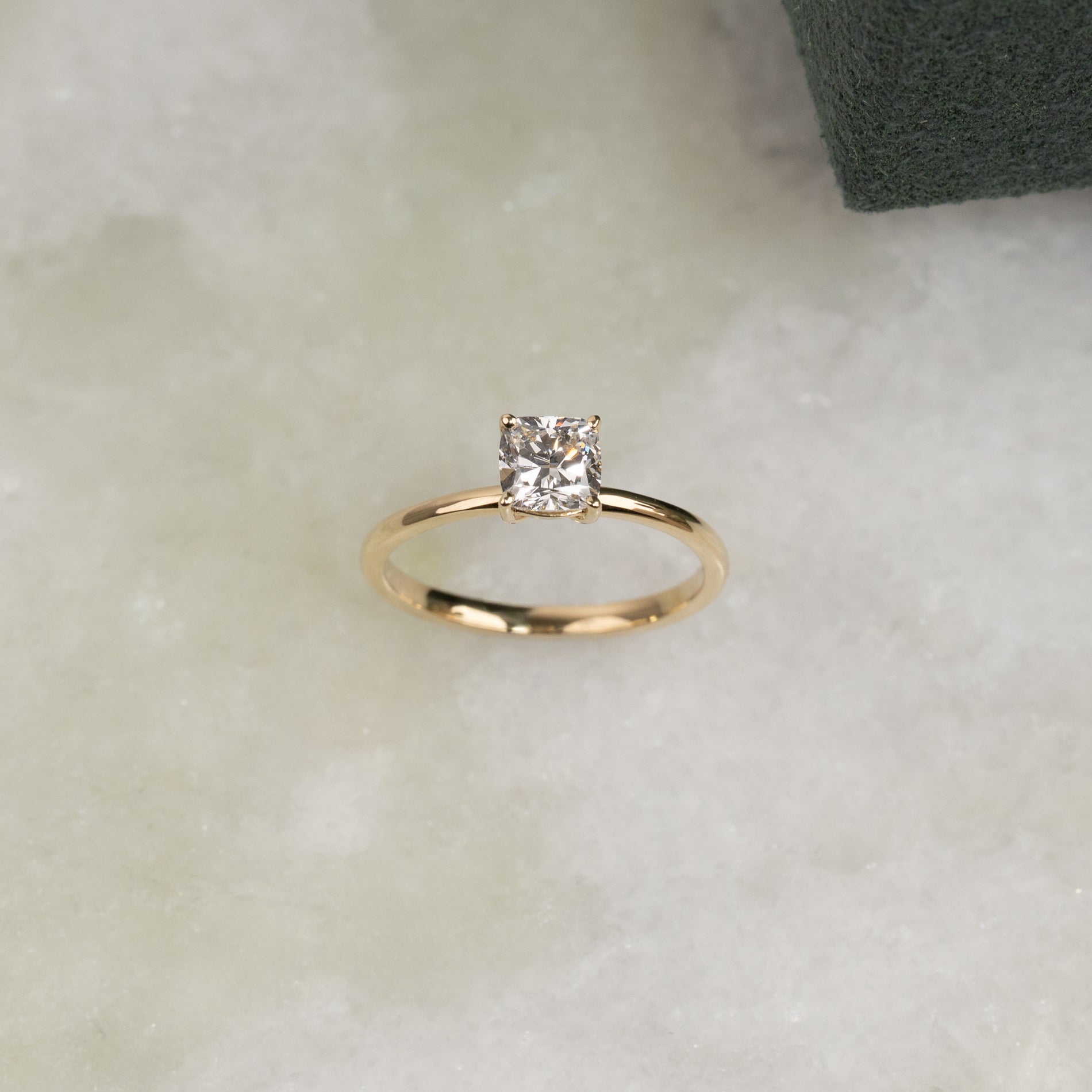Solitärring i 14 kt guld med 0,75 ct cushion-cut labbodlad diamant