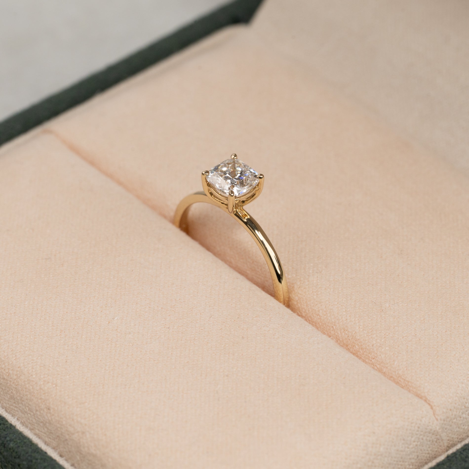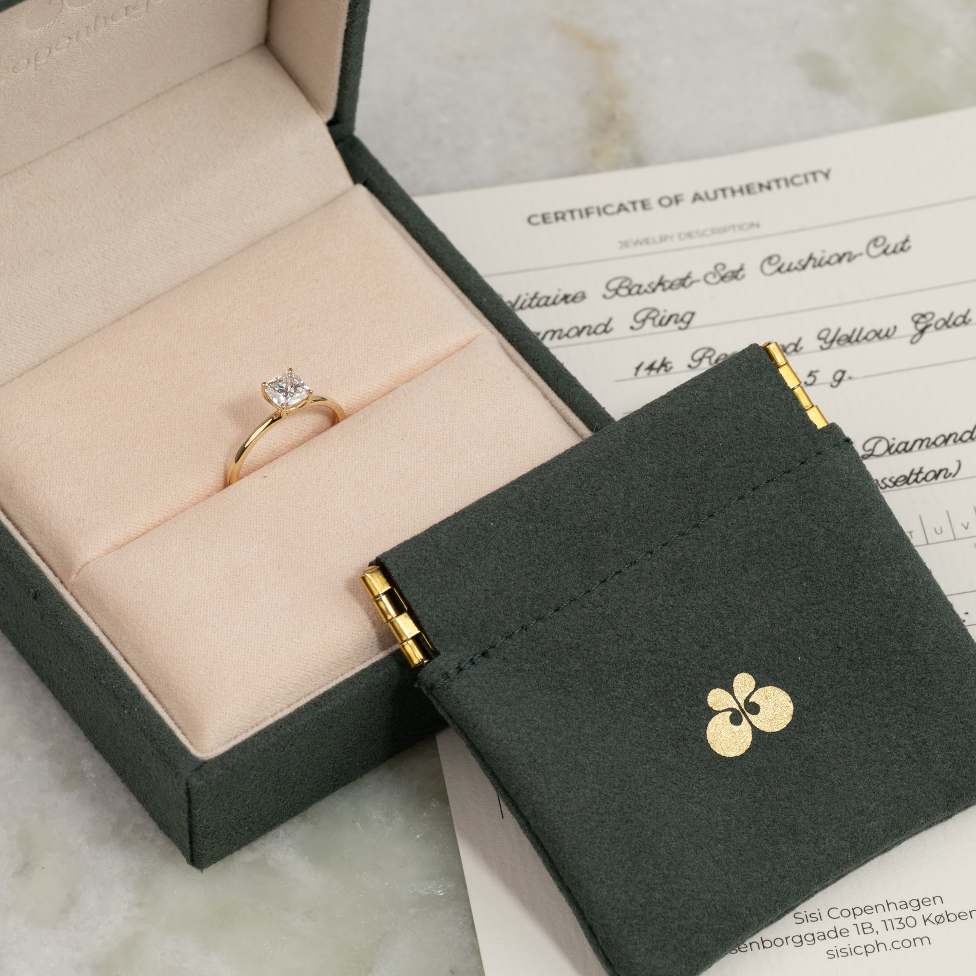 Elegant solitärring i 14 karat massivt guld med en 0,75 ct. cushion-cut labbodlad diamant. Diamanten är infattad med en klassisk basket-infattning. Cushion-slipningen blandar en fyrkantig form med mjuka linjer - likt en kudde. Kombinationen av den minimalistiska ringskenan, den klassiska basket-infattningen och den något speciella cushion-slipningen ger en vacker och tidlös ring med både moderna och klassiska referenser. Ringen är den perfekta gåvan till någon man älskar och håller av - eller som den perfekta förlovningsringen.