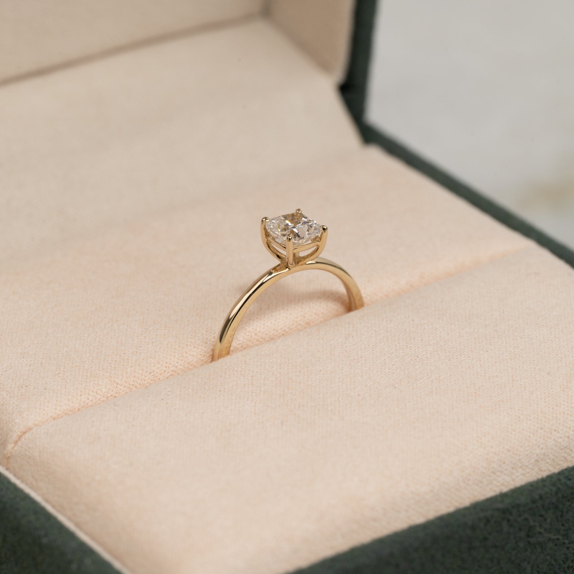Ringen är skapad i 14 karat massivt guld med en 0,75 ct. labbodlad diamant. Diamanten har färg mellan E-F (River) och klarheten VVS. Diamanterna är hållbart framställda med grön energi - främst från solen. Diamanten mäter 5,2 x 5,2 mm. Smycket är skapat med omtanke; diamanterna är tillverkade med bland annat solenergi, och guldet är 100% certifierat återvunnet.