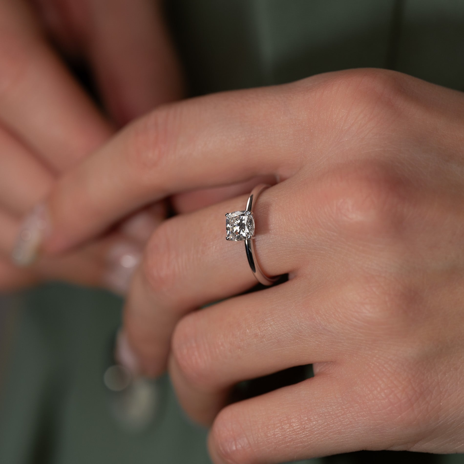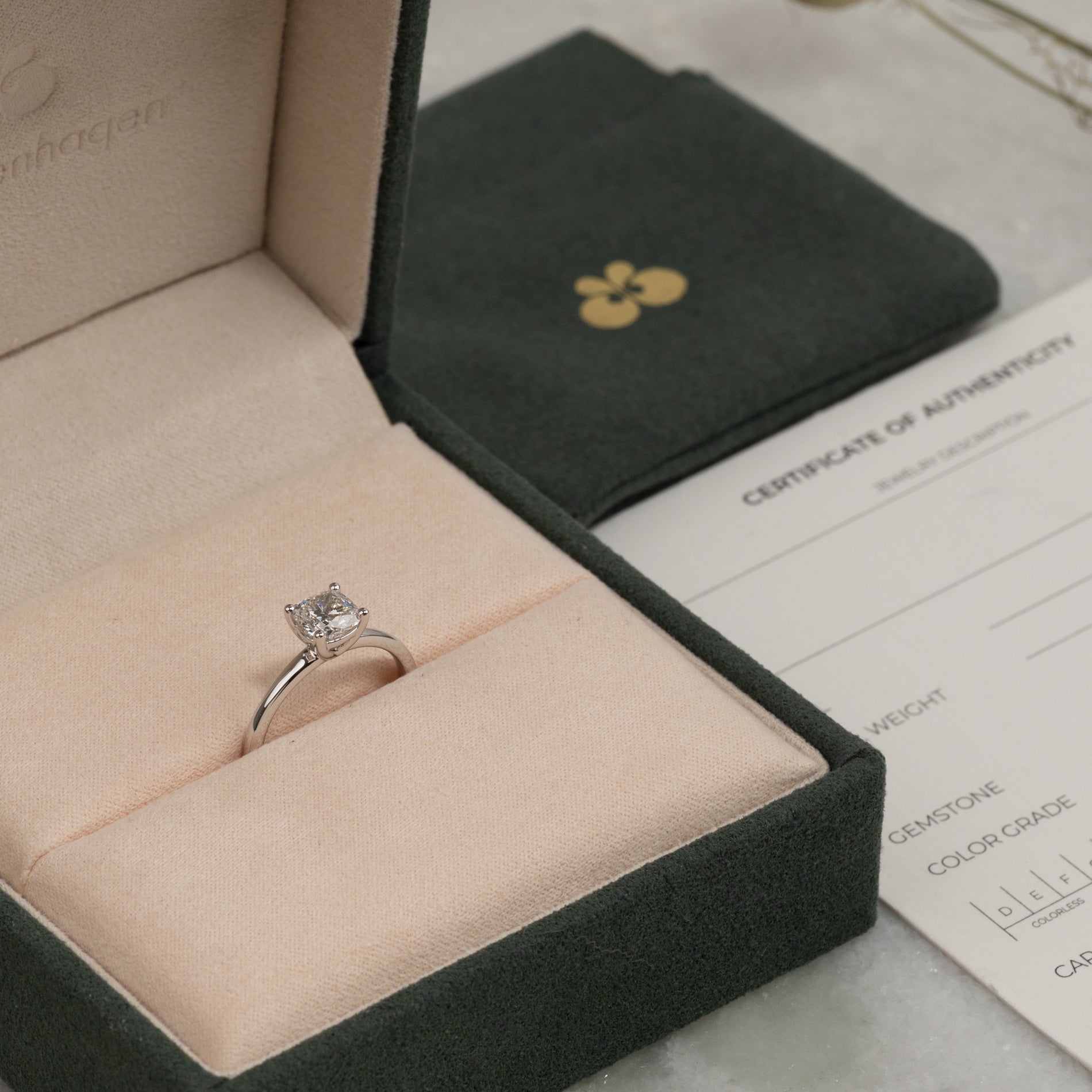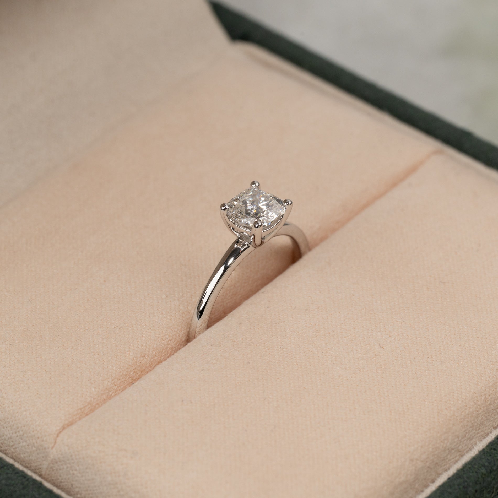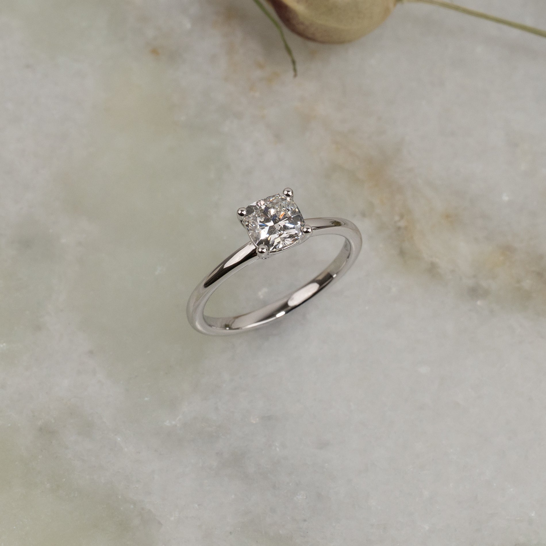 Elegant solitärring i 14 karat vitguld med en 0,95 ct. cushion-cut labbodlad diamant. Diamanten är infattad i en klassisk basket-infattning. Cushion-slipningen kombinerar ett fyrkantigt snitt med mjuka former- likt en kudde, därav sitt namn. Den minimalistiska ringskenan, tillsammans med den klassiska basket-infattningen och den unika cushion-slipningen skapar en tidlös och vacker ring. Ringen är perfekta som gåva till någon du älskar och håller kär, eller den perfekta förlovningsringen.
