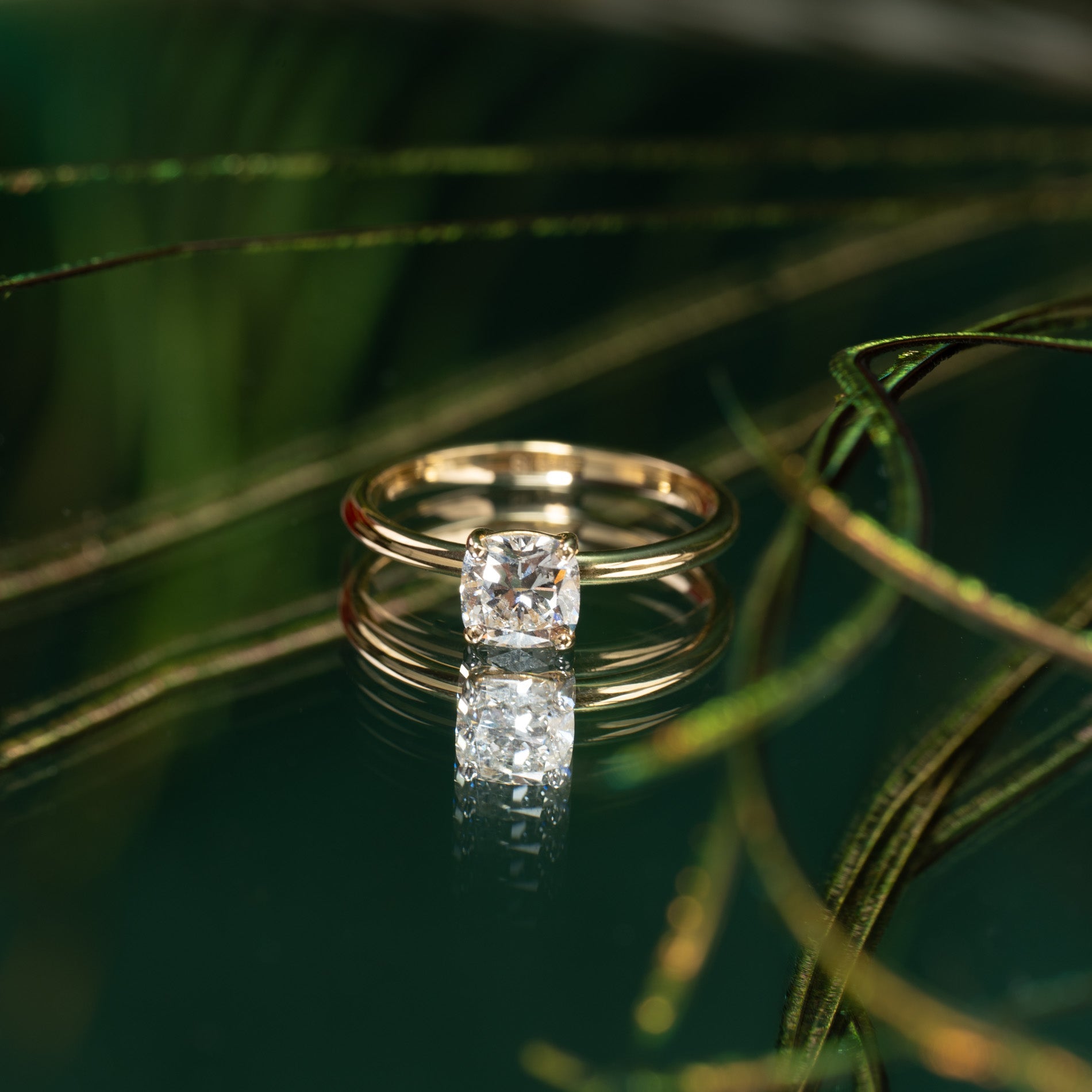 Solitärring i 14 kt guld med 0,95ct cushion-cut labbodlad diamant