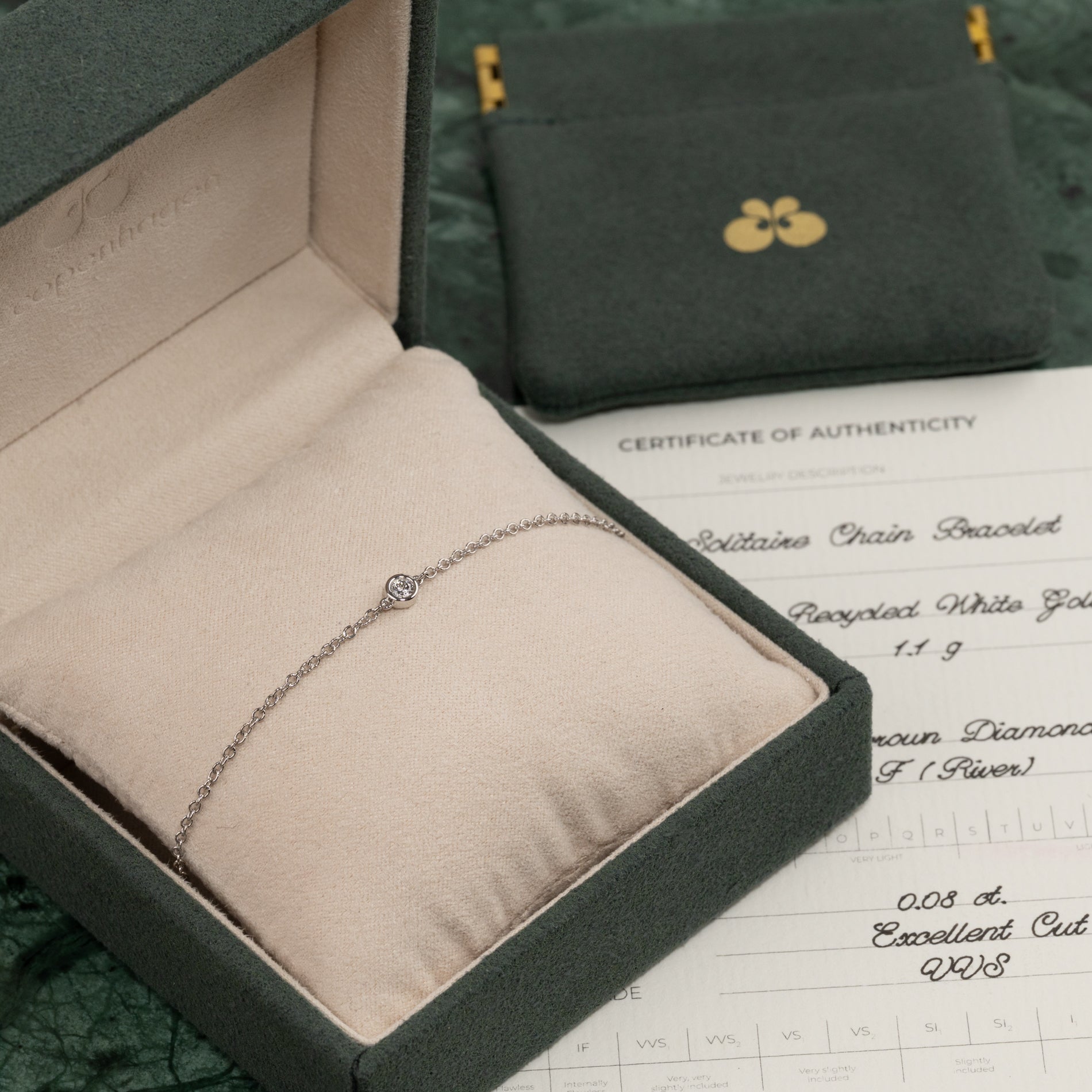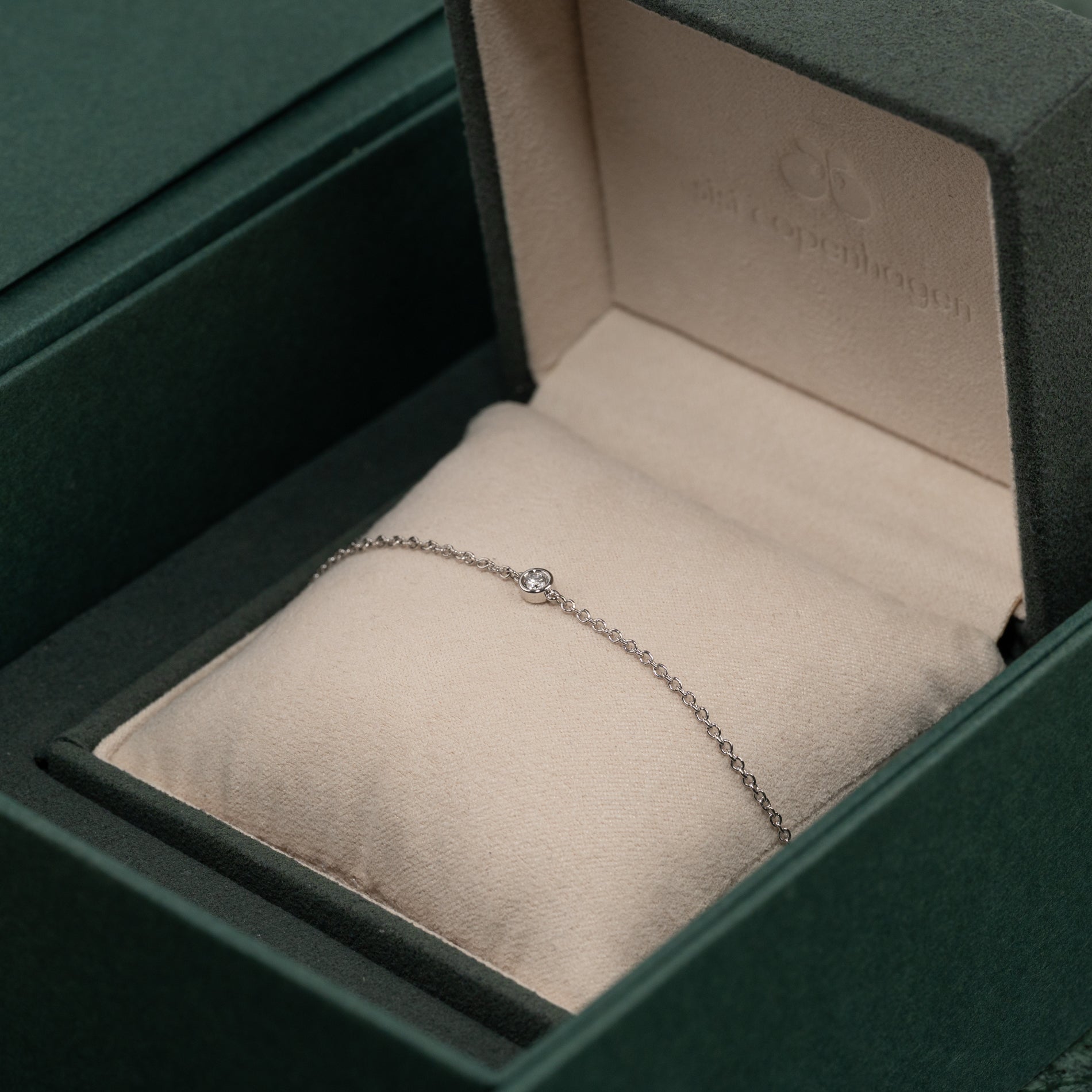 Armbandet är tillverkat i 14 kt. massivt vitguld och har en 0,08 ct. labbodlad diamant. Diamanten har färgen E/F (River) och klarheten VVS. Smycket är skapat med omtanke; diamanten är bland annat framställd med solenergi och guldet är 100 % certifierat återvunnet.