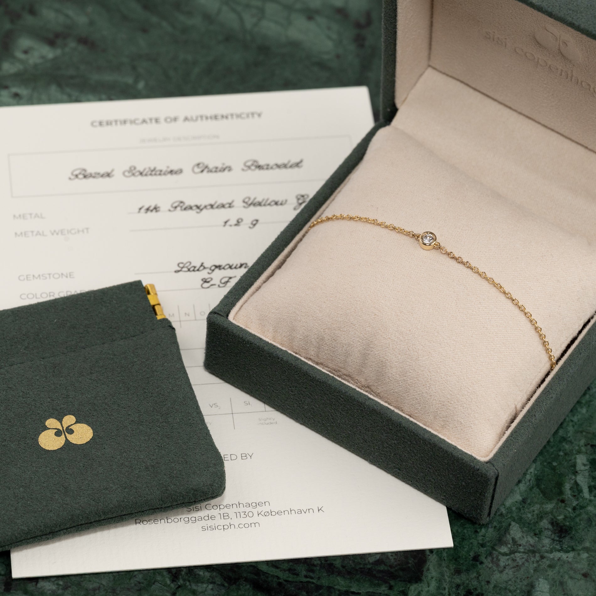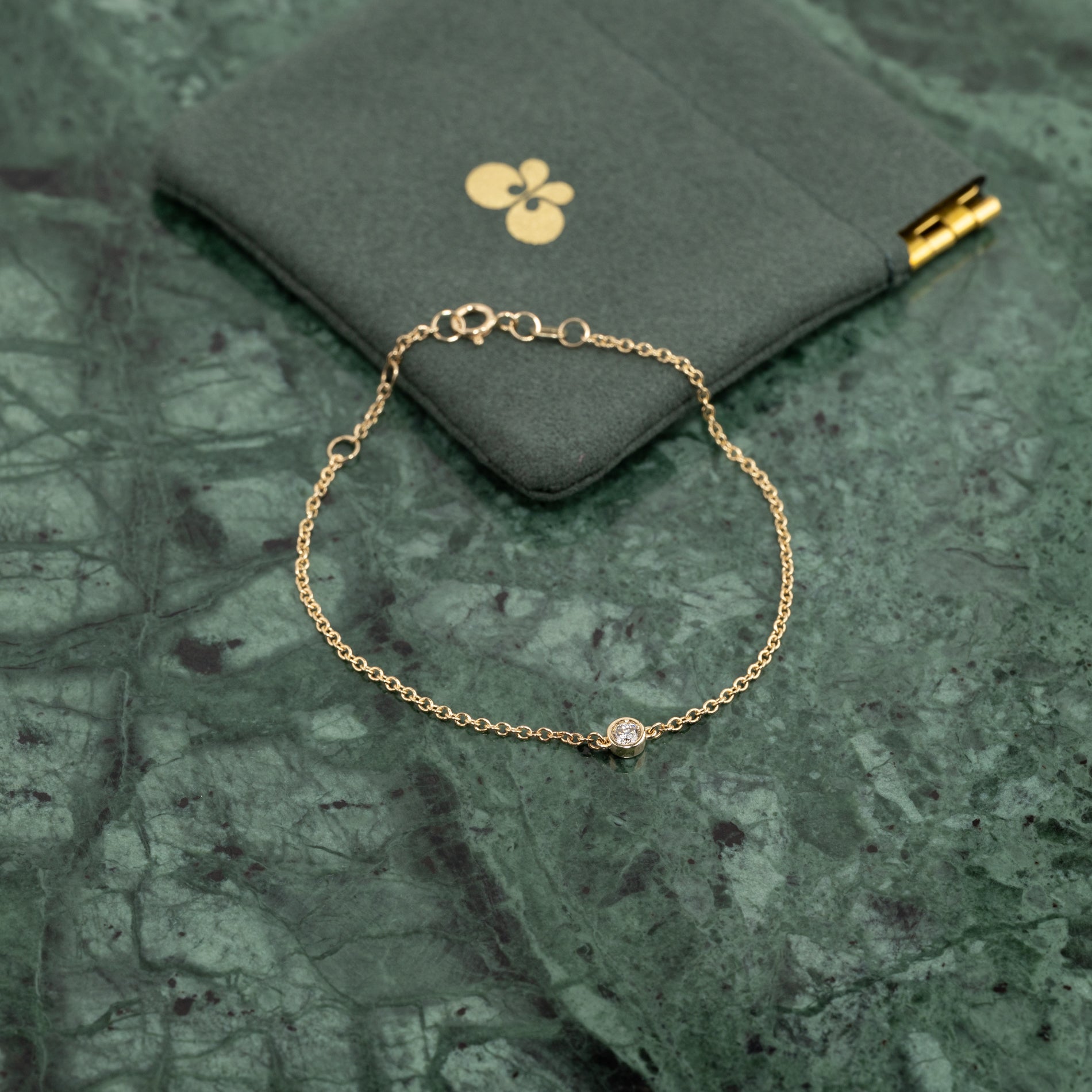 Armbandet är tillverkat i 14 kt. massivt guld och har en 0,08 ct labbodlad diamant. Diamanten har färgen E/F (River) och klarheten VVS. Smycket är skapat med omtanke; diamanten är bland annat framställd med solenergi och guldet är 100% certifierat återvunnet.