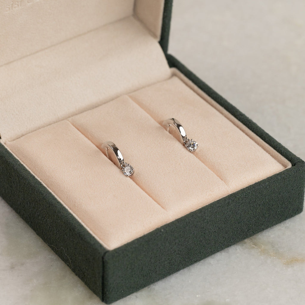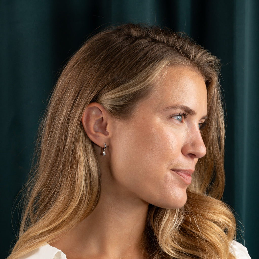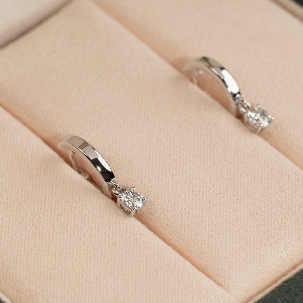Eleganta creoler i 14 karat vitguld med en briljantslipad diamant som hängsmycke. Den tidlösa och moderna designen gör dem perfekta att bära både till vardags och festligare tillfällen.