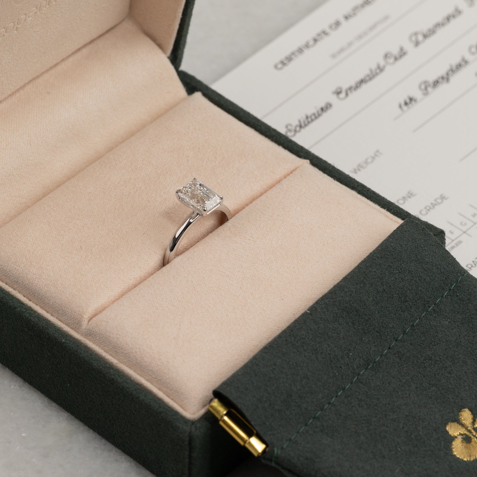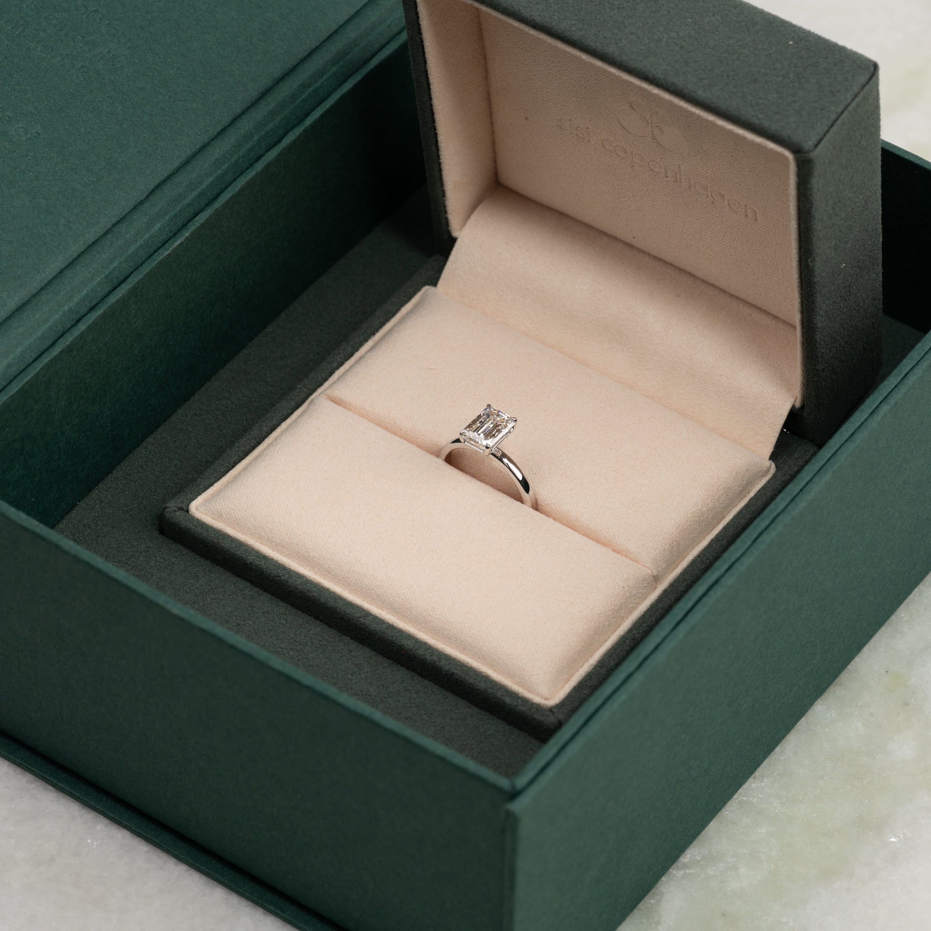 En tidlös ring i 14 karat vitguld med en vacker smaragdslipad labbodlad diamant på 2.0 ct. Diamanten är elegant infattad i en lätt upphöjd basketinfattning som framhäver lystern och den rektangulära trappstegsfasetten.
